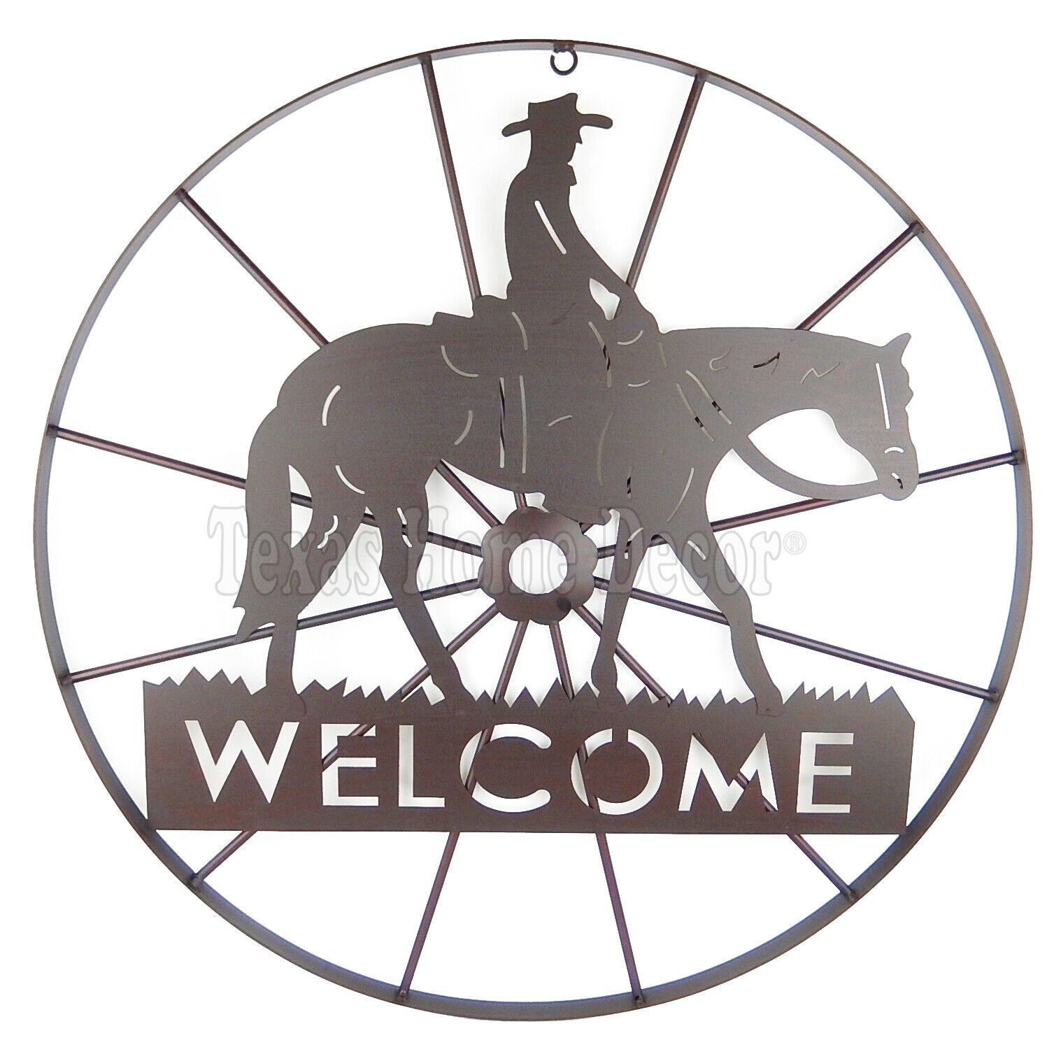 24" Western Metal Welcome Cowboy Riding Horse Wagon Wheel Wall Plaque Sign