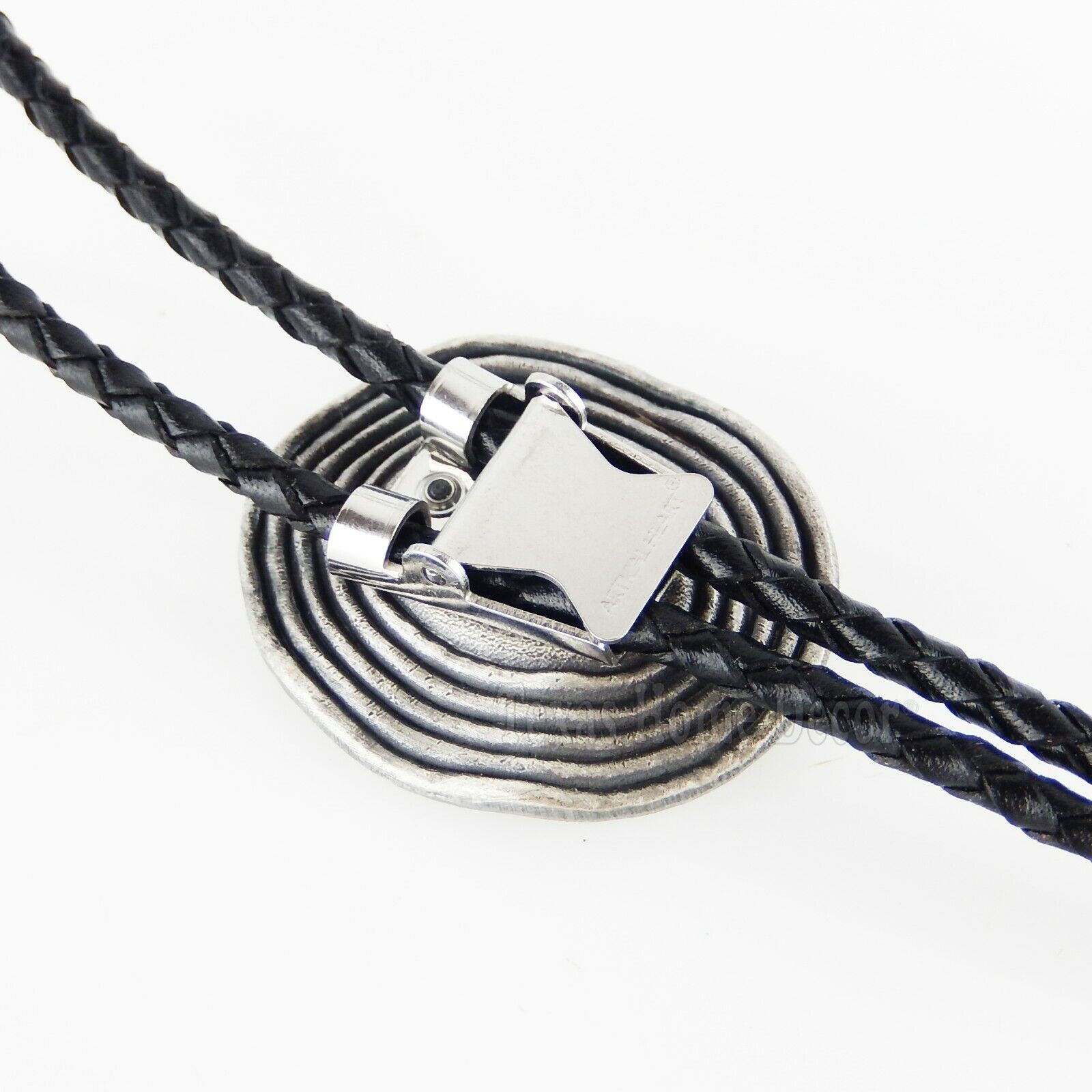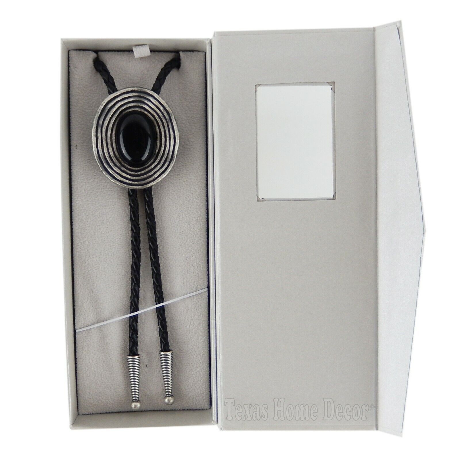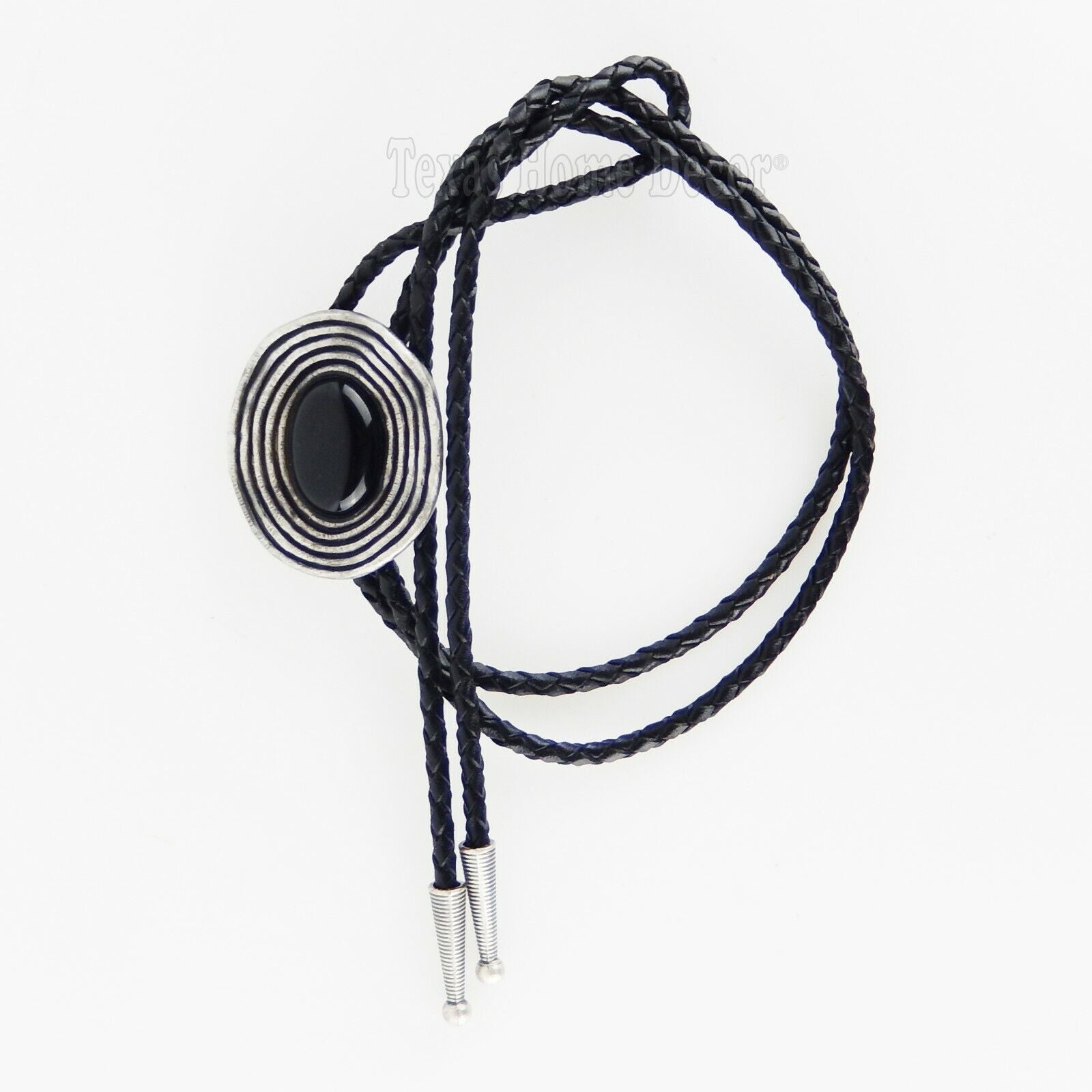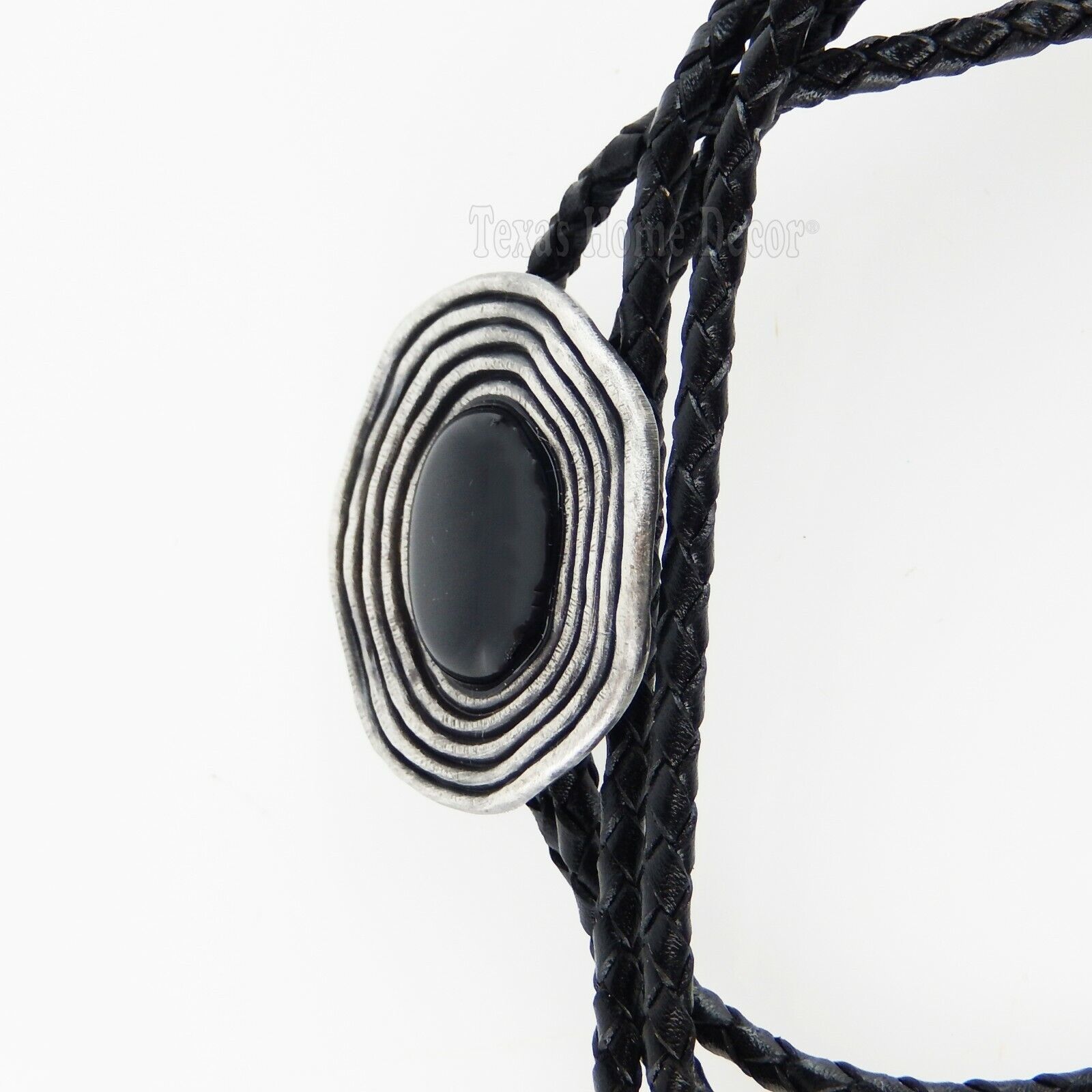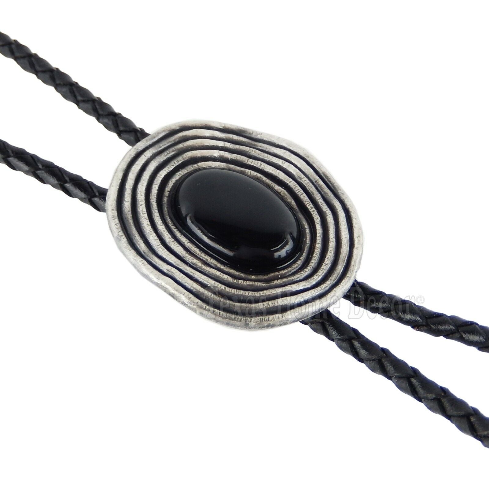 Black Obsidian Stone Bolo Tie Antique Silver Plated 38" Adjustable Leather Cord
