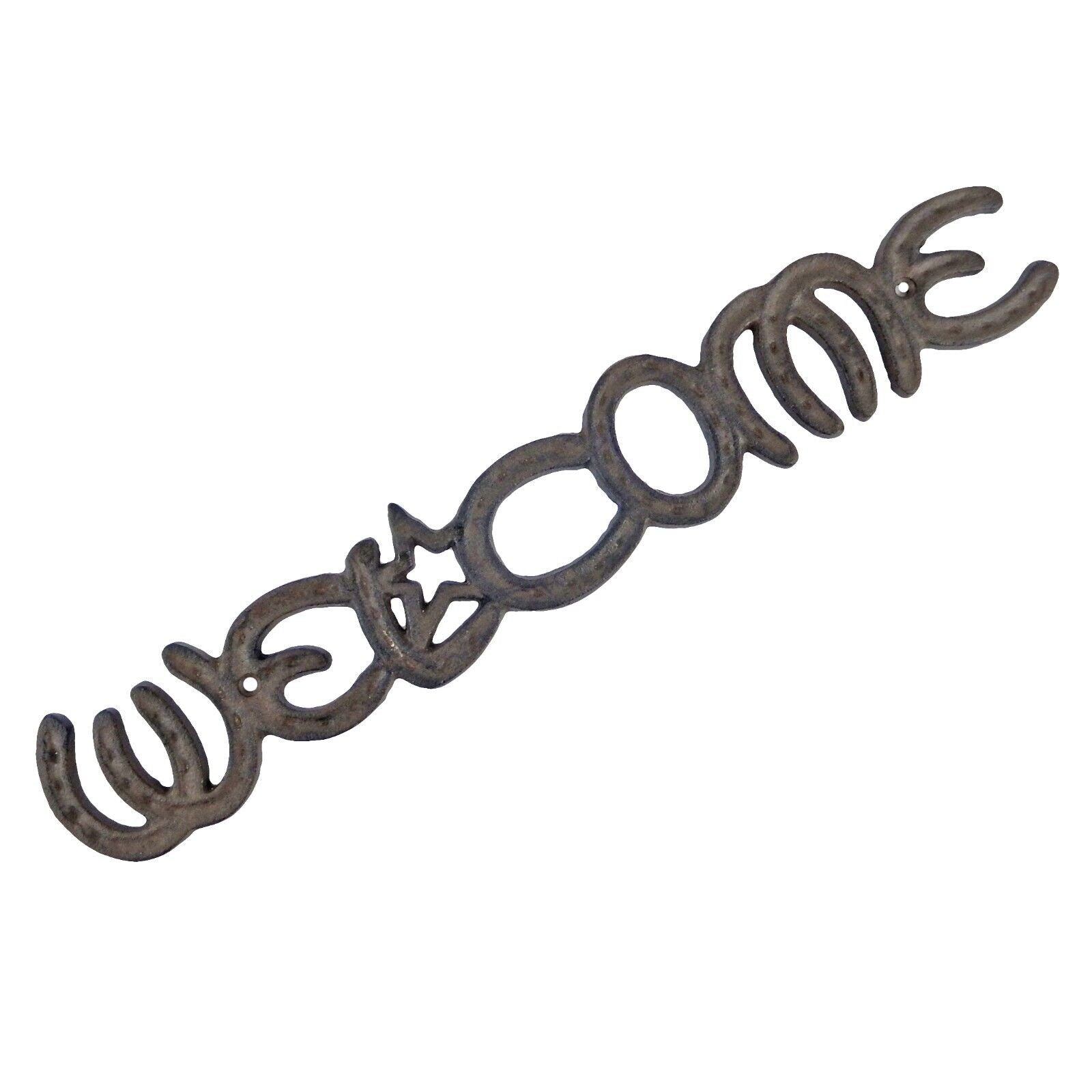 Add a touch of the Wild West to your home with this cast iron horseshoe welcome sign. The rustic finish and Western-style design make it perfect for any room, porch, or outdoor space. Measuring 17 inches in length and 2 3/4 inches in height, this medium-sized wall-mounted plaque features horseshoes pattern that form the word "Welcome".