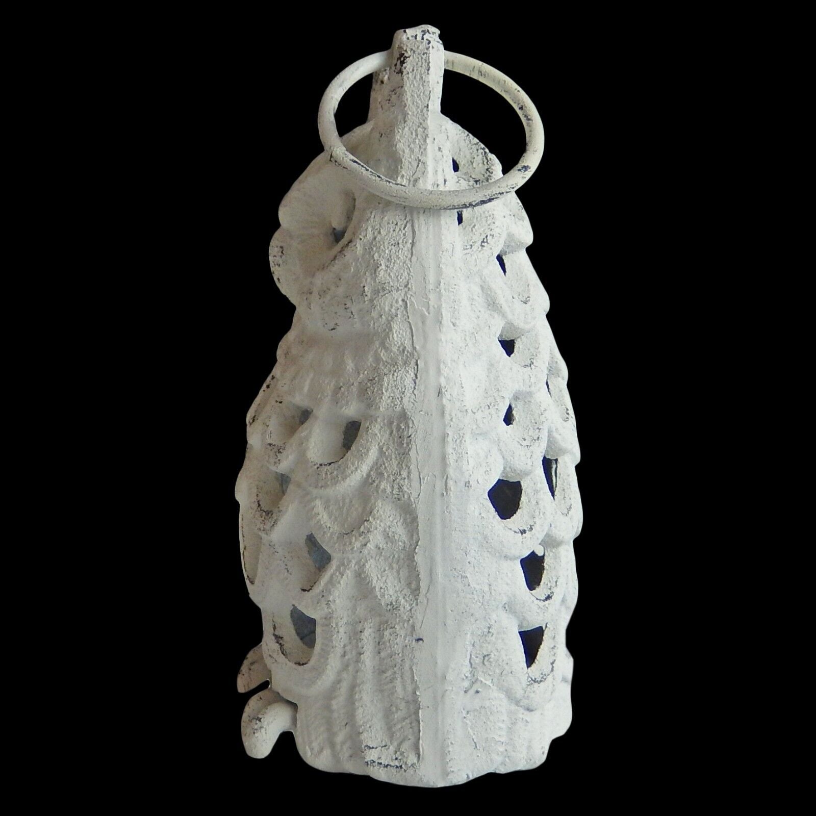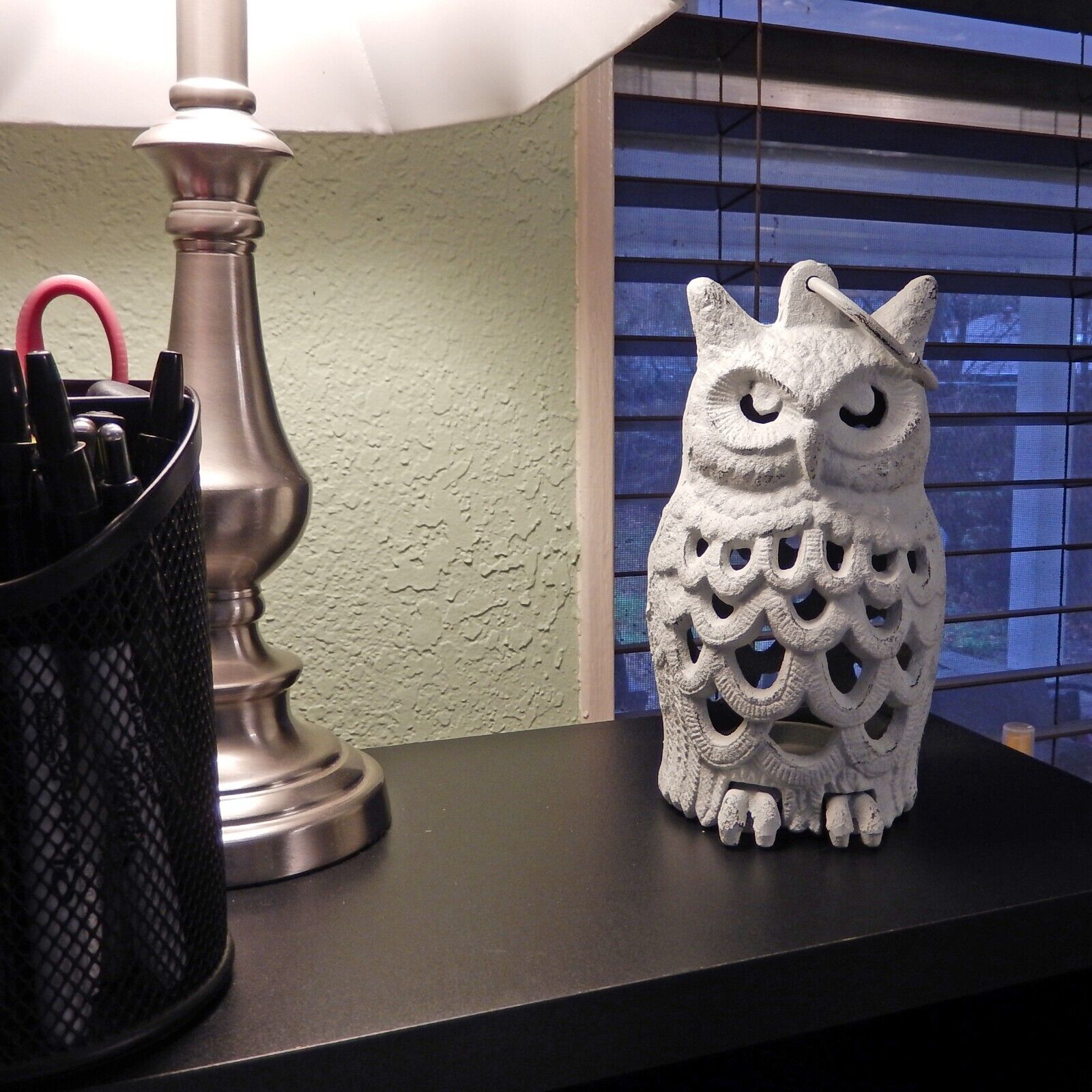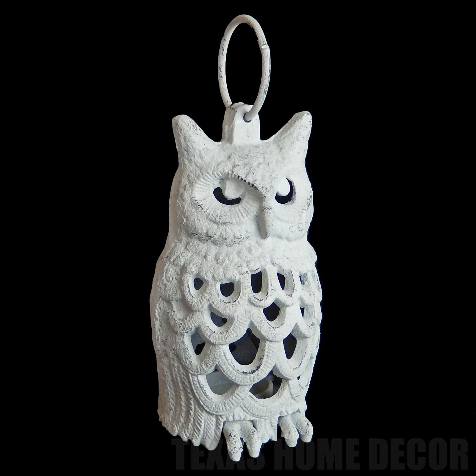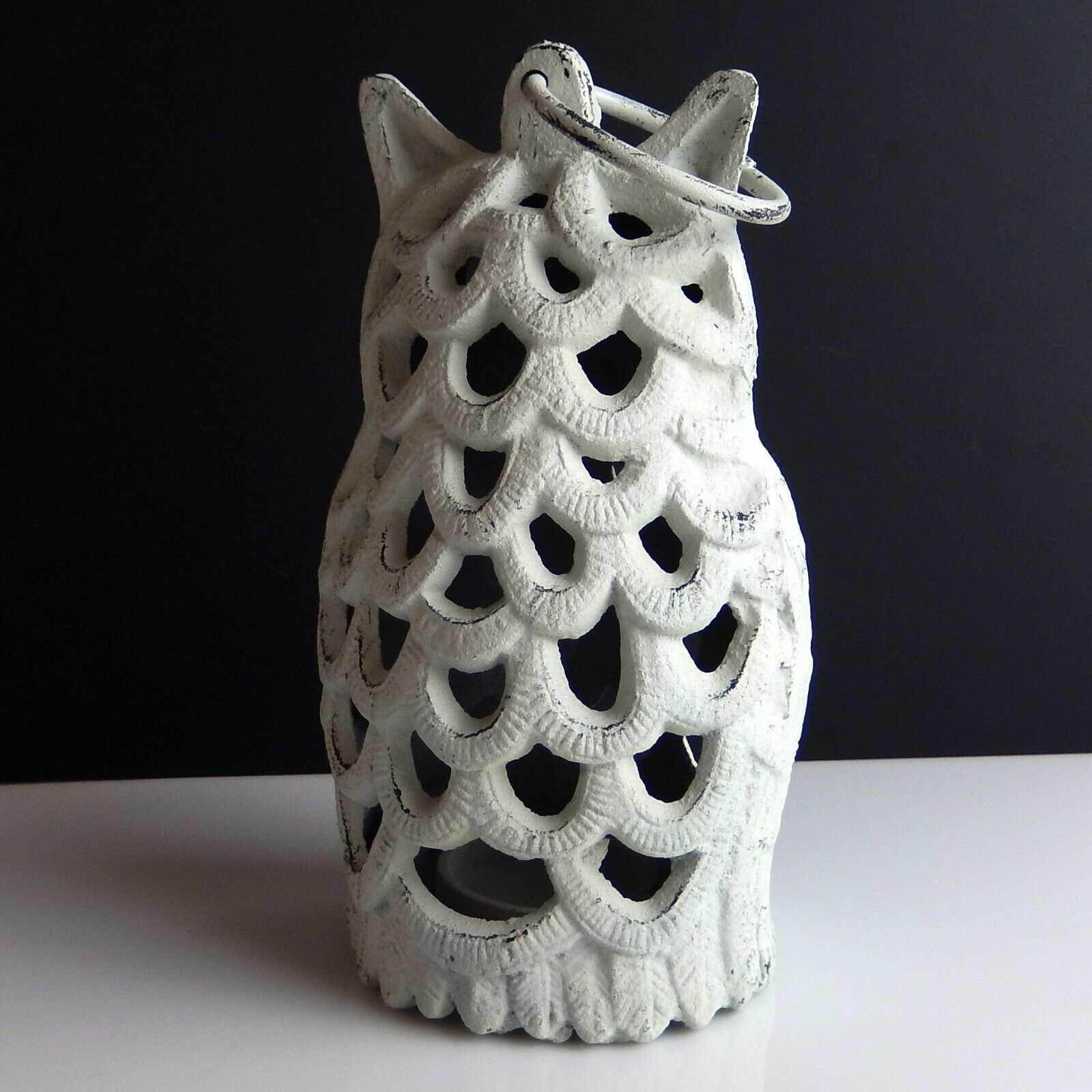 Owl Lantern Tea Light Candle Holder with Handle Antique White Heavy Duty Cast Iron #0119