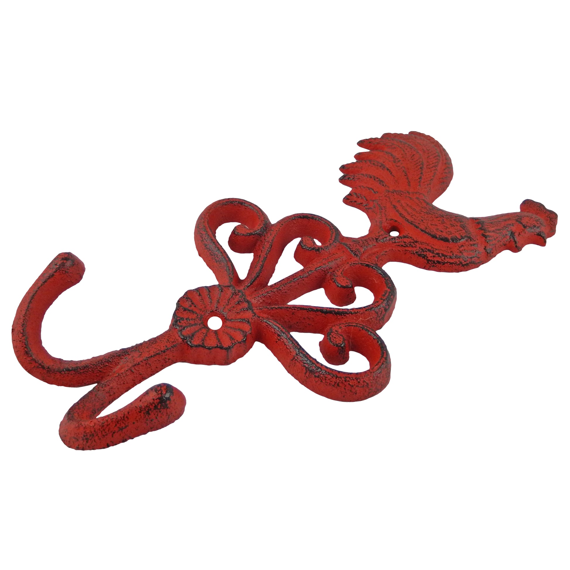 Cast Iron Rooster Scrolls Double Wall Hook Key Towel Coat Hanger Rustic Red