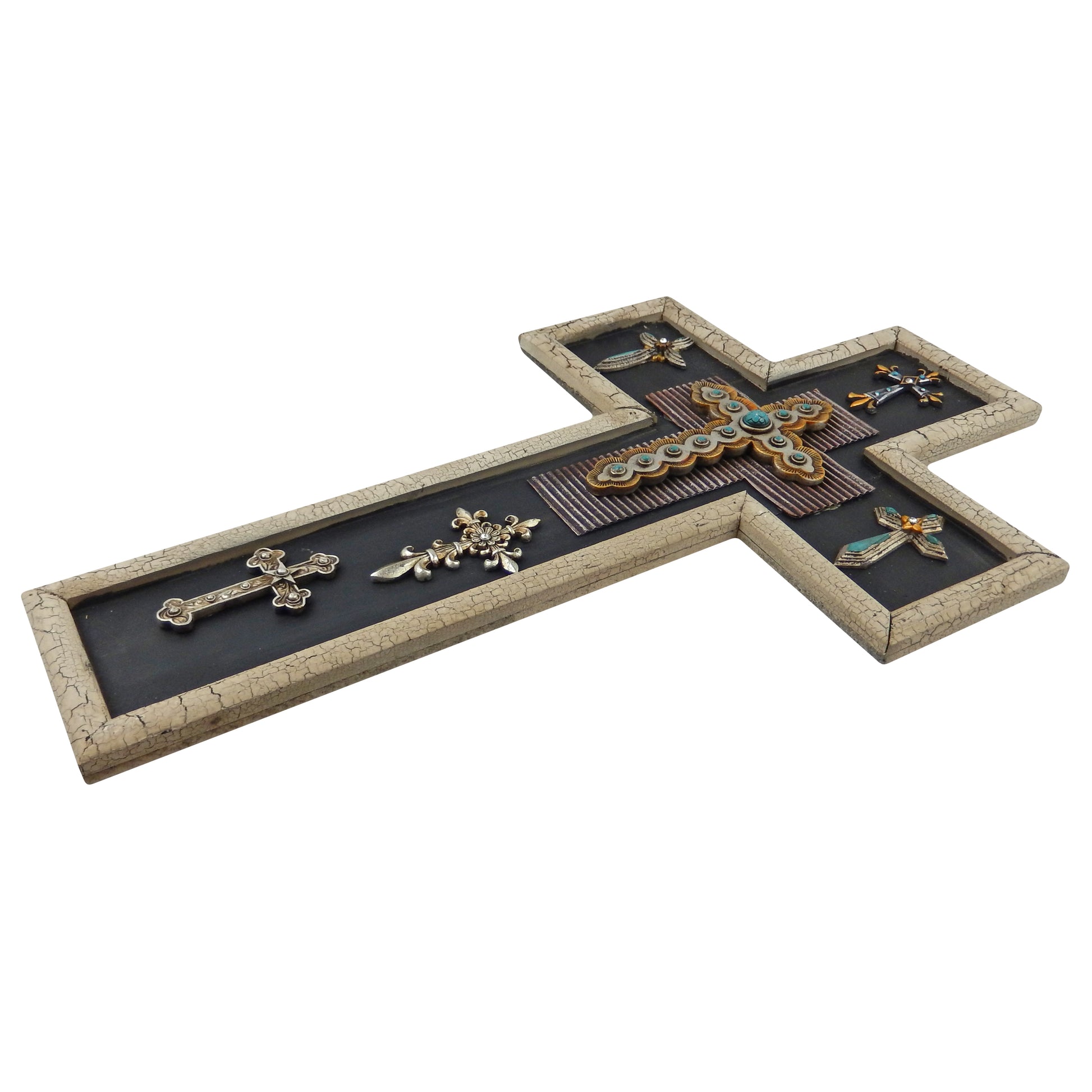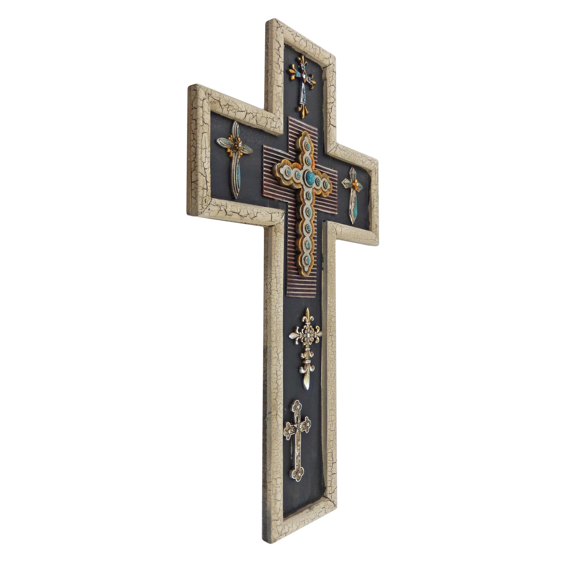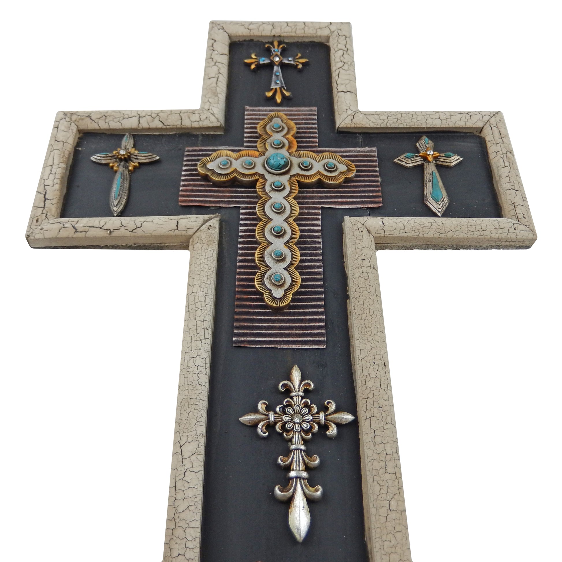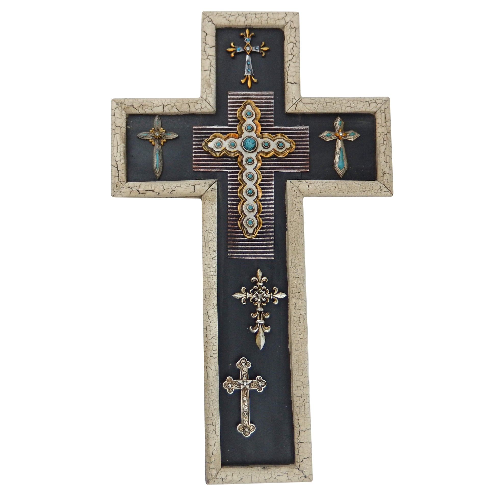 Collage Decorative Wall Cross Turquoise Wooden Body Silver Crosses 20 inch