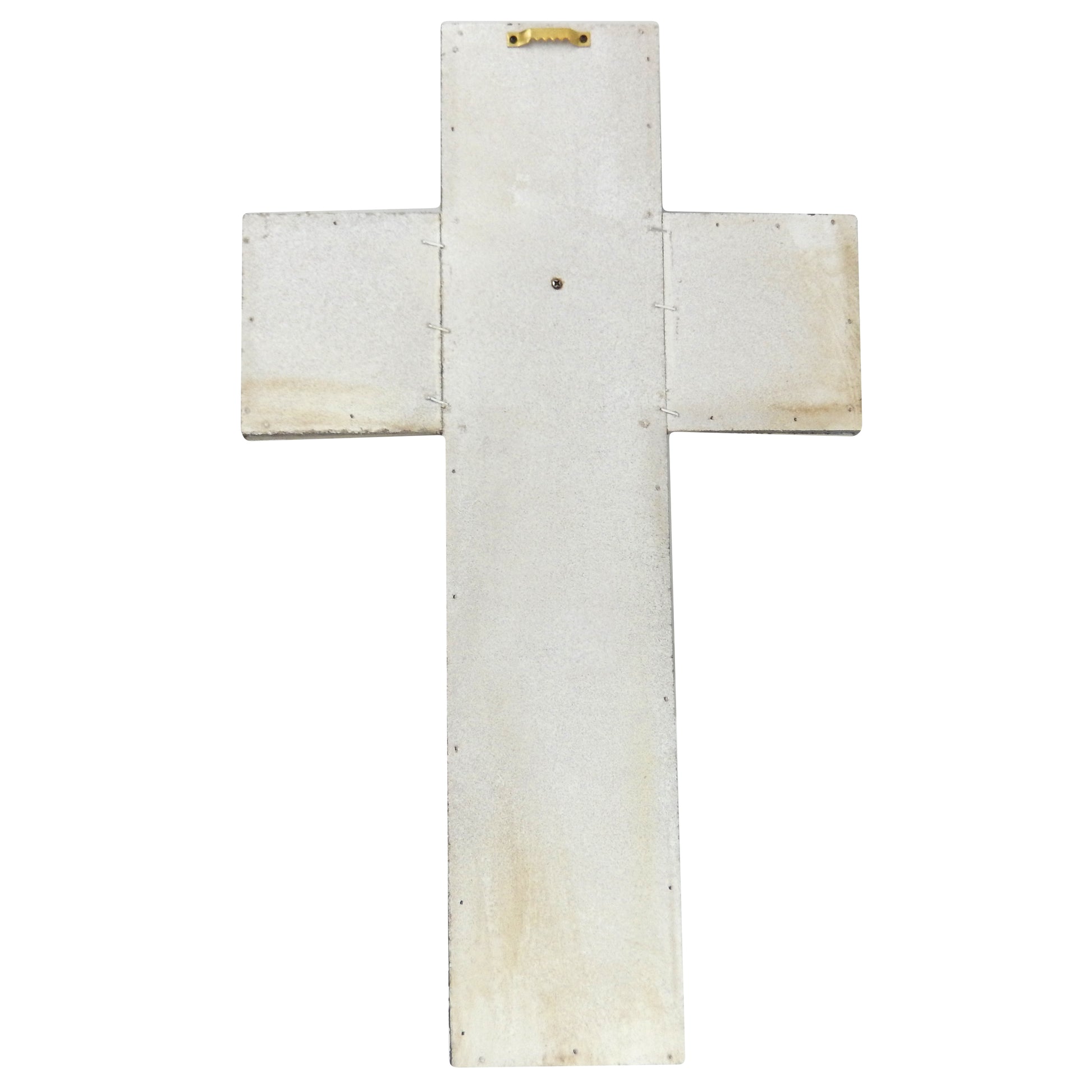 Introducing our brand new Collage Decorative Wall Cross, the perfect addition to any home decor. Crafted with a minimalistic approach, this cross features a distressed wooden body with a vintage feel. Measuring 20 inches tall by 12 inches wide, it is the ideal size for any wall space. The cross itself is a beautiful collage of silver and turquoise accents, adding a touch of elegance to its rustic design. The back of the cross is equipped with a sawtooth metal mounting piece, making it easy to hang and display. Perfect for collectors of religious and spiritual items, this cross is a must-have for those who appreciate the beauty of Christianity. Elevate your home decor with our Collage Decorative Wall Cross today!