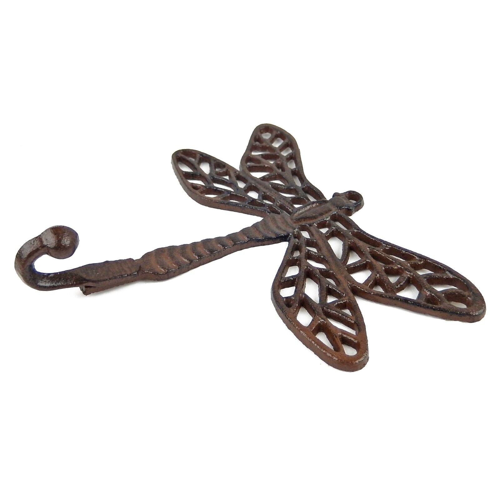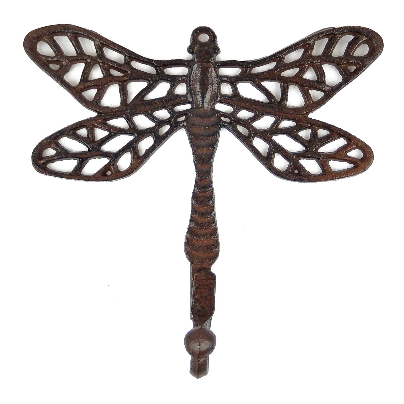 This Dragonfly Key Hook is perfect for adding a touch of rustic charm to your home decor. Made of durable cast iron and finished with a brown patina, this wall-mounted hook features a single tail hook that can be used to hang towels, coats, or keys. It measures 7 3/4 inches tall by 8 1/4 inches wide and it can be mounted using any of the available openings, (Mounting screws not included). The antique style and intricate dragonfly design make this hook a great addition to any room, and its easy installation makes it a practical choice for busy households. The tip of the hook sticks out 1 3/4 inches. Whether you're looking for a functional key hook or a decorative accent piece, this Dragonfly Key Hook is sure to impress.