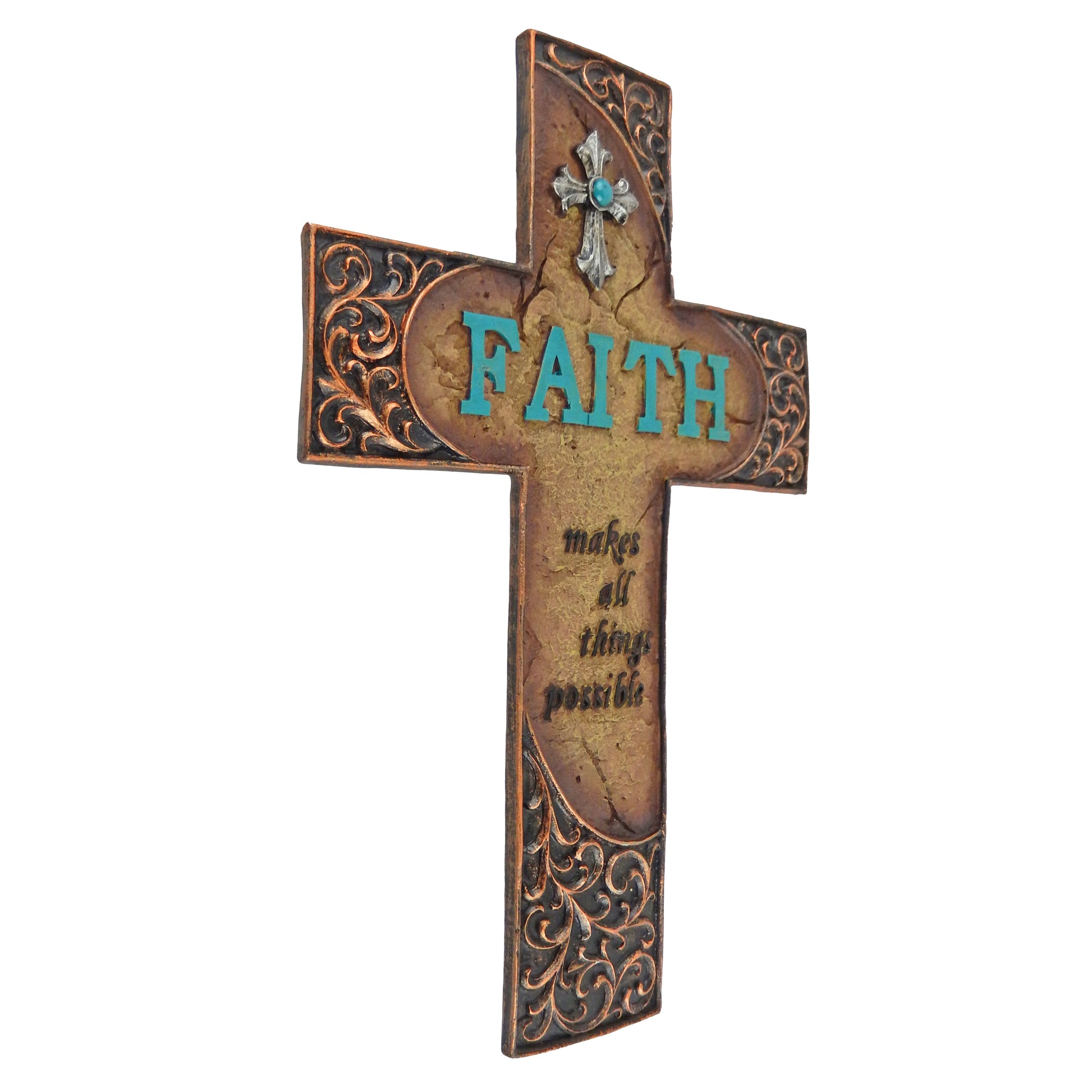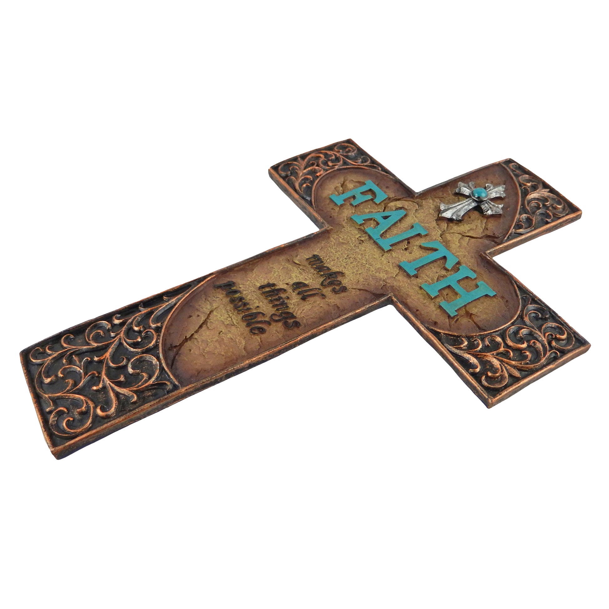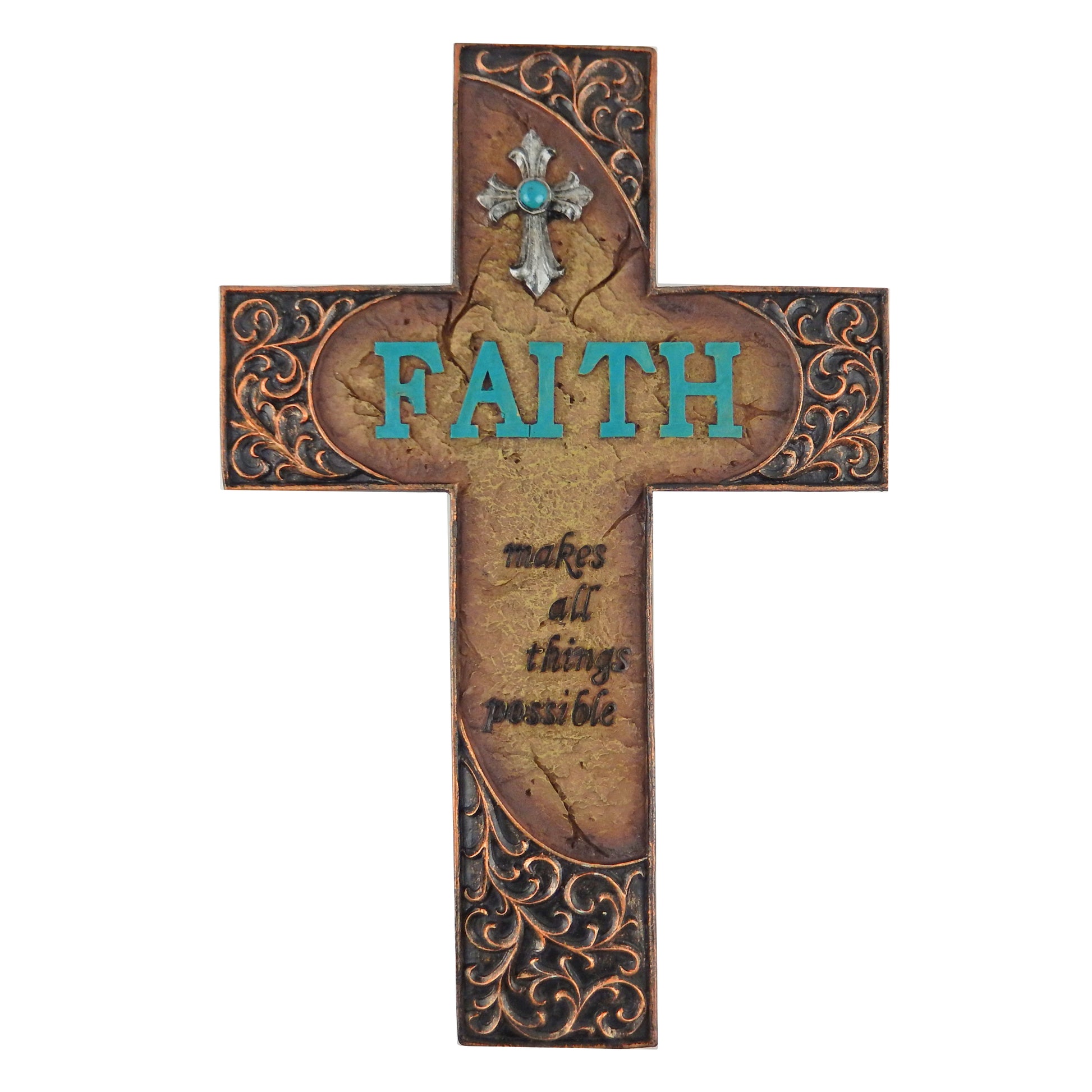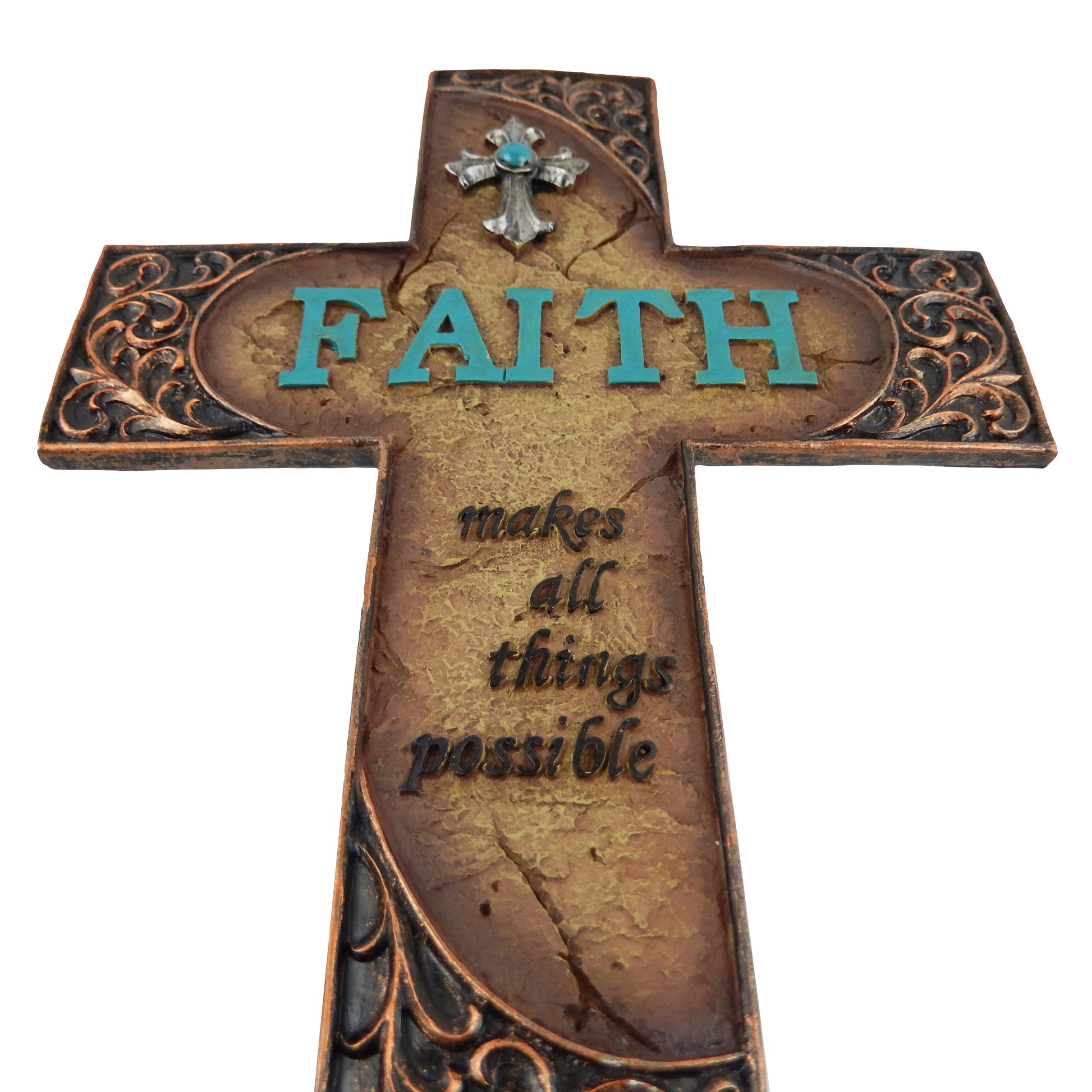 Faith Makes All Things Possible Scrolls Wall Cross Turquoise Accents Stone Look # YC-1042