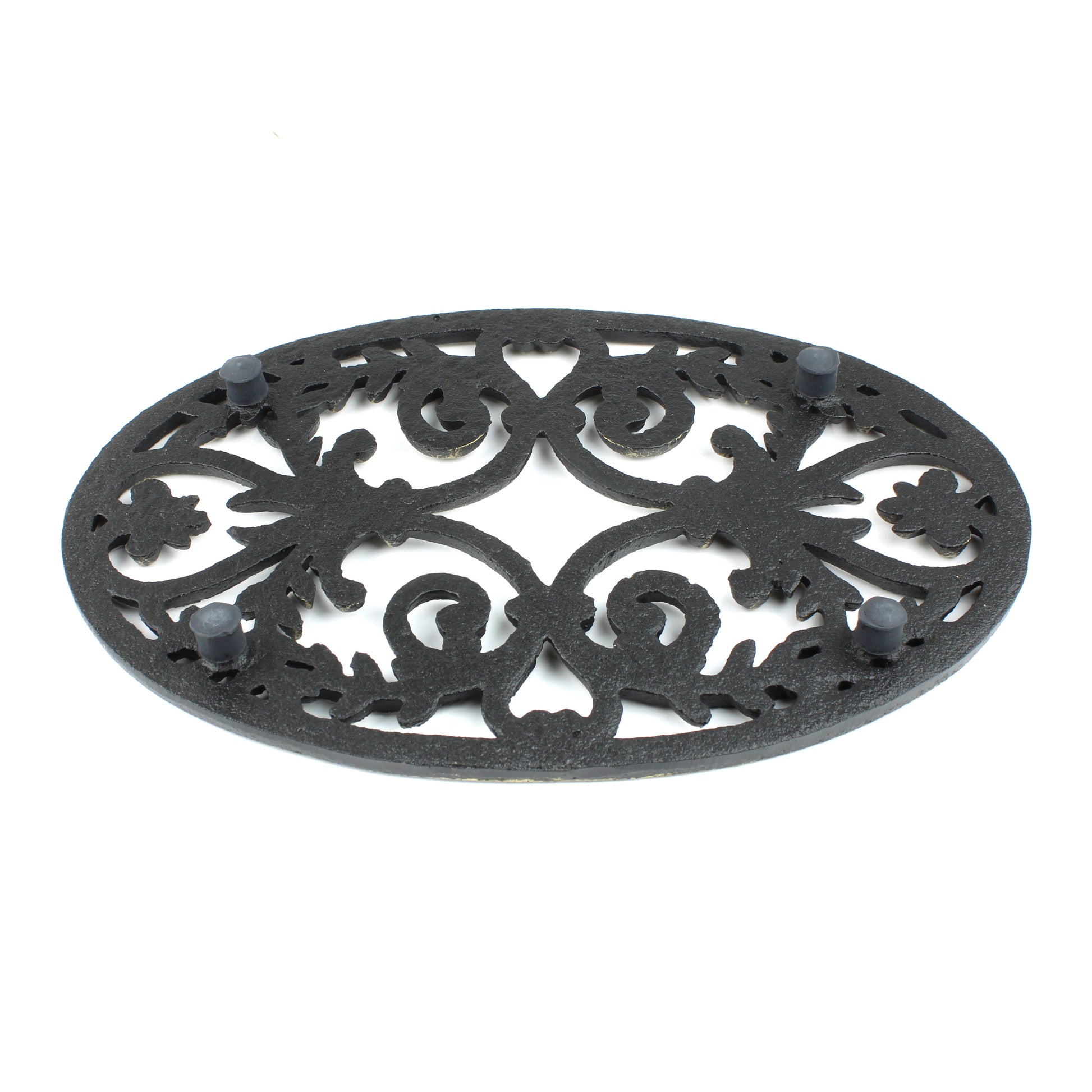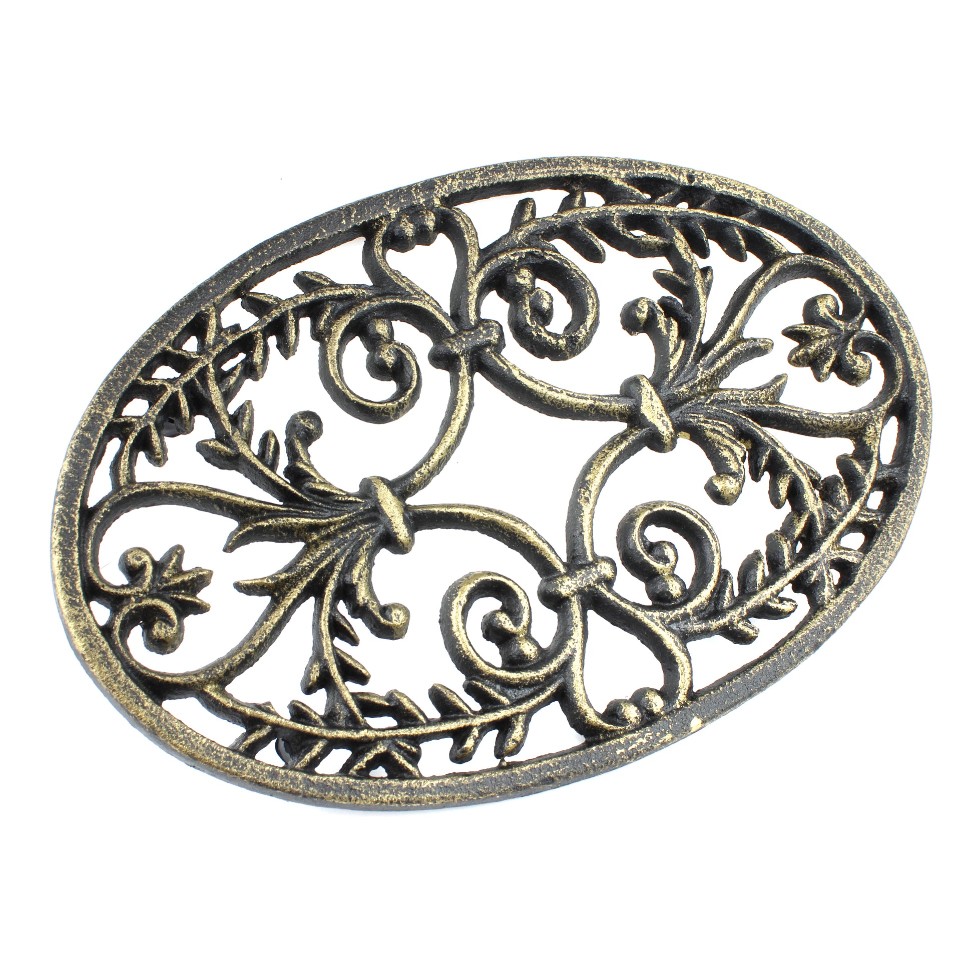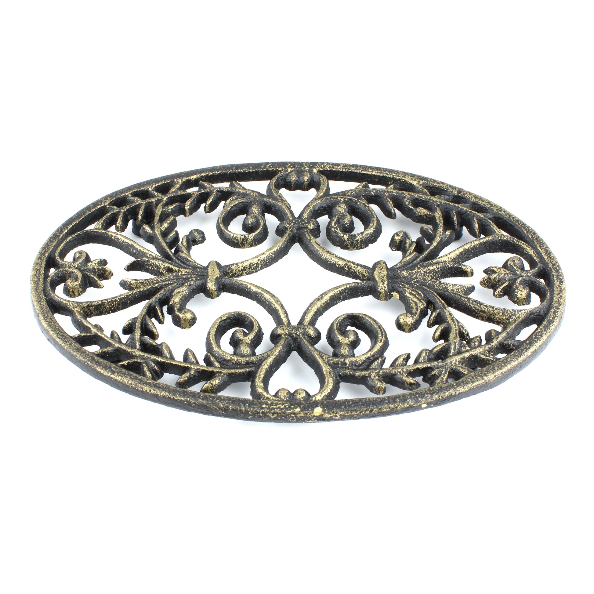 Fleur De Lis Oval Trivet Cast Iron Gold Patina Ornate Scrolls Antique Style