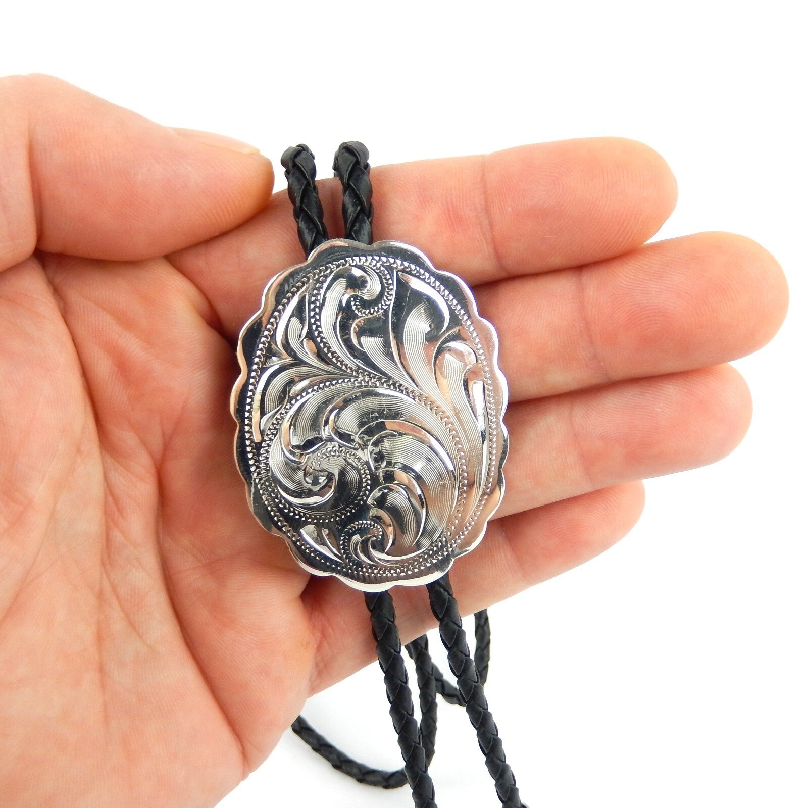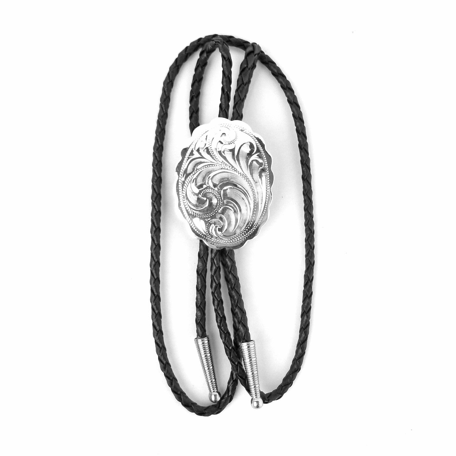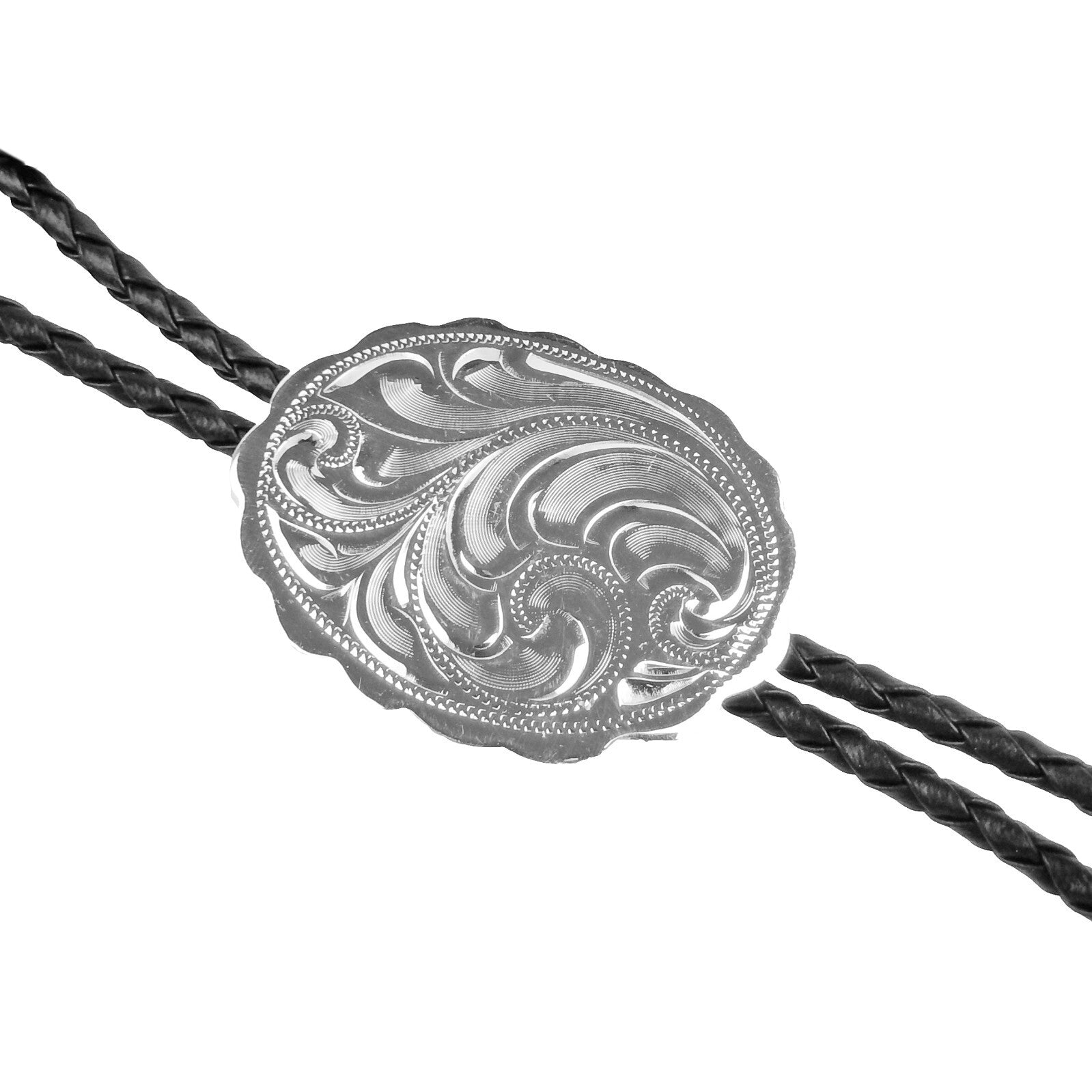 German Silver Engraved Floral Bolo Tie Adjustable 36 inch Black Cord Made in USA