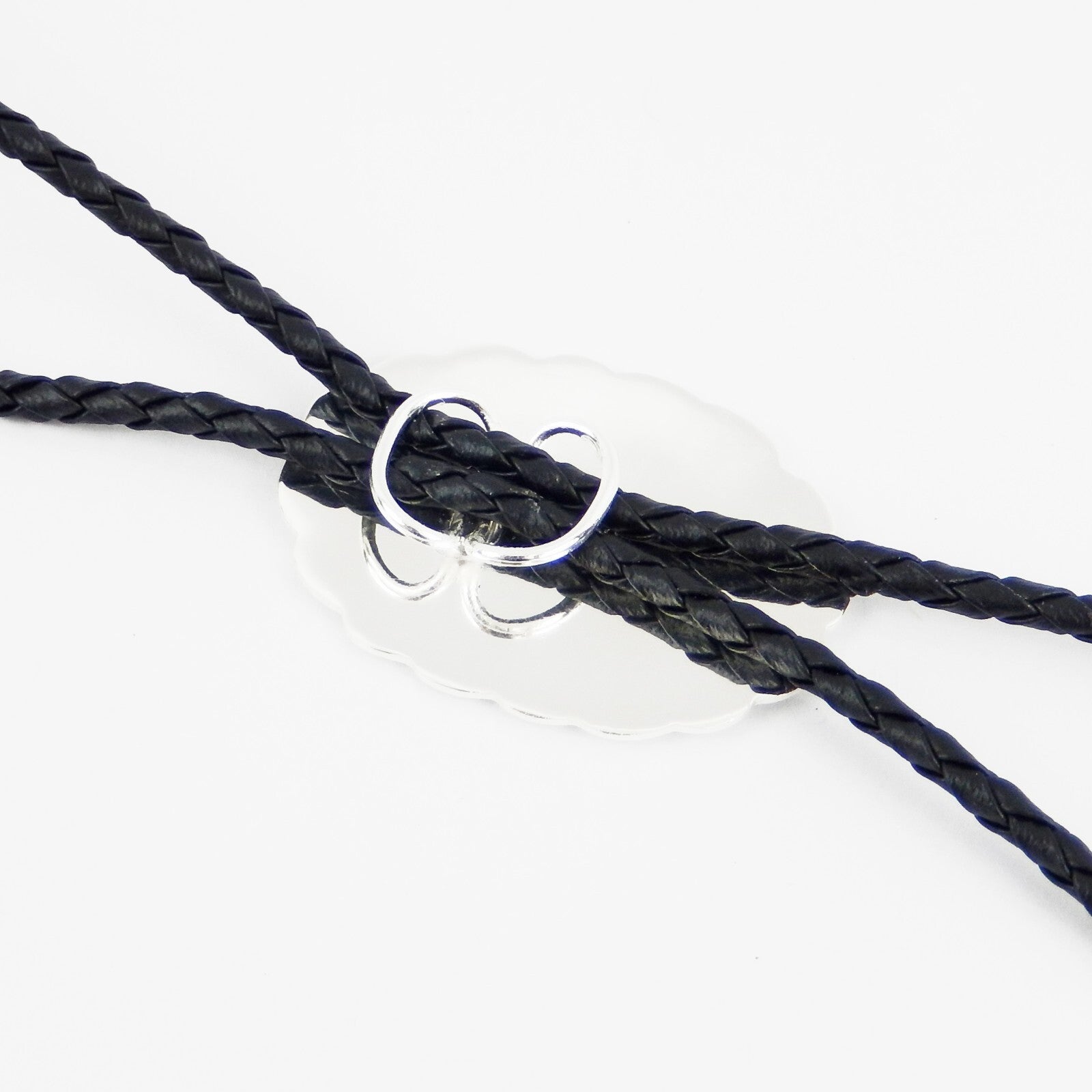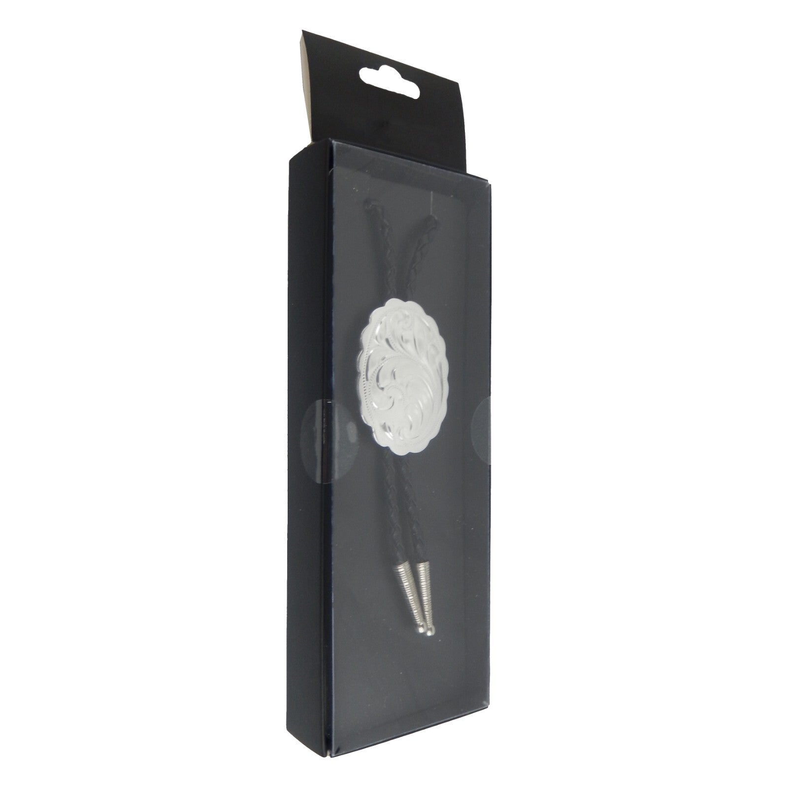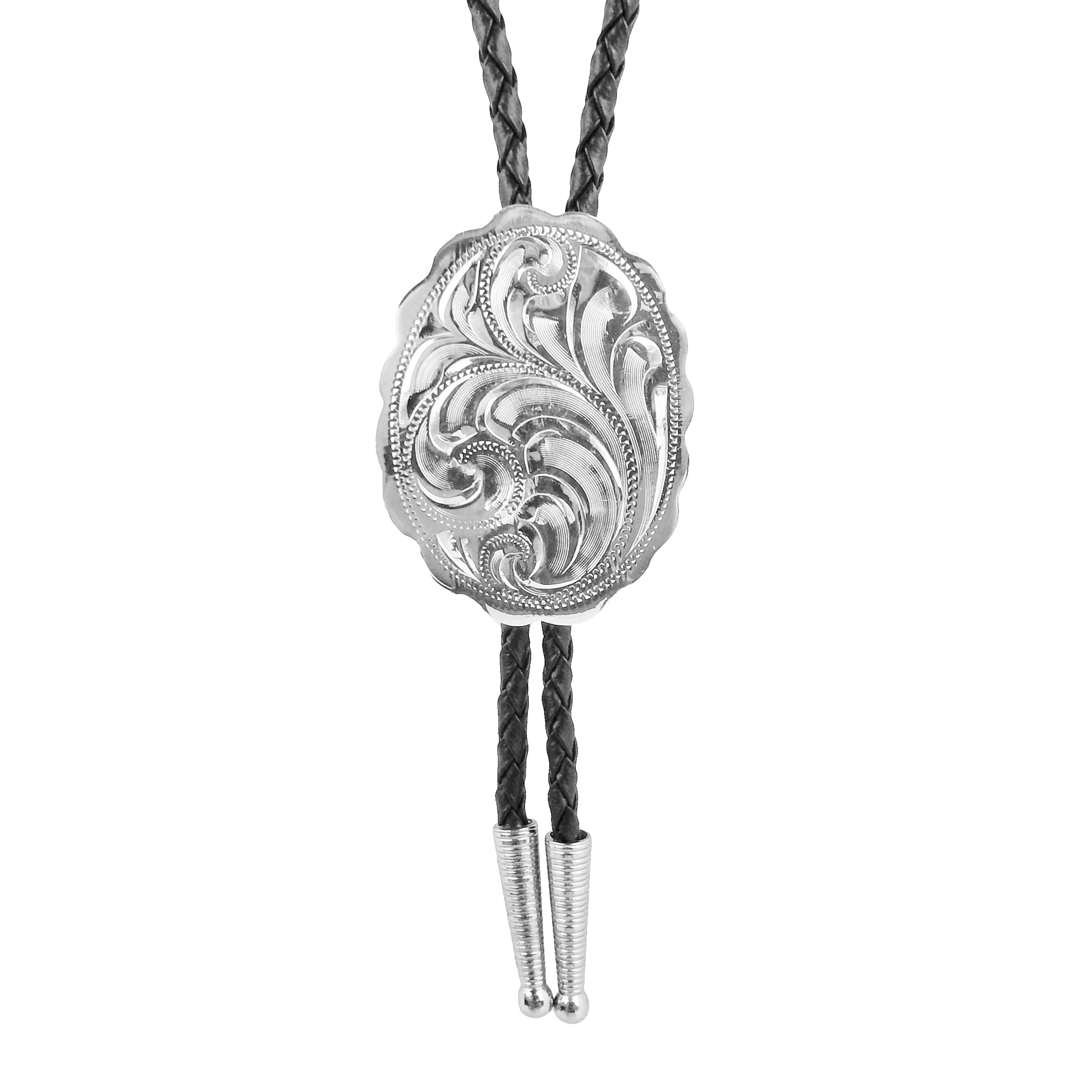 German Silver Engraved Floral Bolo Tie Adjustable 36 inch Black Cord Made in USA