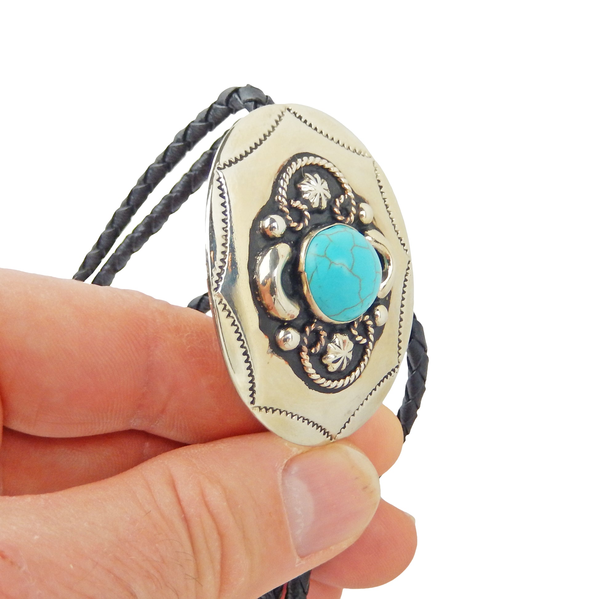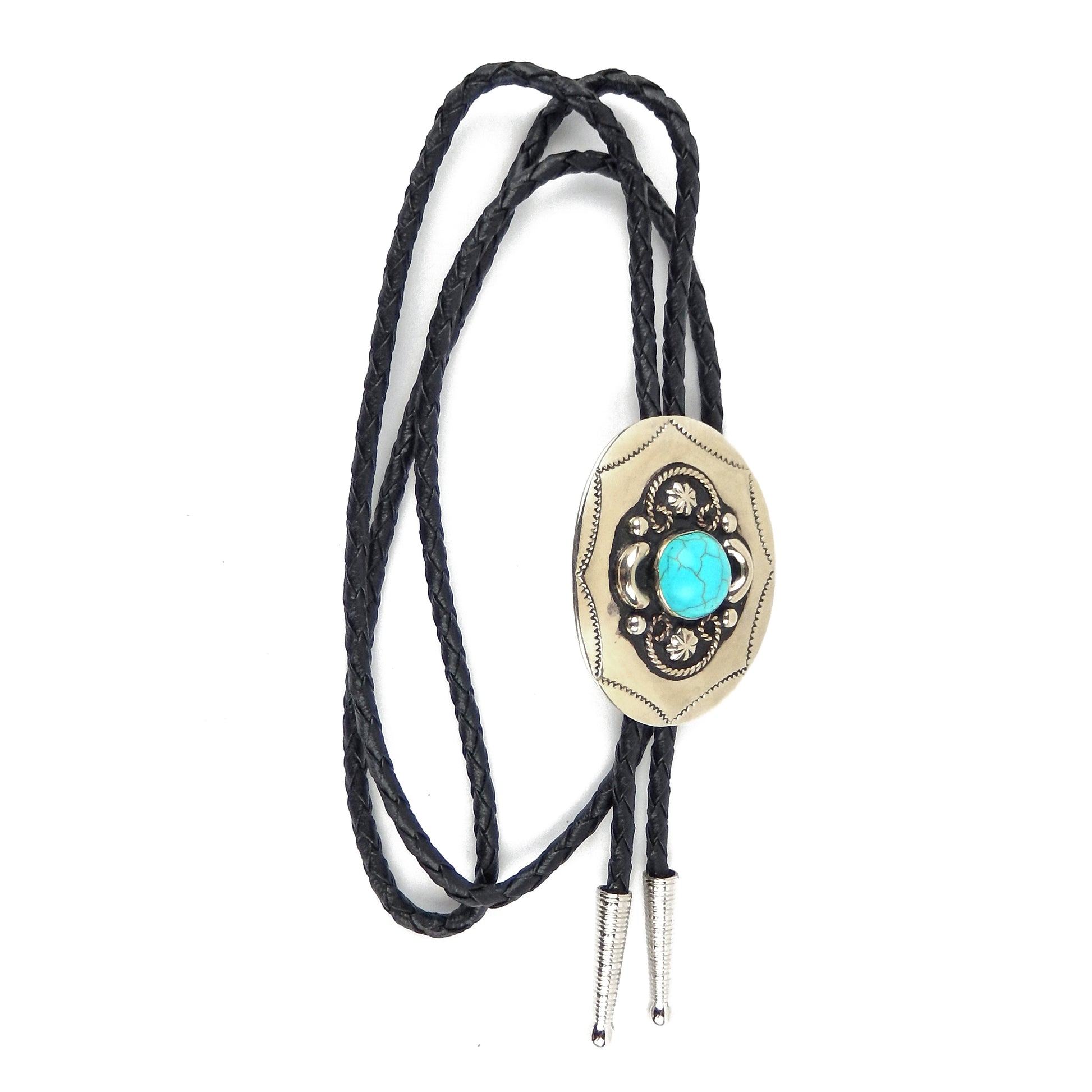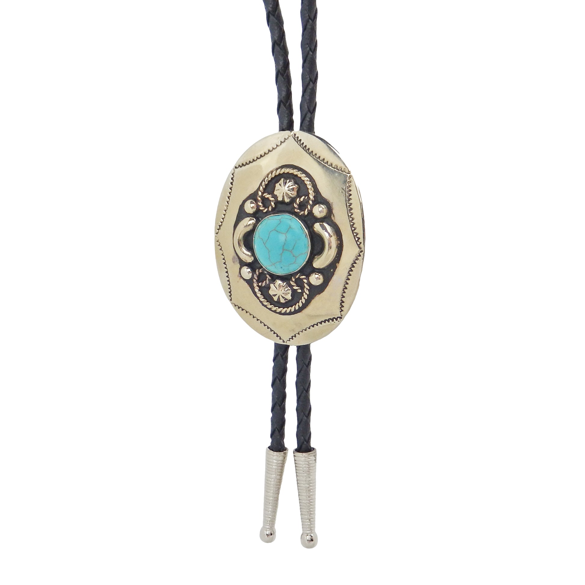 German Silver Oval Turquoise Bolo Tie Adjustable 36 inch Black Cord Made in USA