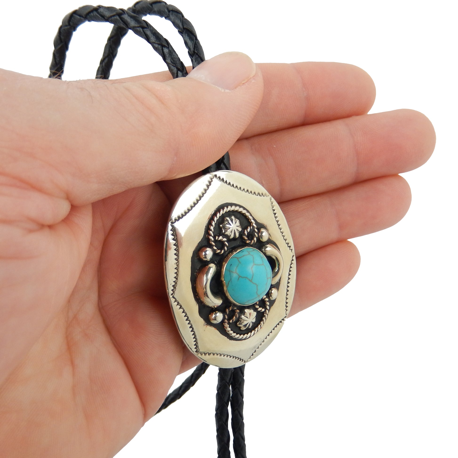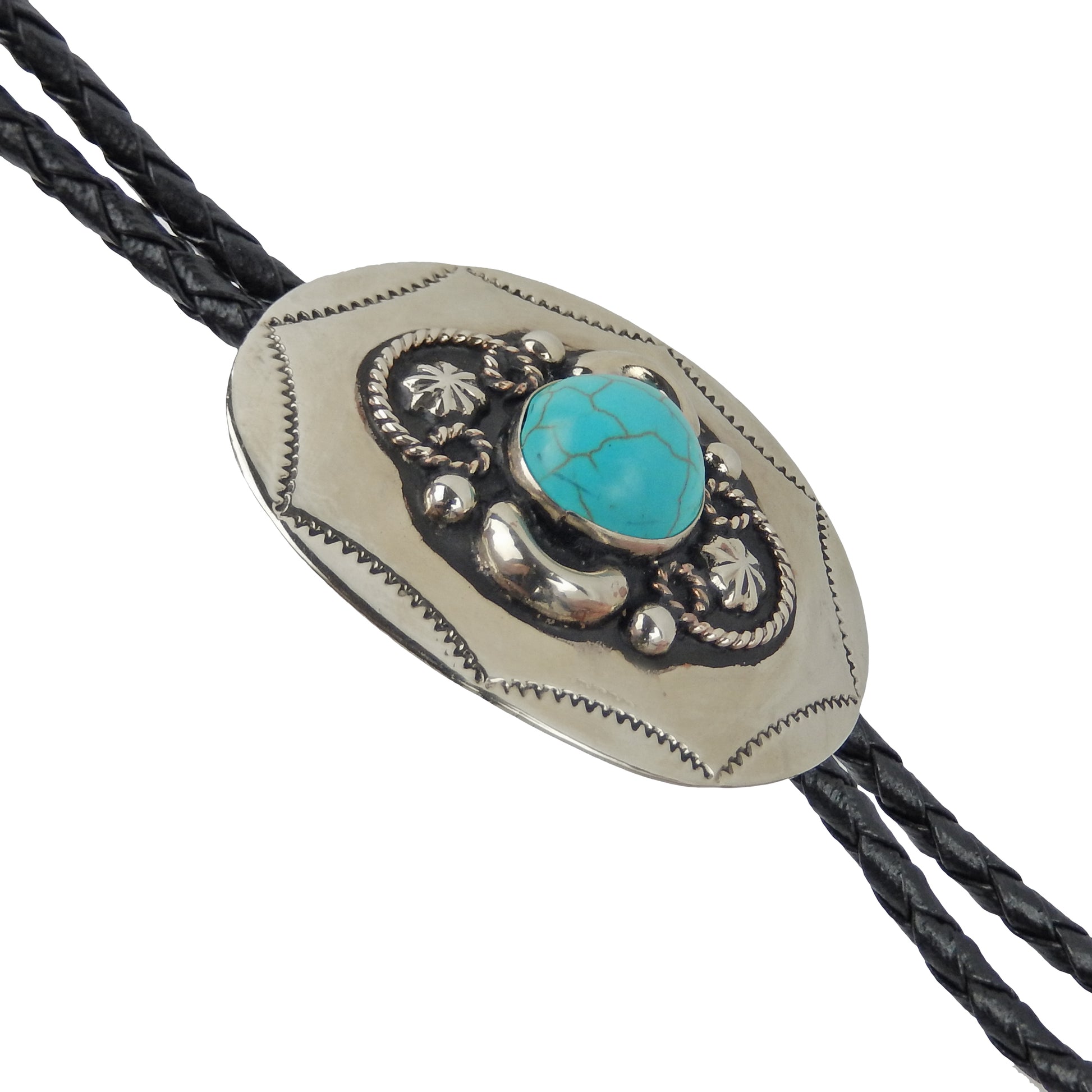 German Silver Oval Turquoise Bolo Tie Adjustable 36 inch Black Cord Made in USA #BT202