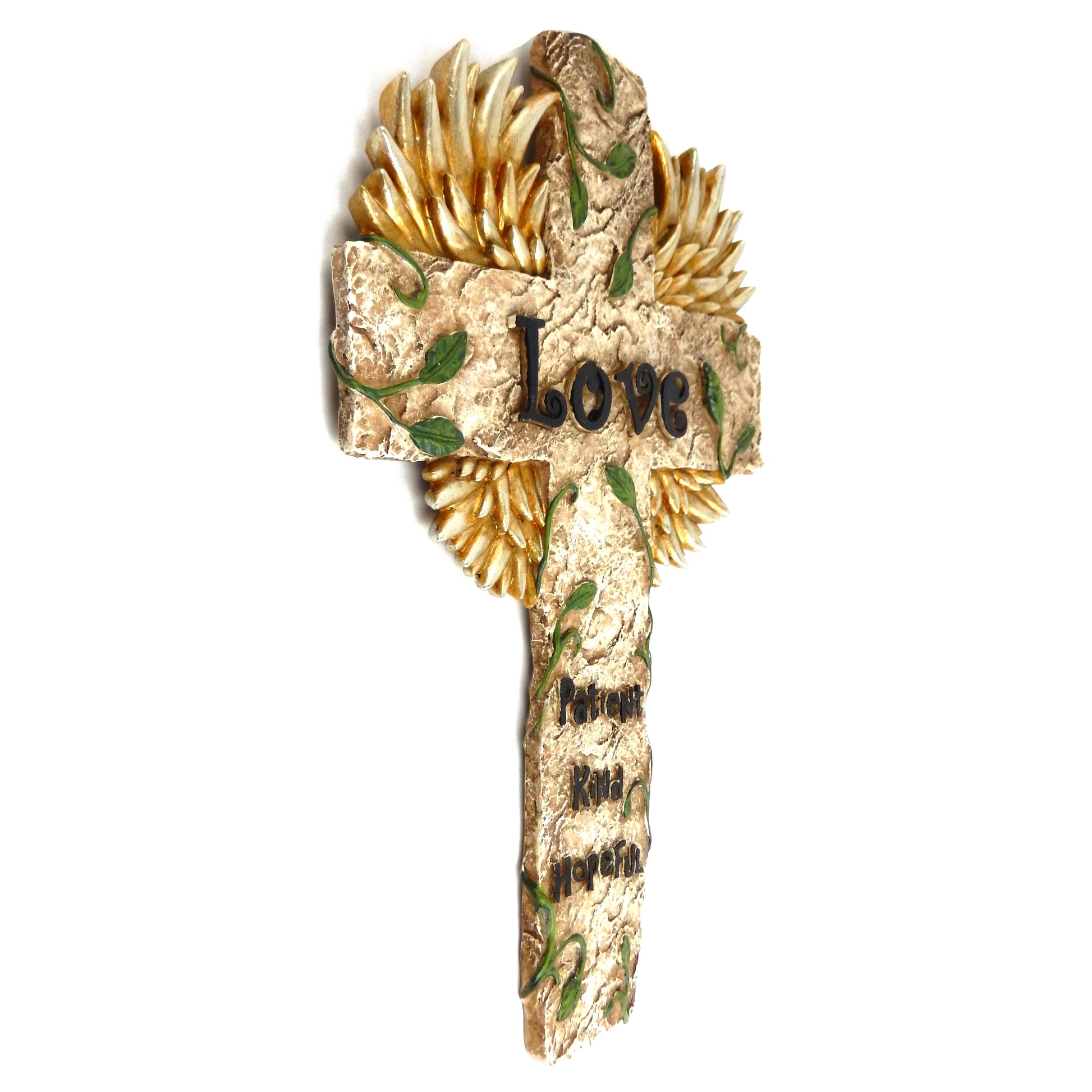 Golden Love Angel Wings Wall Cross Stone Look Leaf "Patient Kind Hopeful" 13 in
