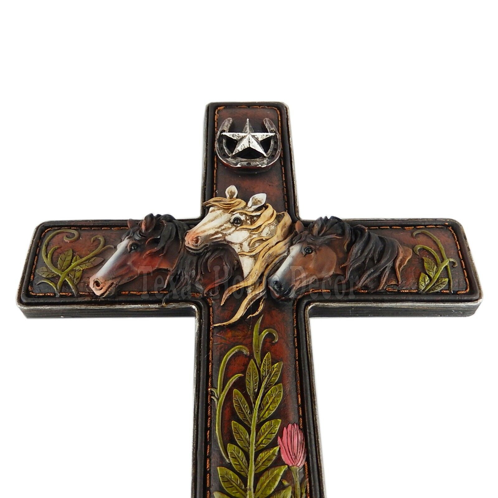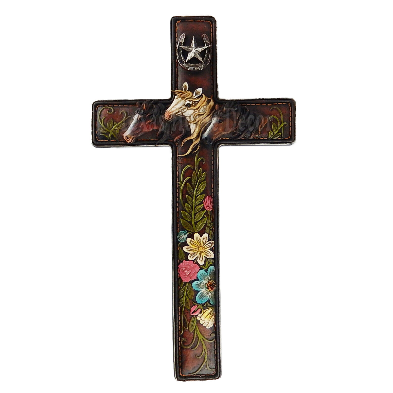 Horses Flower Wall Cross Country Western Decor Horseshoe Star Leather Look 18.5"