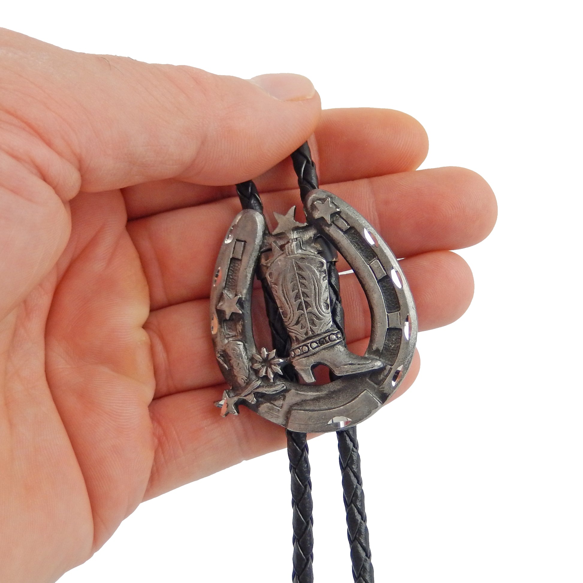Horseshoe Cowboy Boot Bolo Tie Western Silver Tone 36 inch Black Cord USA Made