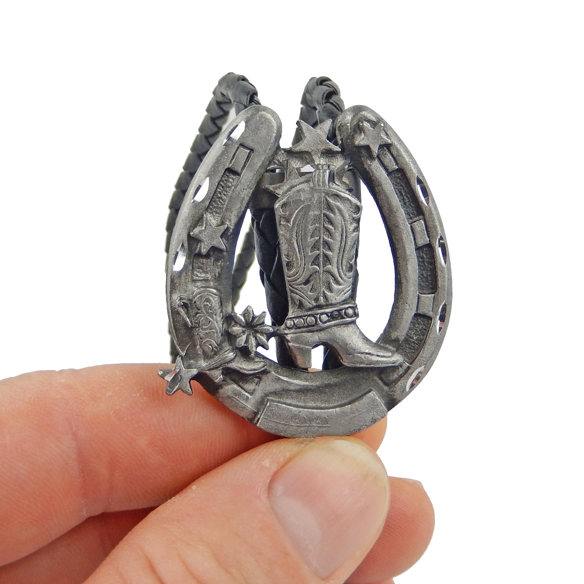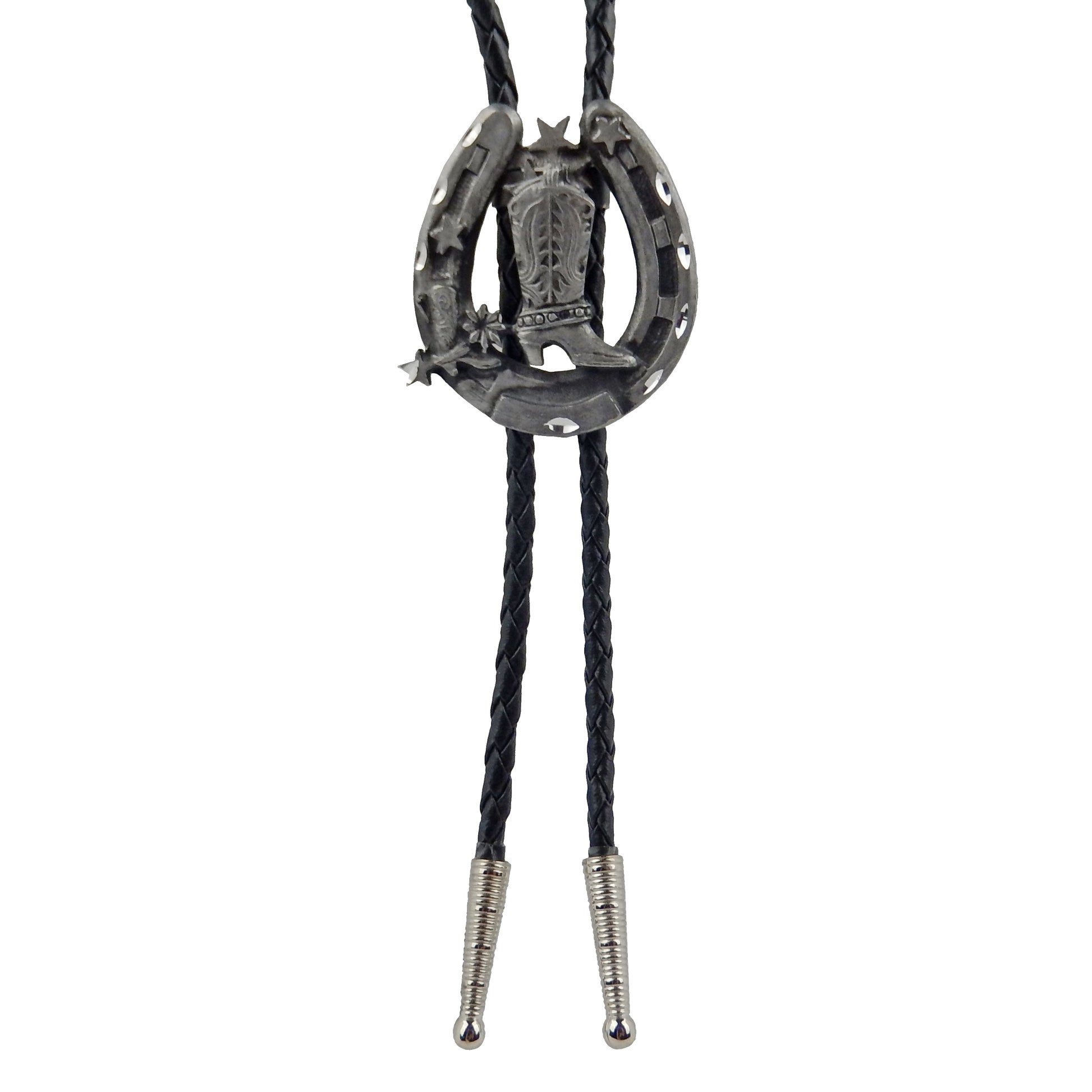 Horseshoe Cowboy Boot Bolo Tie Western Silver Tone 36 inch Black Cord #BT-144