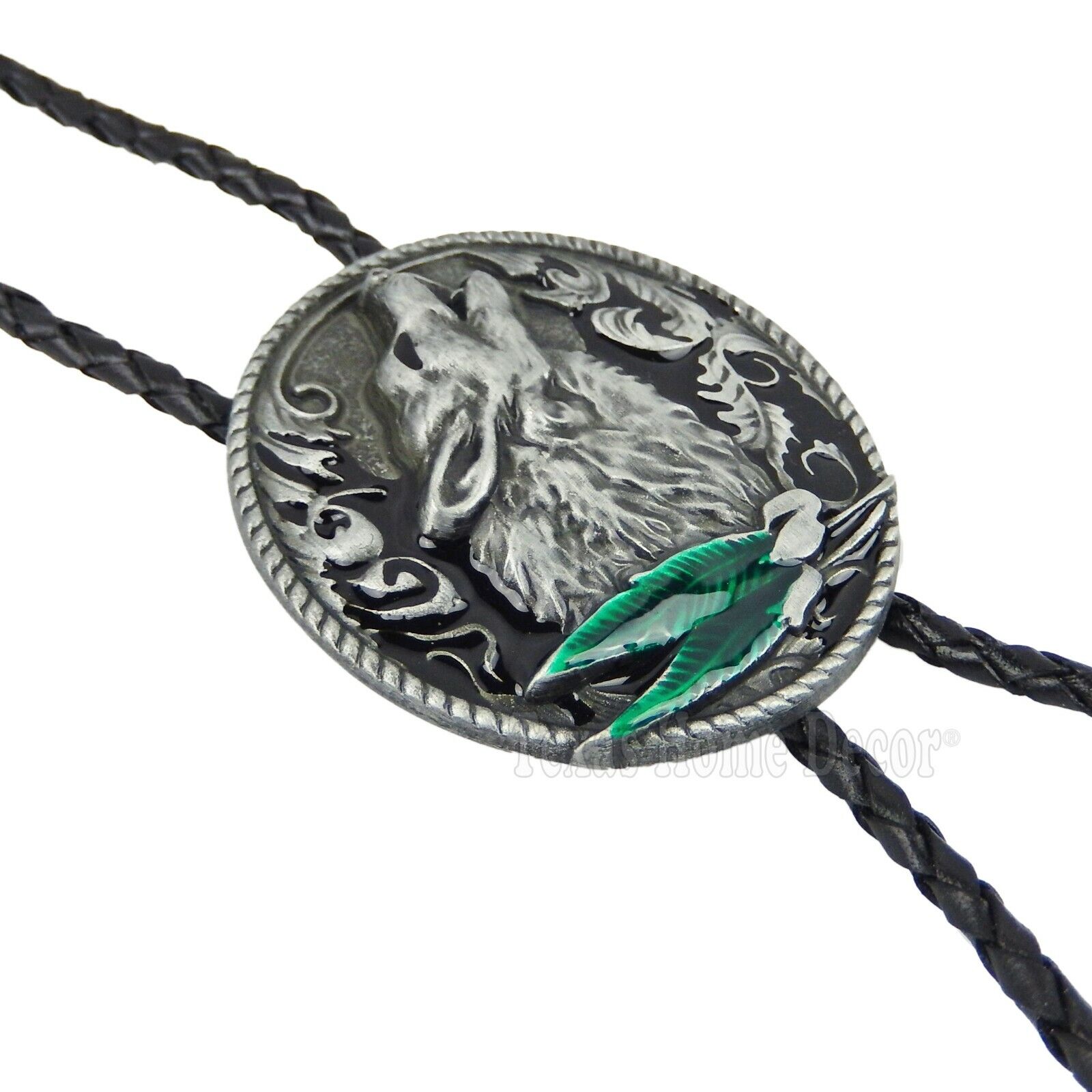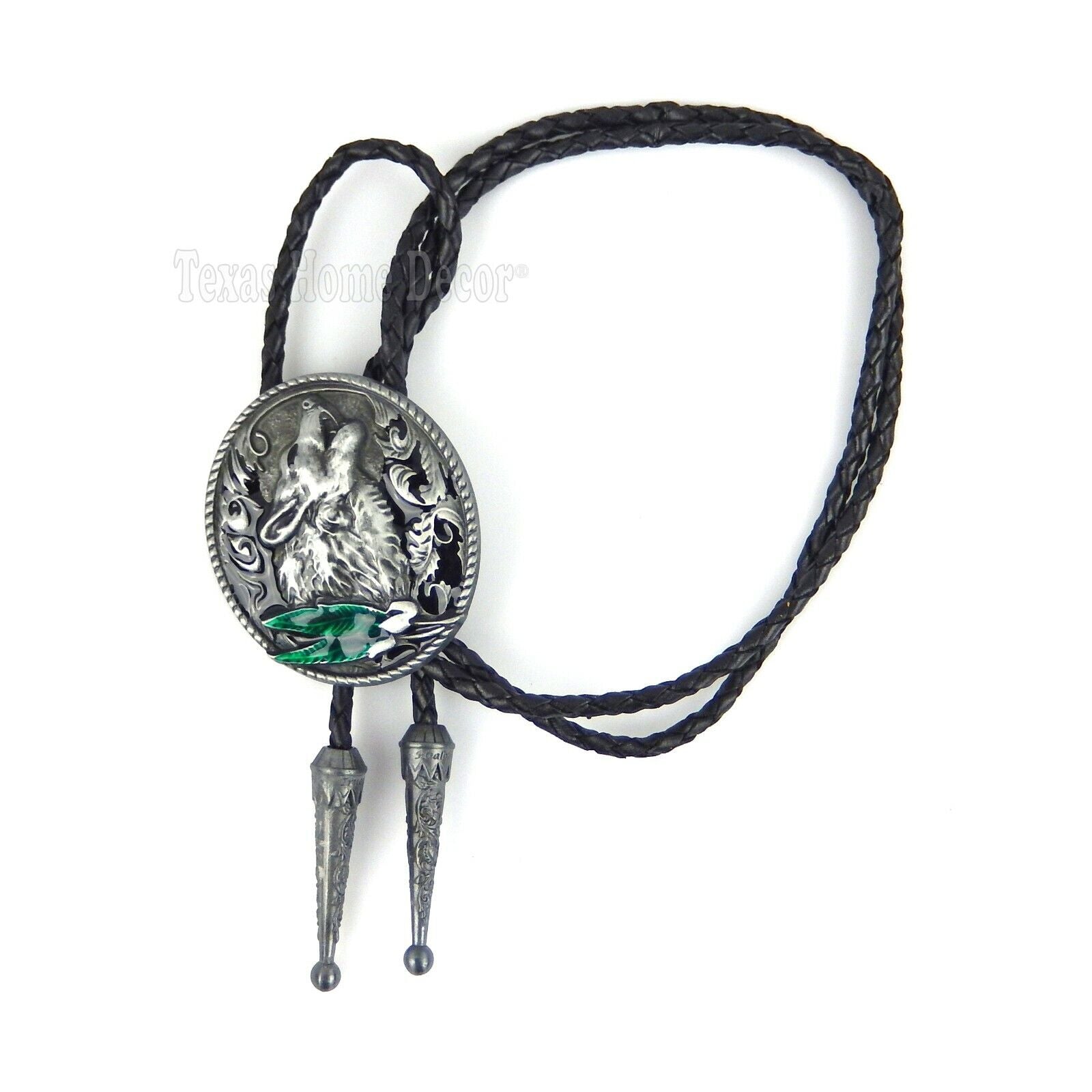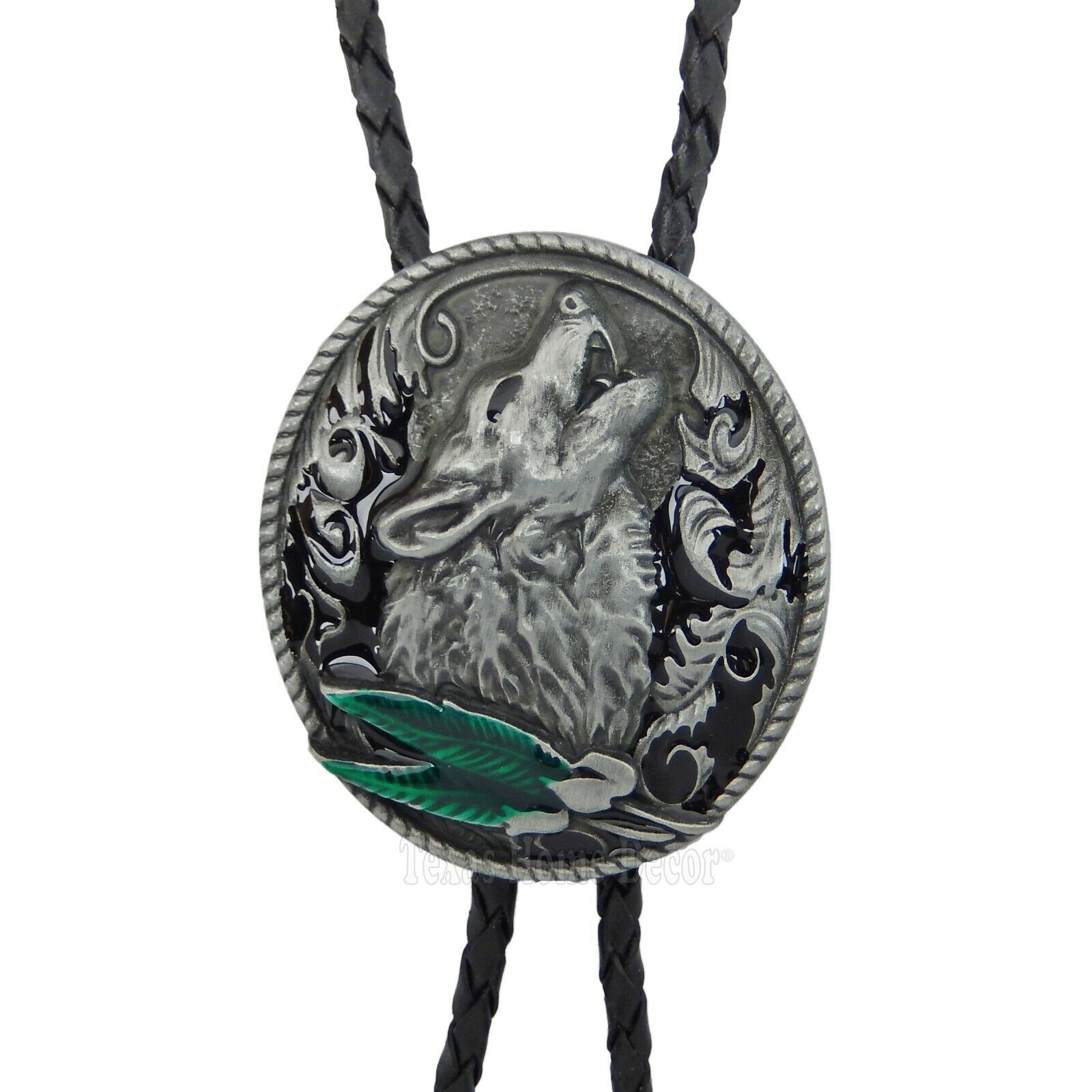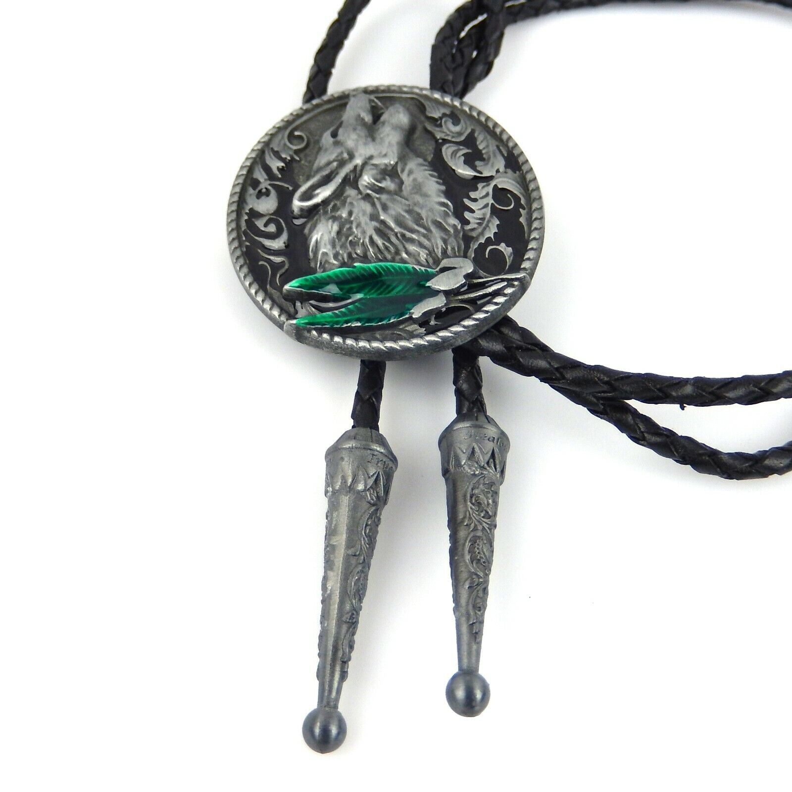 Howling Wolf Bolo Tie Silver Tone 42" Leather Cord Color Enamel Detailed Tips