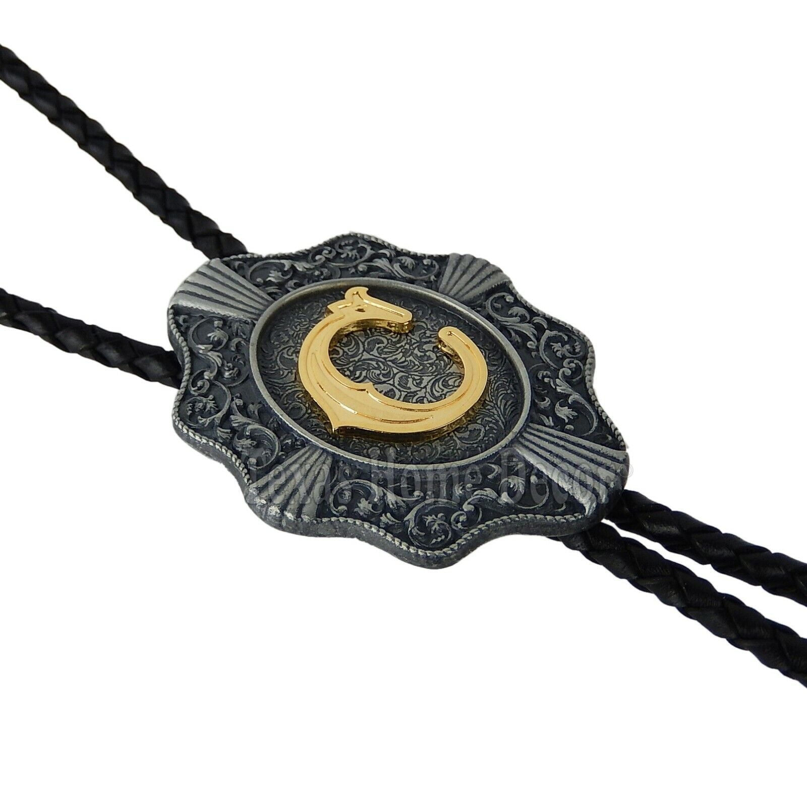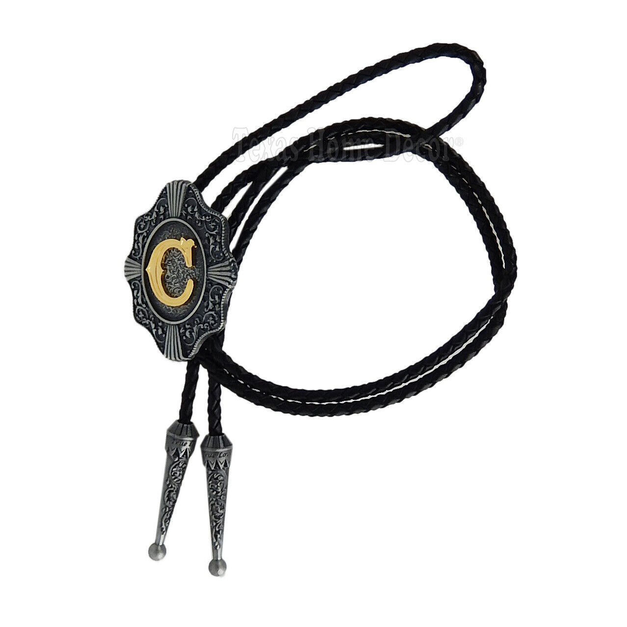 Initial Letter "C" Bolo Tie Western 38" Genuine Leather Cord Detailed Tips