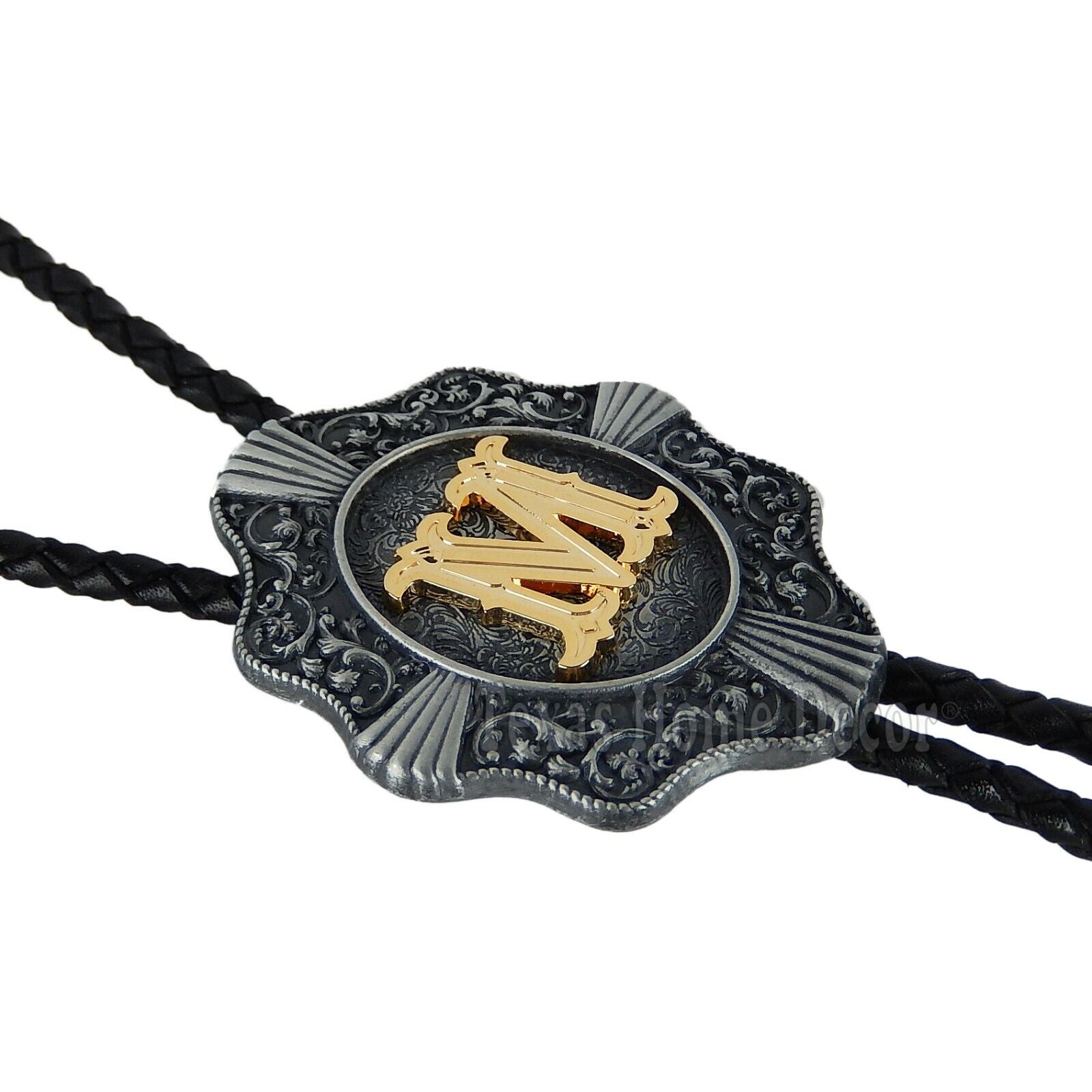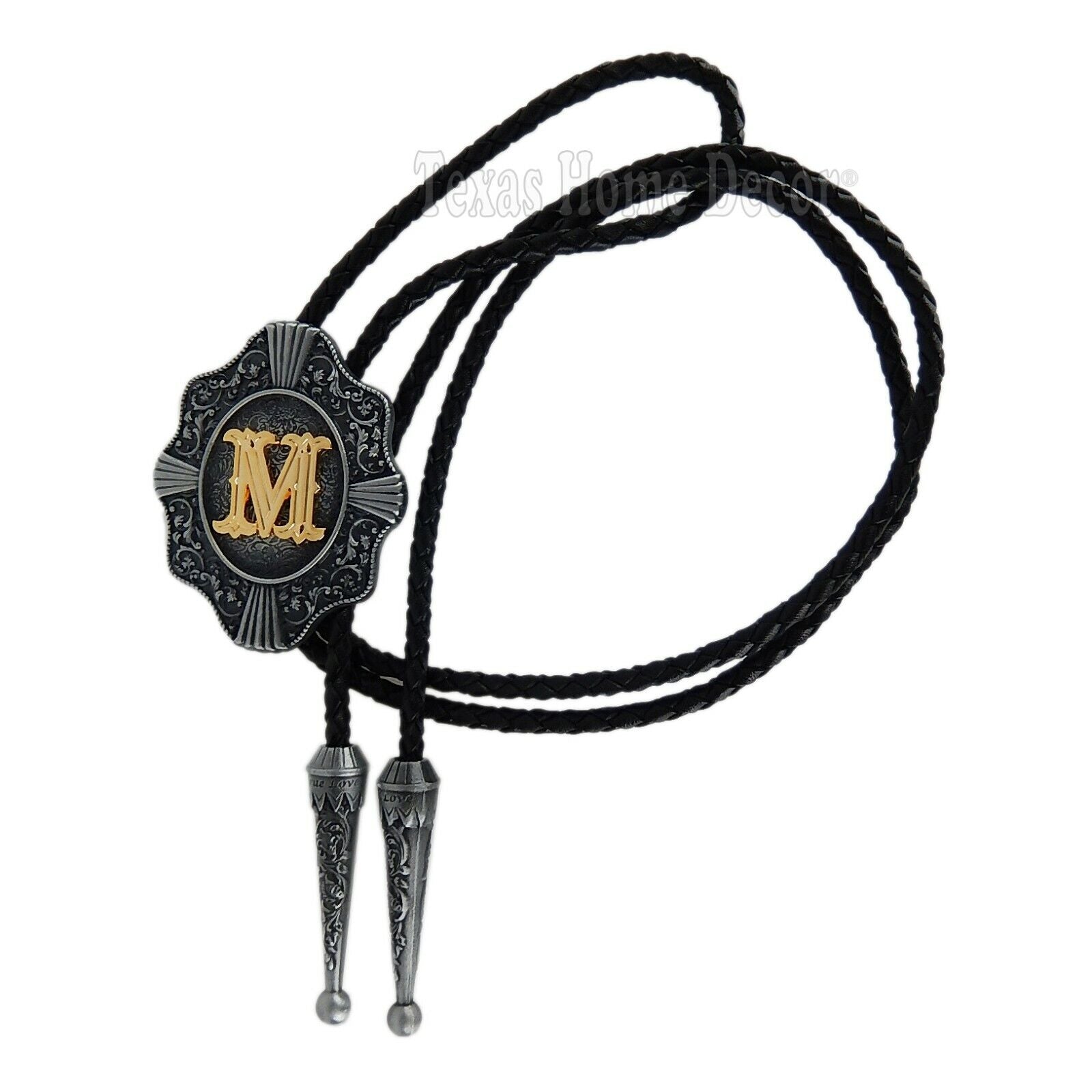 Initial Letter "M" Bolo Tie Western 38" Genuine Leather Cord Detailed Tips