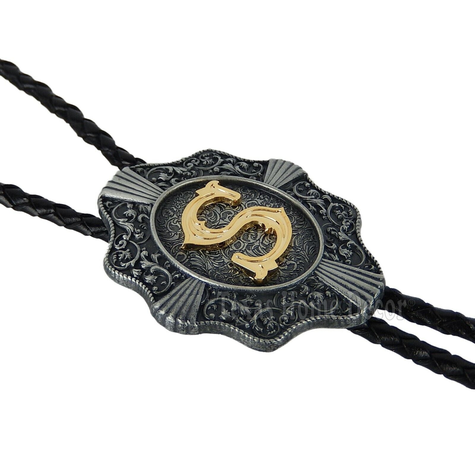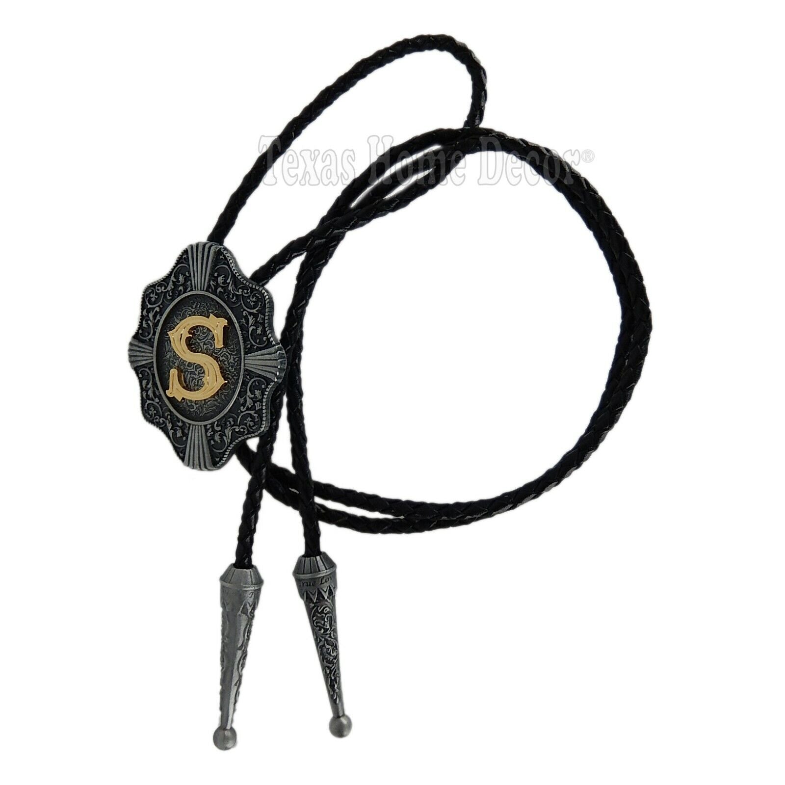 Initial Letter "S" Bolo Tie Western 38" Braided Leather Cord Detailed Tips