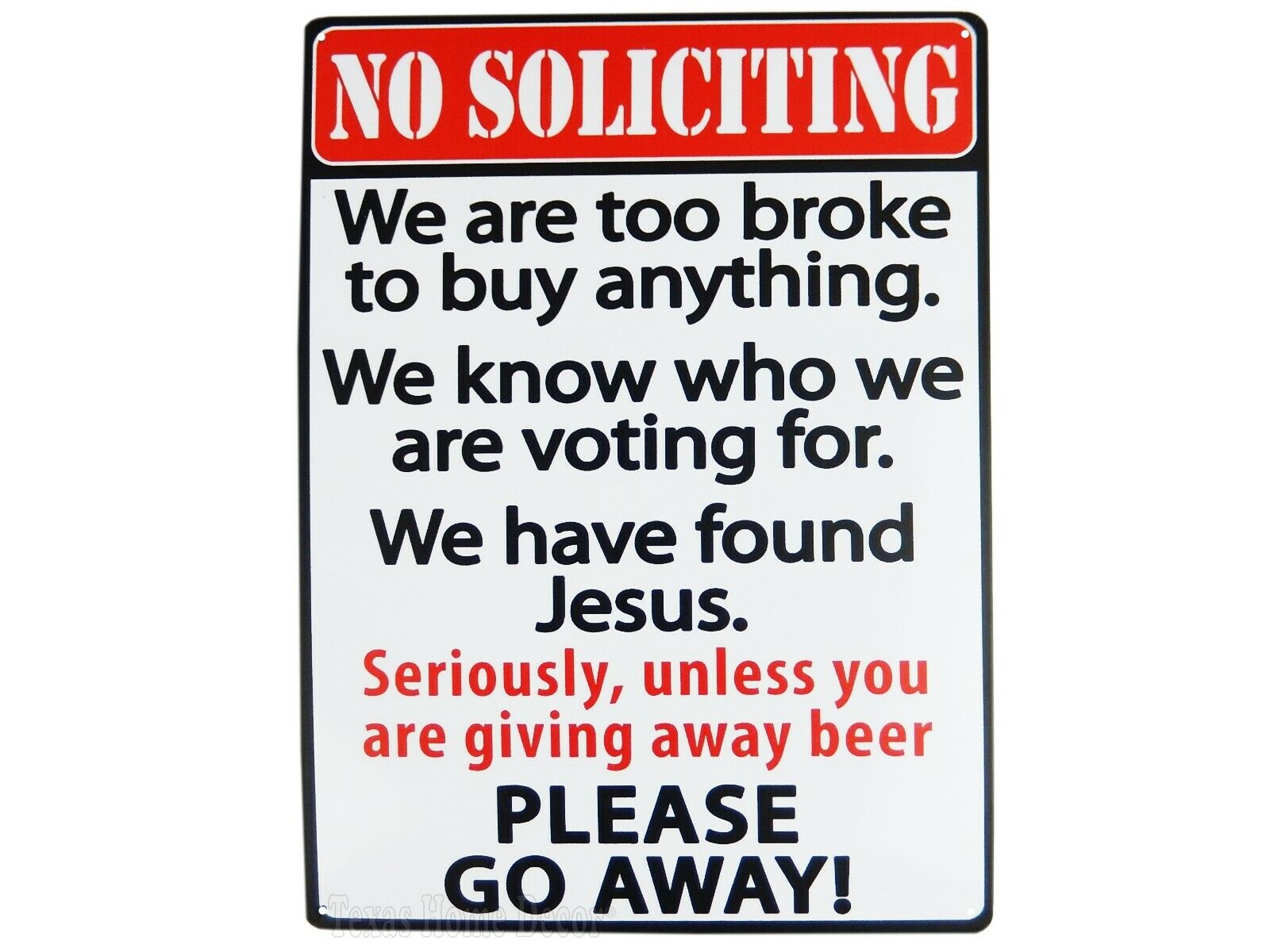 Large No Soliciting Funny Metal Tin Sign Too Broke Go Away Found Jesus 15 3/4"