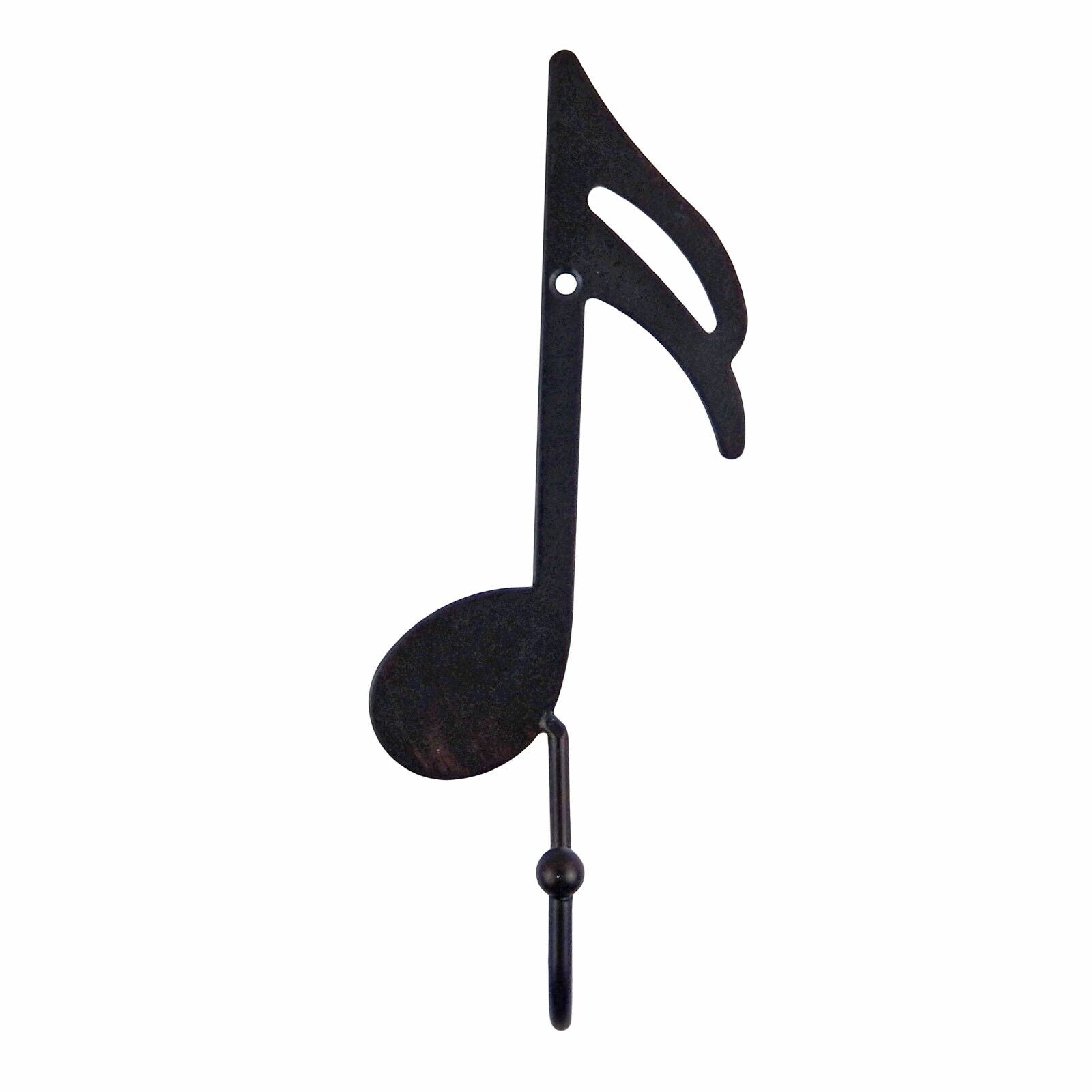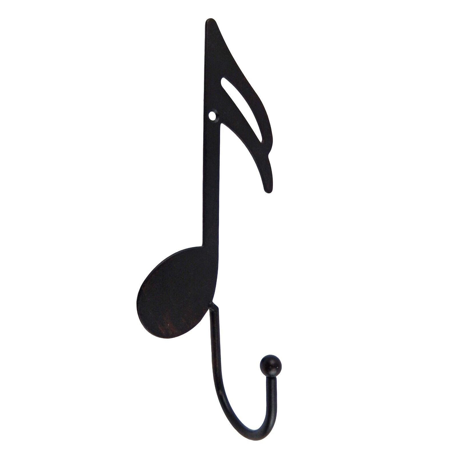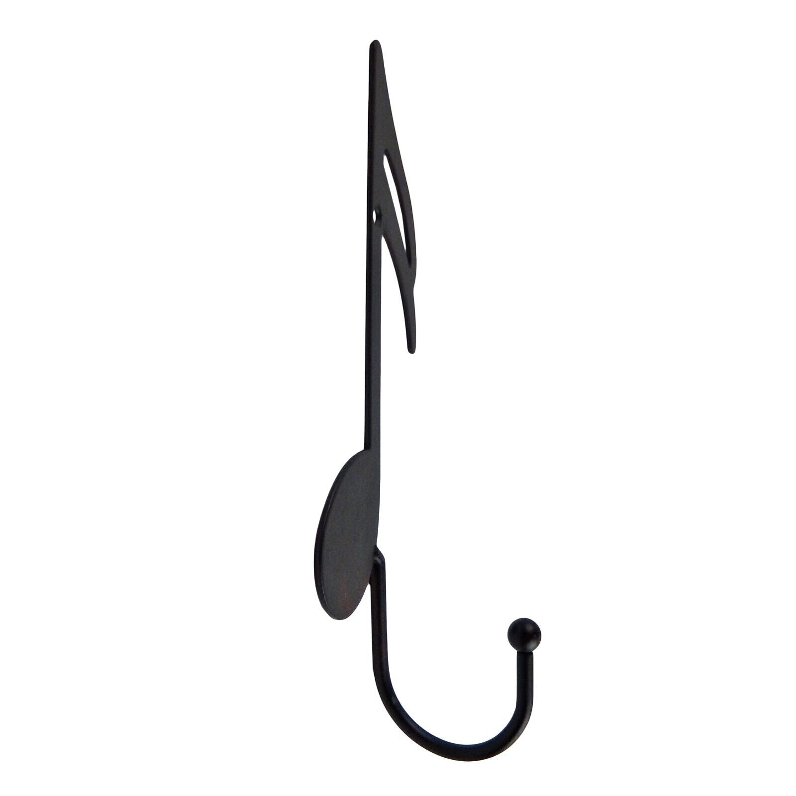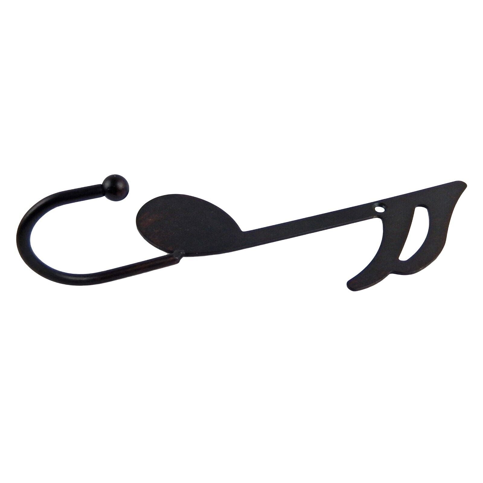 Add a touch of modern elegance to your home with this black metal 16th musical note wall hook. Perfect for hanging your coat, hat, or a decorative item, this wall hanger is easy to install and features a traditional hook style. Measuring 9 1/2 inches in height and 3 1/2 inches in width, this hanger is made of durable metal and has a matte finish. The tip of the hook sticks out 2 inches when mounted. The musical note theme adds a touch of sophistication to any room, and the easy installation makes it a hassle-free addition to your home organization. With a single hook and a light weight design, this wall hook is a versatile and practical option for any household. It comes with one screw hole to mount it. (Screw not included)