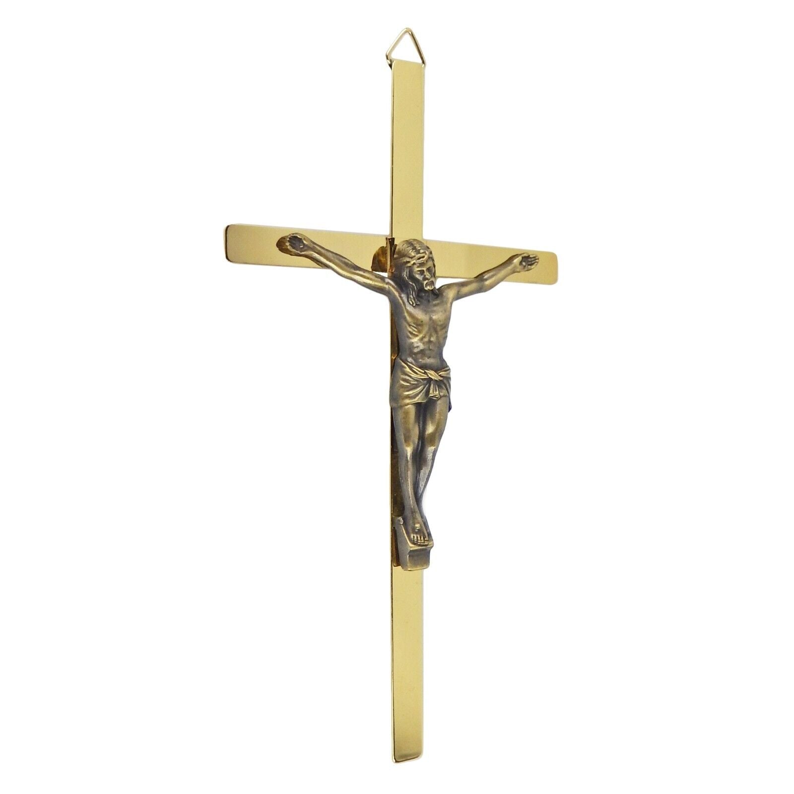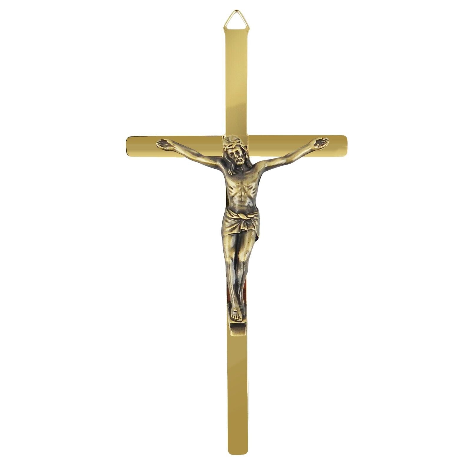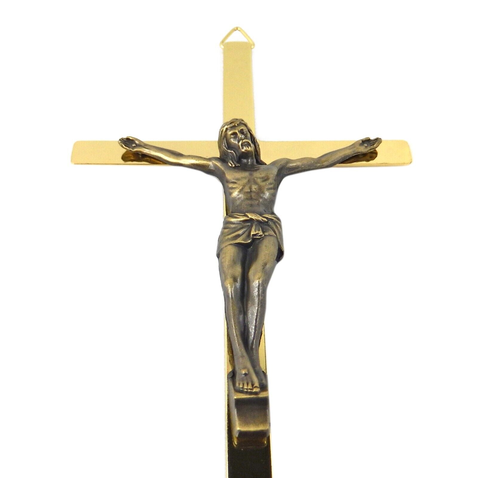 This beautiful wall cross features a metal construction with a shiny gold tone and bronze finish. Measuring 8 1/4 inches by 4 inches, it is the perfect size for any room in your home. The crucifix design makes it a great addition to any Christian home or collection.