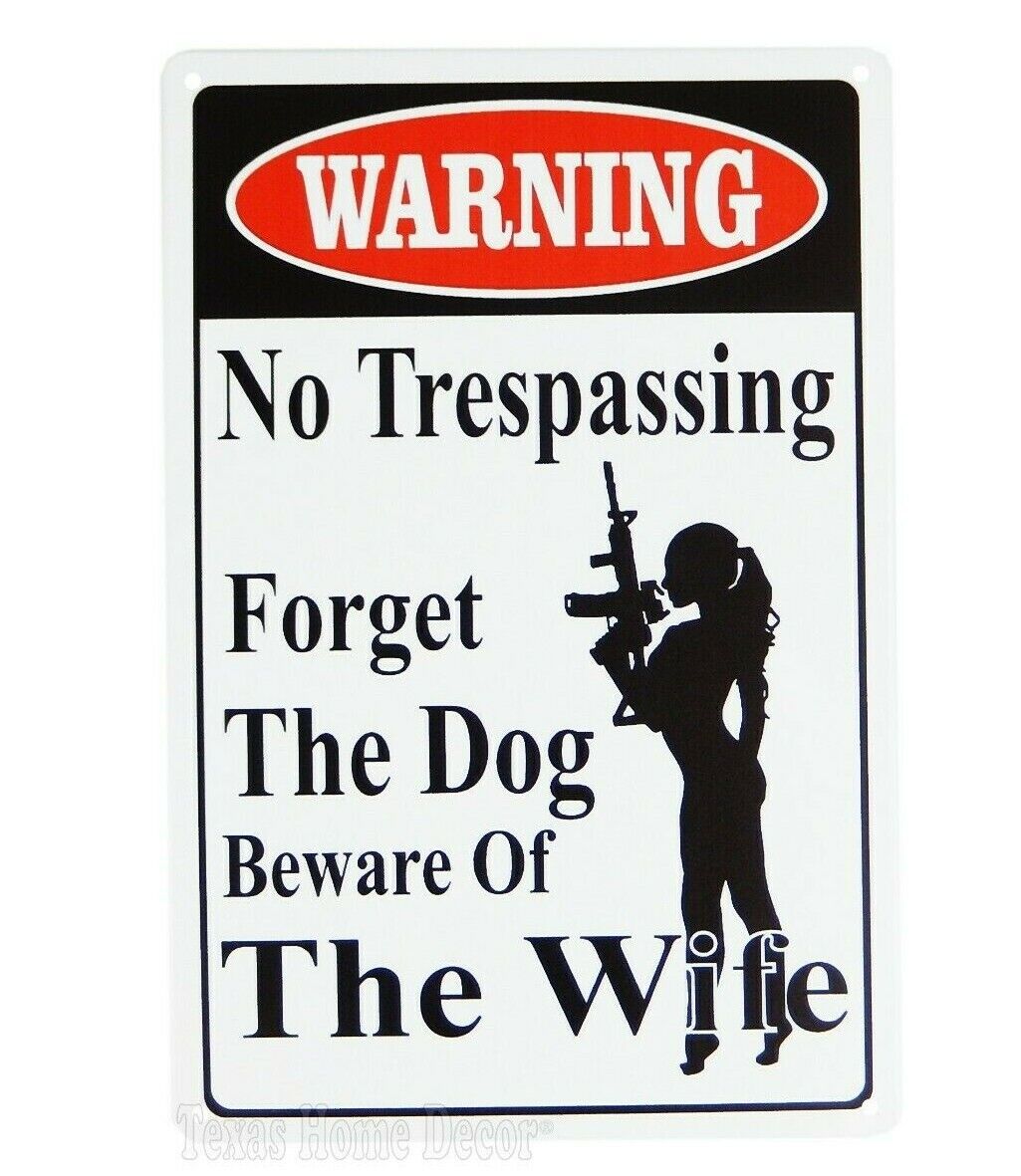 No Trespassing Metal Tin Sign Warning Forget The Dog Beware of The Wife 11 3/4"