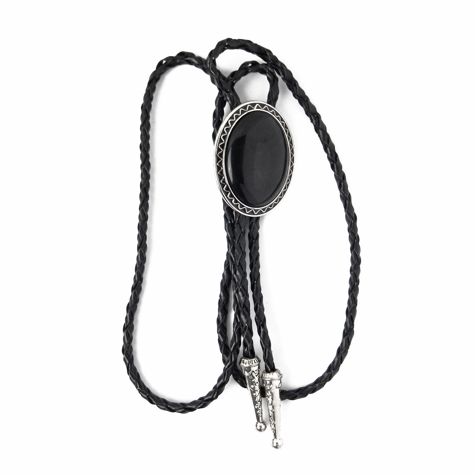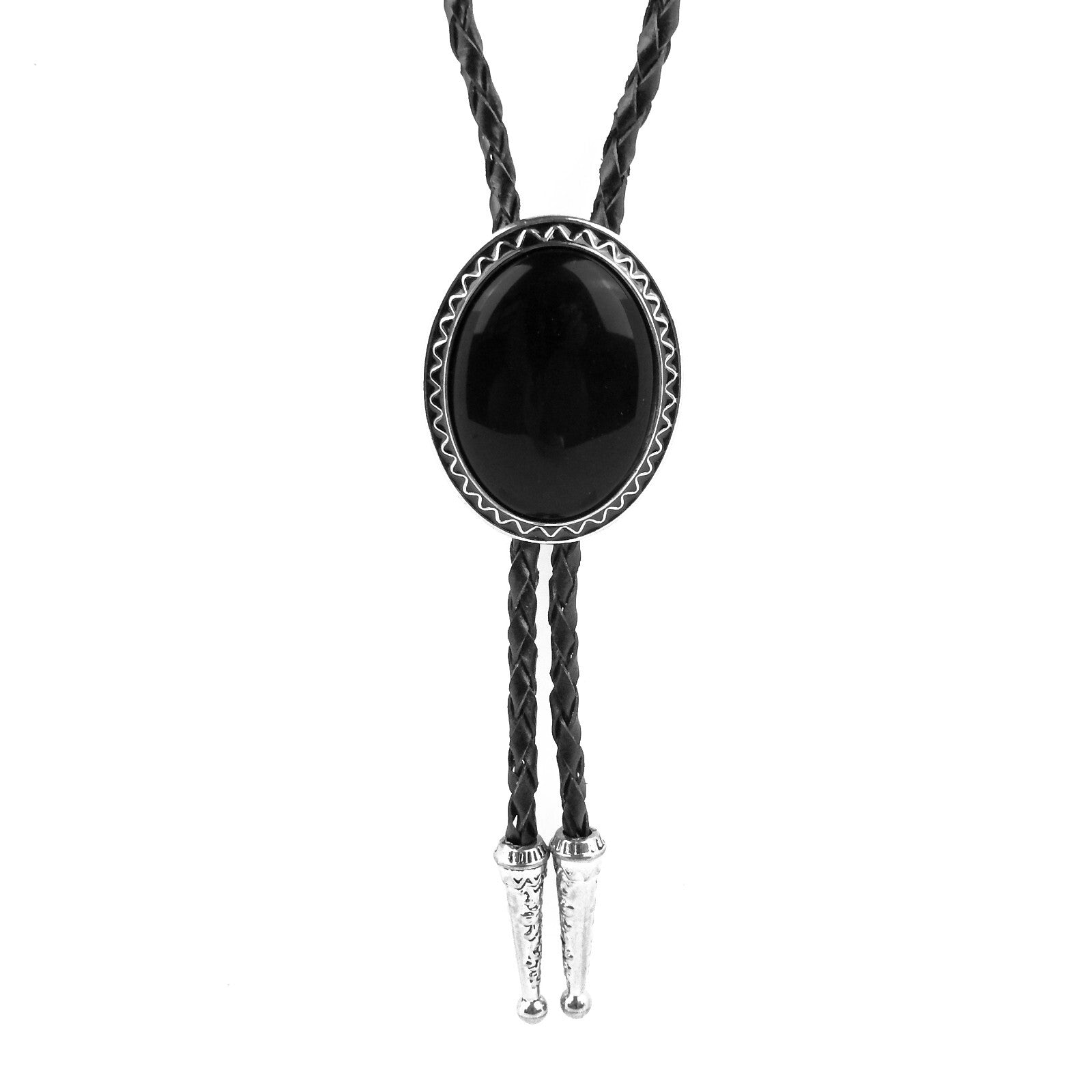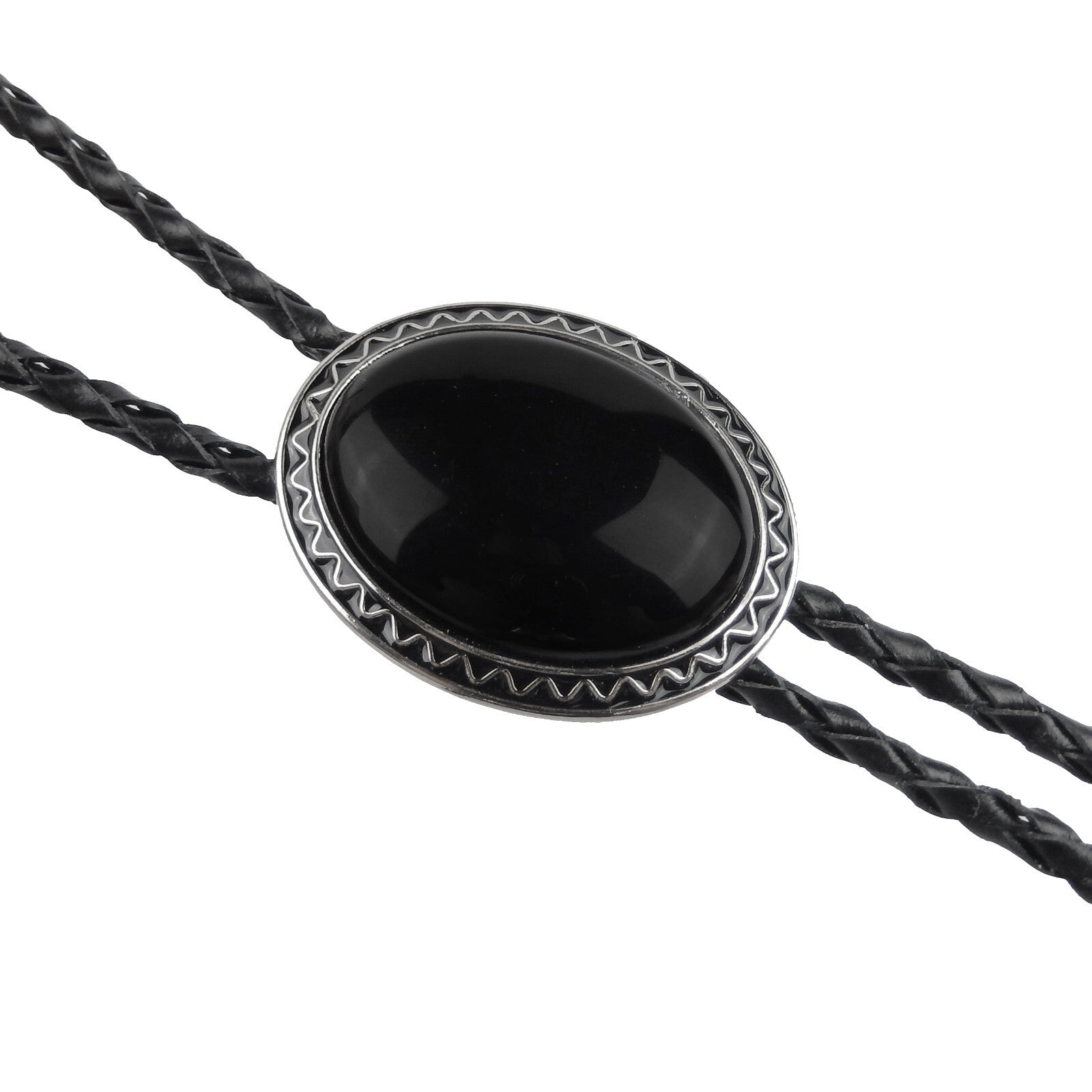 Oval Black Onyx Natural Stone Bolo Tie Silver Color 40 inch Black Leather Cord