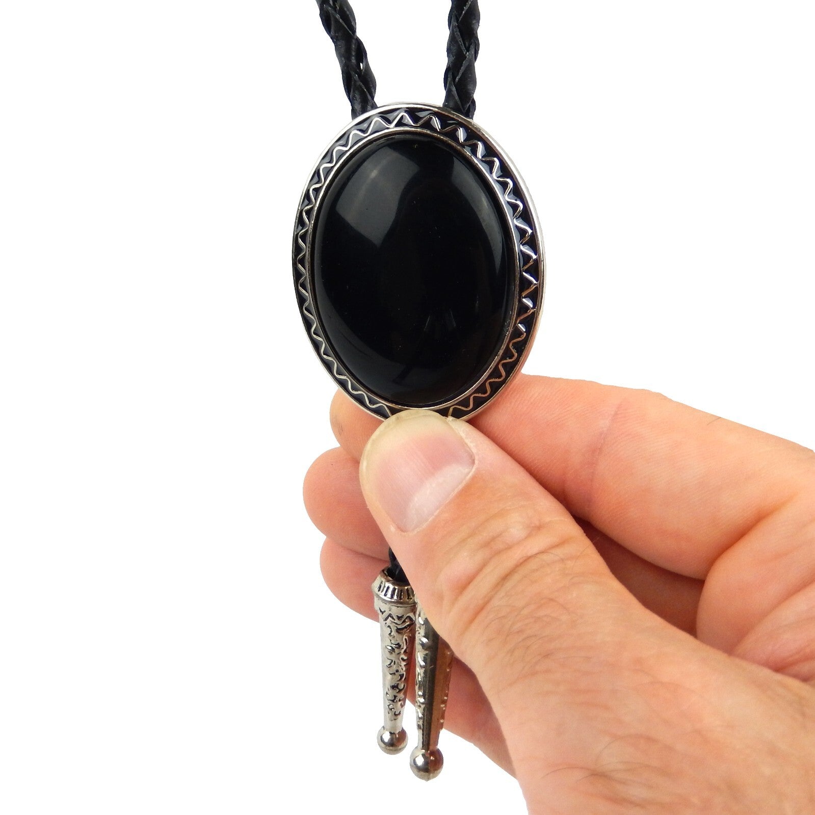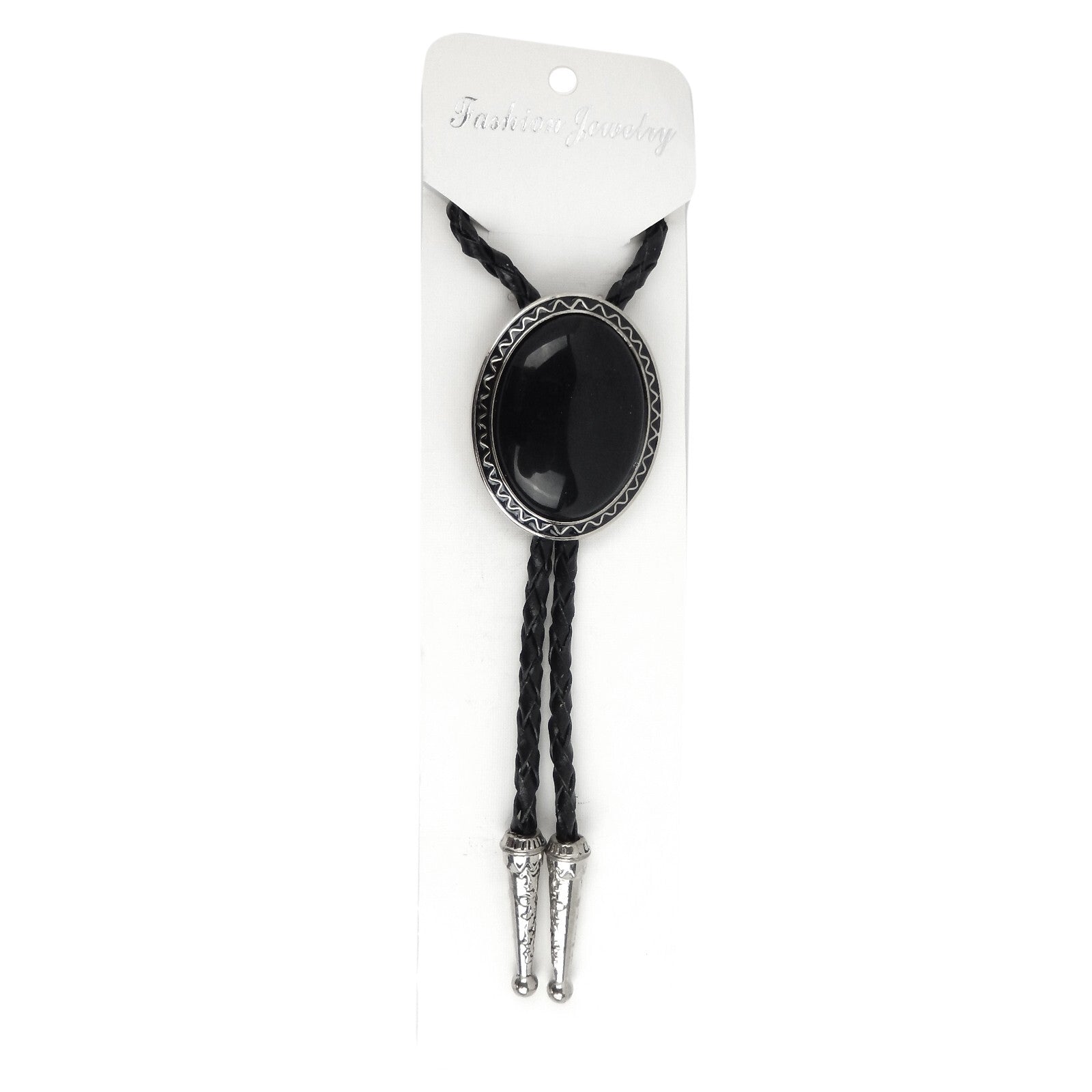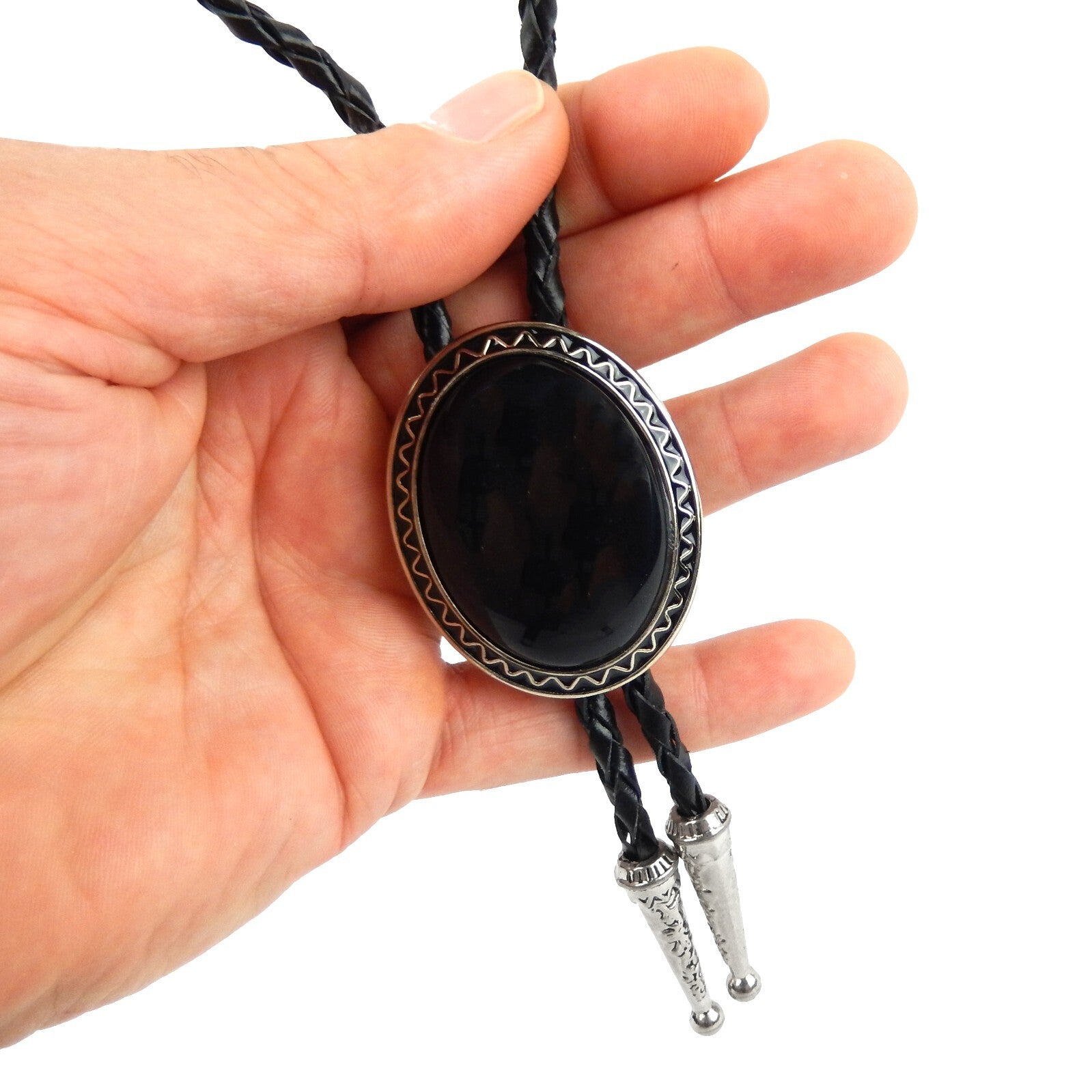 Oval Black Onyx Natural Stone Bolo Tie Silver Color 40 inch Black Leather Cord