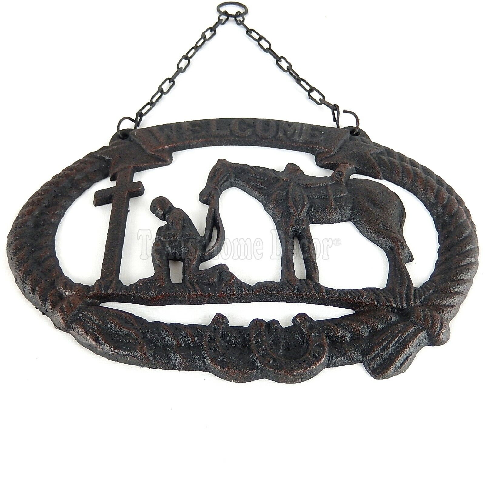 Praying Cowboy Welcome Sign Plaque Cast Iron Rustic Western Horseshoes Rope