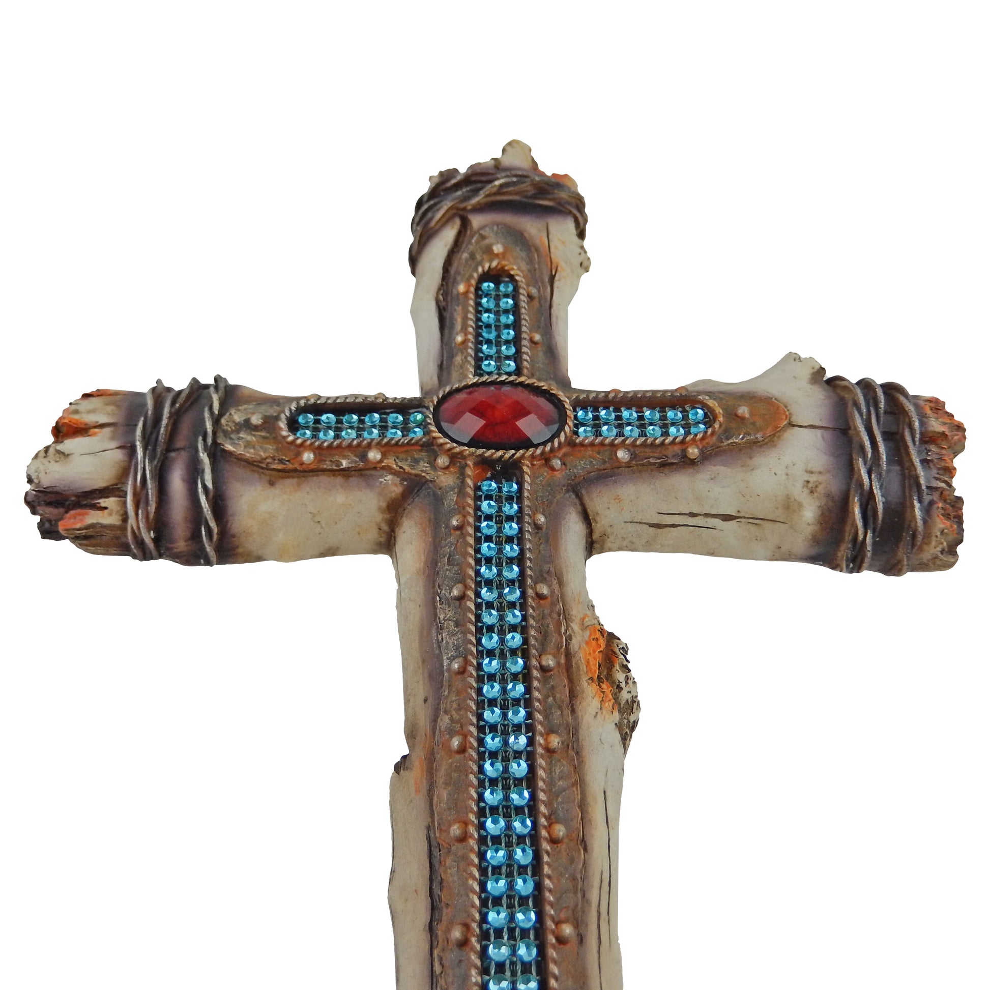 Introducing our newest addition to our collectibles line - the Red Stone Wall Cross. This piece is crafted with precision and attention to detail, making it a must-have for any collector. Made of high-quality polyresin, each cross is hand painted to perfection, ensuring a unique and flawless finish. Measuring at 16 1/4 inches tall and 9 1/4 inches wide, this cross is the perfect size to hang on any wall in your home. The striking design features inlay blue stones and a bold red faceted stone at the center, adding a touch of elegance and spirituality to any room. The wood look body of the cross is accented by wrapped faux wire, giving it a rustic and authentic feel. This layered design adds depth and dimension to the cross, making it a true statement piece. Perfect for those who appreciate religious and spiritual symbolism, this Red Stone Wall Cross is a beautiful representation of Christianity. It is a meaningful and thoughtful gift for loved ones or a special addition to your own collection. Don't miss out on this unique and stunning piece. Add the red stone wall cross to your collection today and bring a touch of faith and beauty into your home.