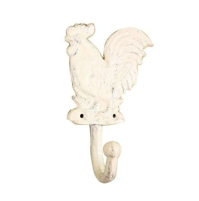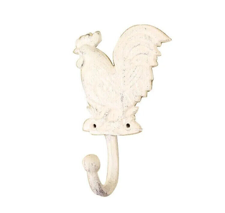 Rooster Wall Hook Hanger Cast Iron Whitewashed Rustic Country Antique Style 6.5"