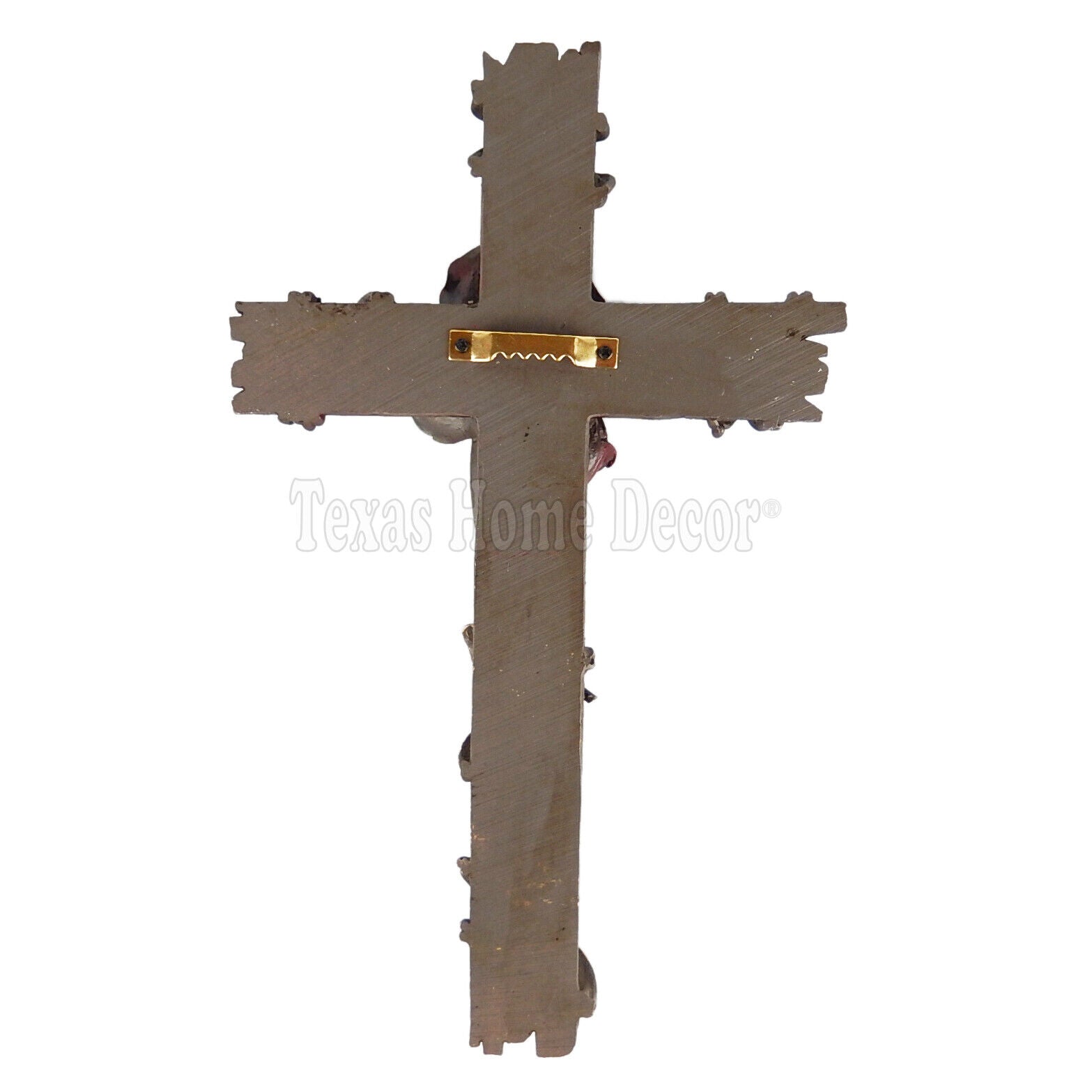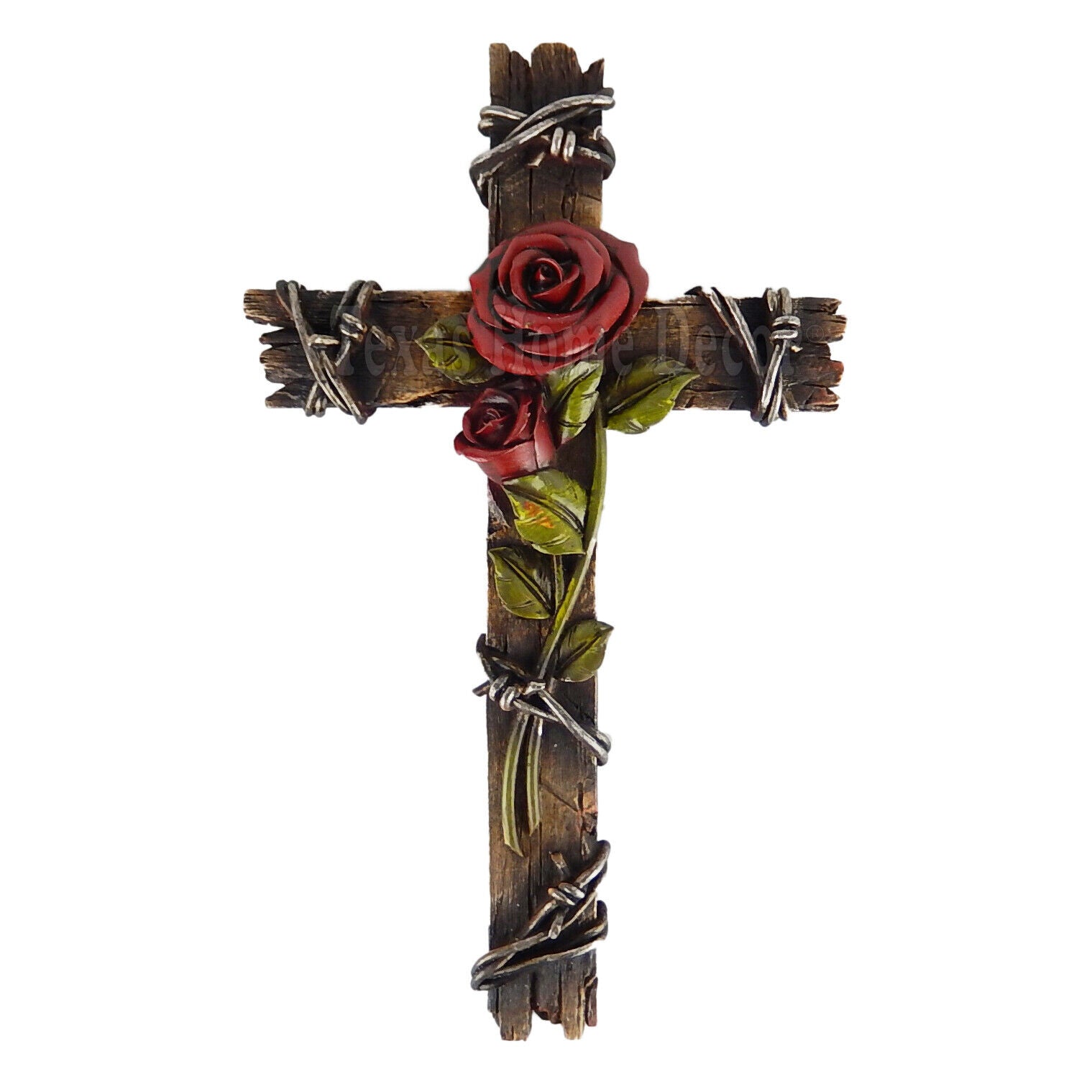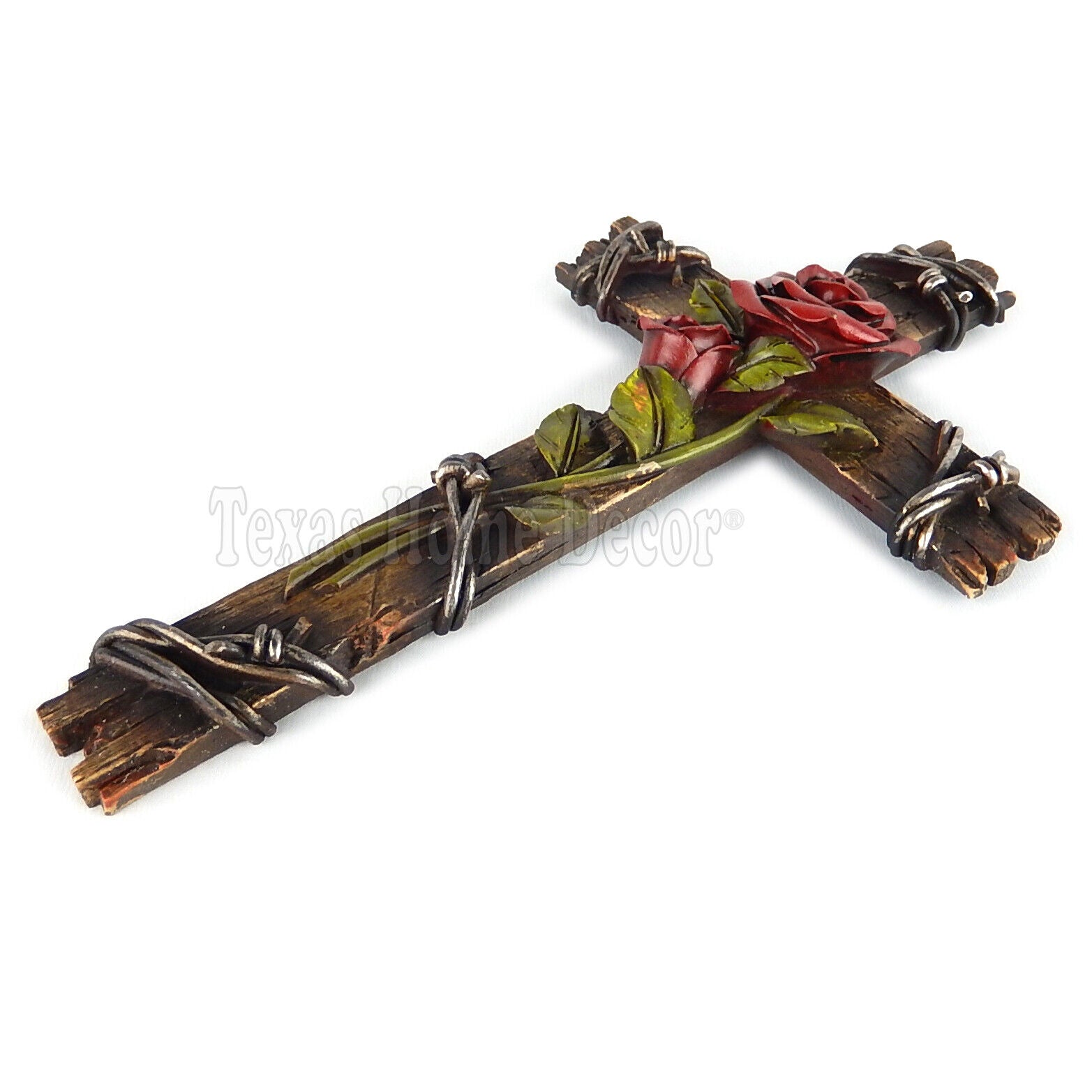 Rose Flower Wall Cross Faux Wood Look Barbed Wire Hand Painted Polyresin 10 x 6"