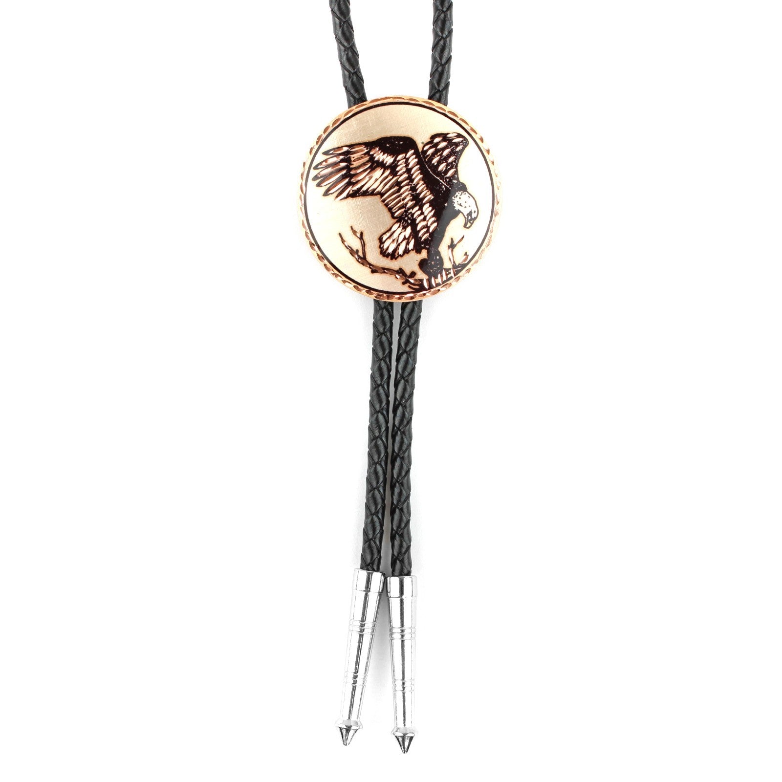 This bolo tie features a beautiful American eagle design. It was handcrafted in the USA on copper metal with diamond cut detailed edges. Every piece is protected by a clear lacquer finish which does not require polishing. This is a great piece to enhance your western attire or to give as a special gift.