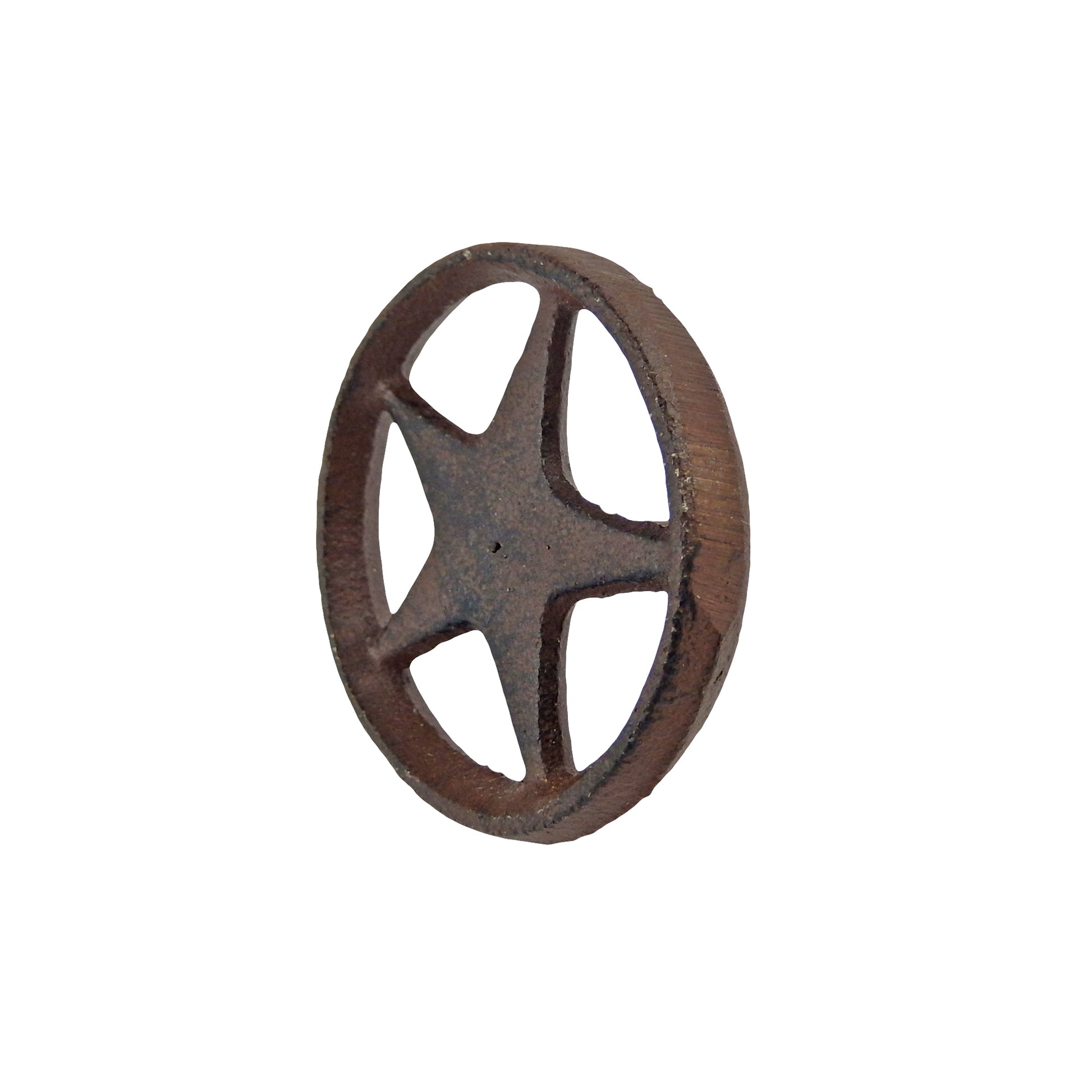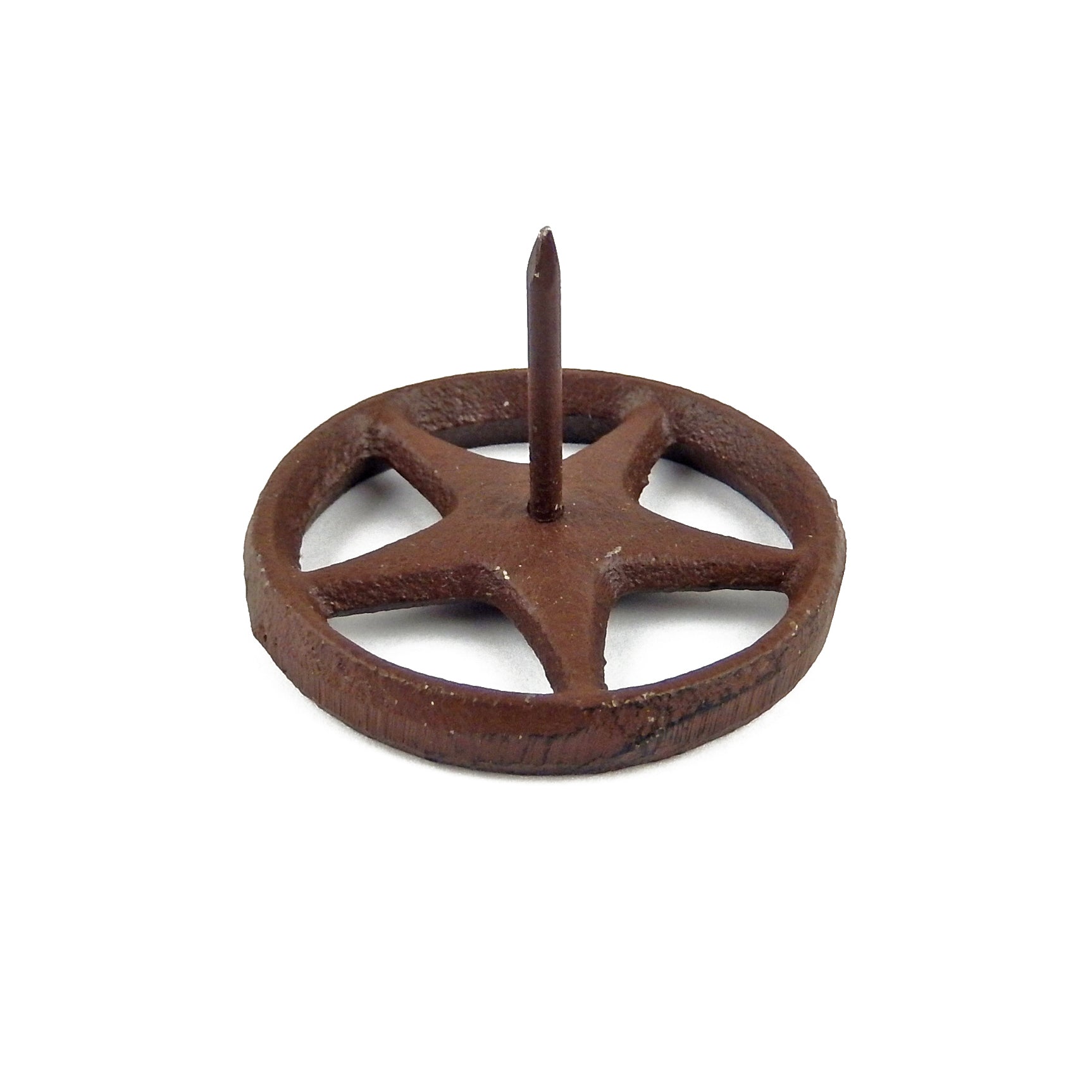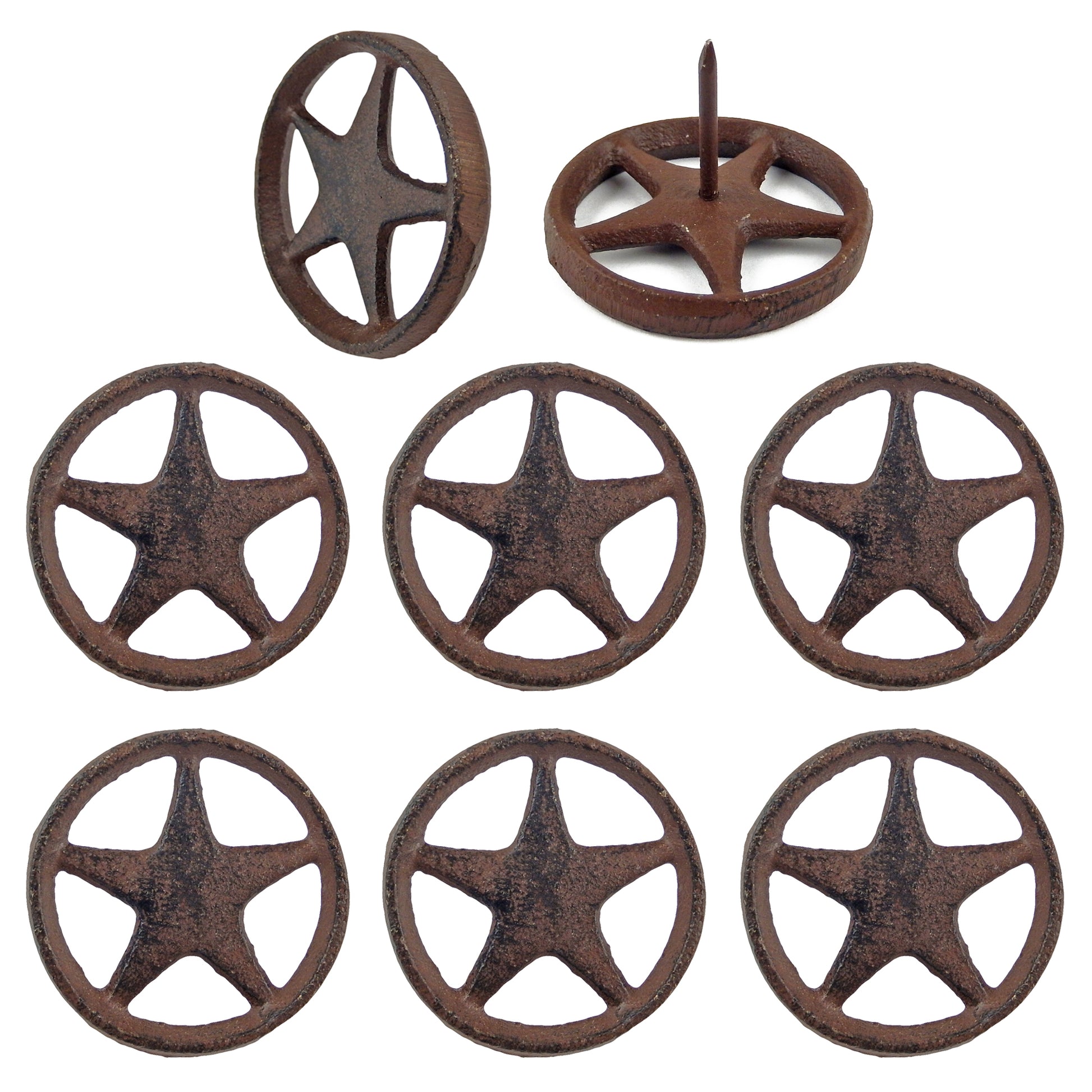 Introducing our set of 6 Cast Iron Star Ring Craft Pins, perfect for adding a touch of rustic charm to your home or garden. Made from durable cast iron with a rustic brown finish, these star nails are both functional and decorative. Each star measures 2 1/4 inches in diameter and comes with a 1 inch nail, making them versatile for a variety of projects. Use them for custom work in your home, garden, or even for building and hardware projects. These pins are a must-have for any DIY enthusiast or lover of western decor. Upgrade your space with our 6 Cast Iron Star Ring Craft Pins today.