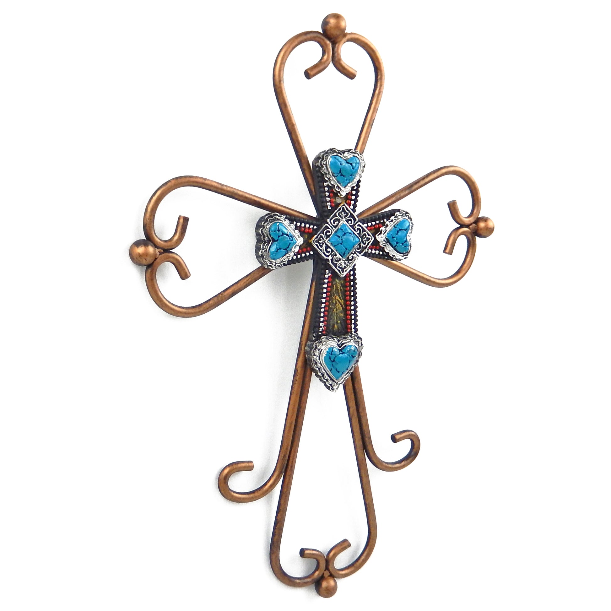 Scrolls Metal Layered Wall Cross Painted Turquoise Heart Diamonds 12 inch