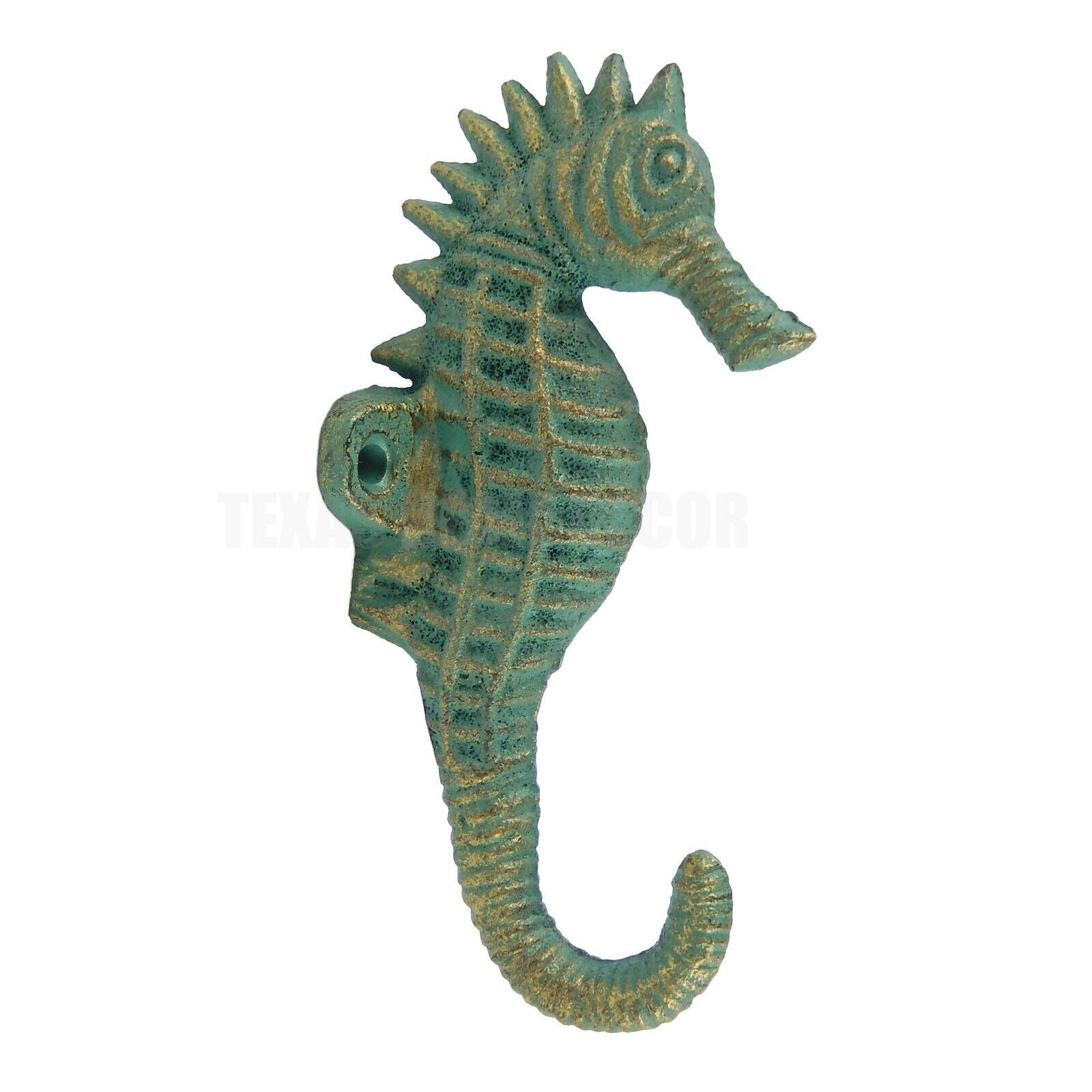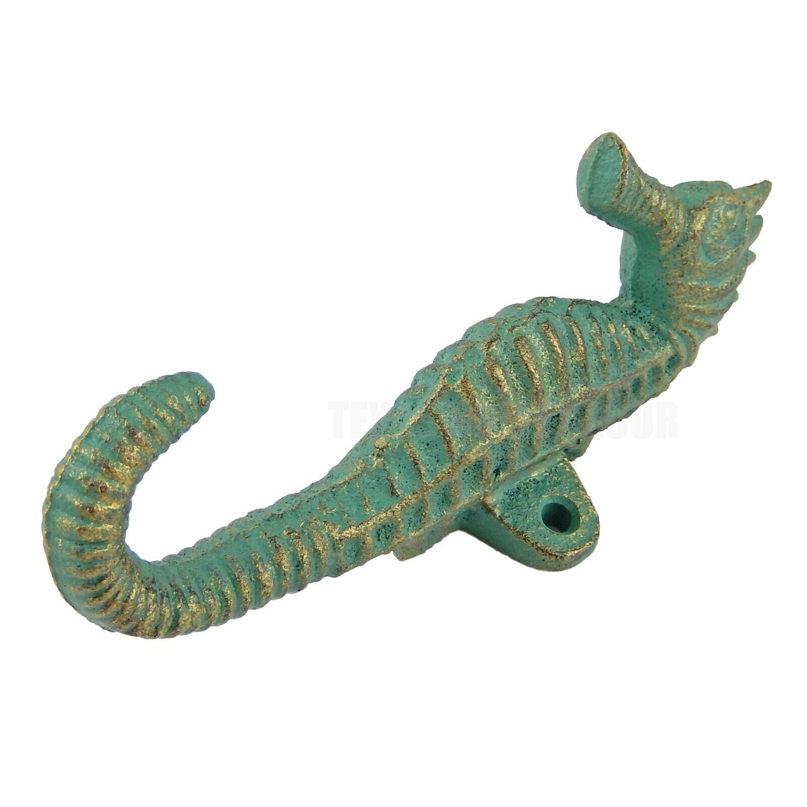 Seahorse Wall Hook Cast Iron Nautical Key Towel Coat Hanger Verdigris Green 5.5"