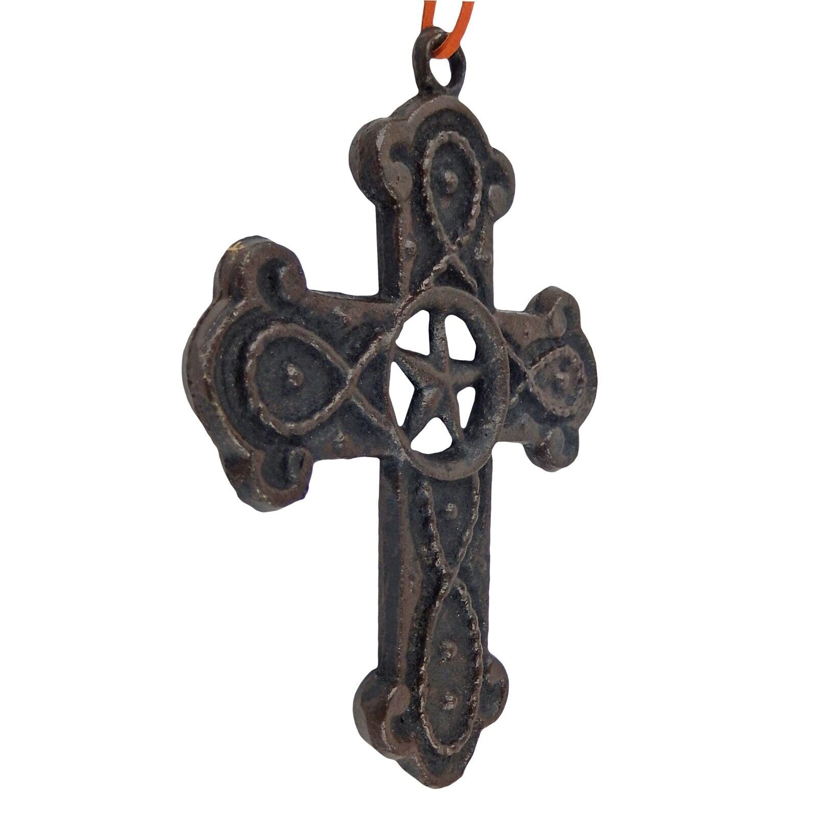 This Small Cast Iron Star Wall Cross is a unique and beautiful addition to any home decor. The cross features a rustic dark brown color, with a star and scrolls theme, and is made of durable cast iron. Measuring 6 1/4 inches tall by 4 3/4 inches wide (without ribbon), and with a thickness of 1/4 inch, this double-sided cross is perfect for hanging on a wall or door. With its Christian theme and religious significance, this cross is a perfect gift or collectible for anyone who loves Christianity or spirituality. The hanging ribbon adds an extra touch of charm to the cross. This item is perfect for anyone looking for a decorative and functional piece that will add elegance and style to their home.