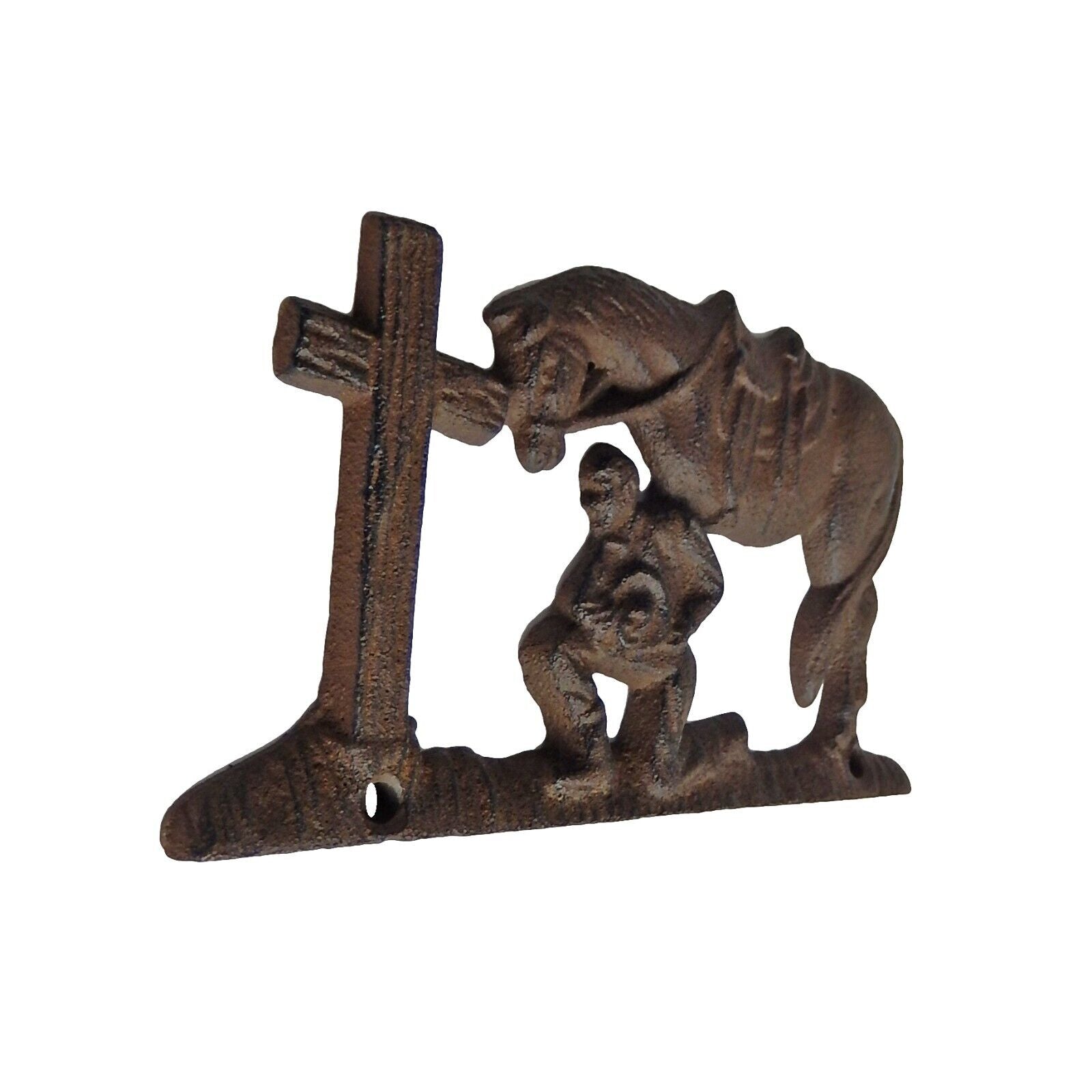 Add an authentic western touch to your home decor with this small cast iron wall plaque featuring a cowboy kneeling at a cross with his horse. The rustic brown color with a rusted look and antique finish adds to the charm of this decorative piece. The plaque, measuring 5 3/4 inches in width and 3 1/4 inches in height, is wall-mounted and can be placed in any room, entryway or porch. The horse-shaped plaque with a cowboy subject, rustic/primitive style and horse theme is ideal for lovers of western decor. Made of cast iron, this plaque is durable and long-lasting. It is perfect for those who appreciate the aesthetic appeal of rustic decor and want to add a touch of the Old West to their homes. It comes with two pre drilled screw holes for easy mounting. (Screws not included)