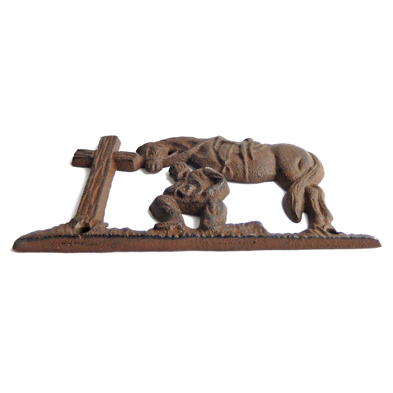 Small Rustic Cast Iron Cowboy Kneeling At Cross With Horse Wall Decor 5 3/4 in #56553