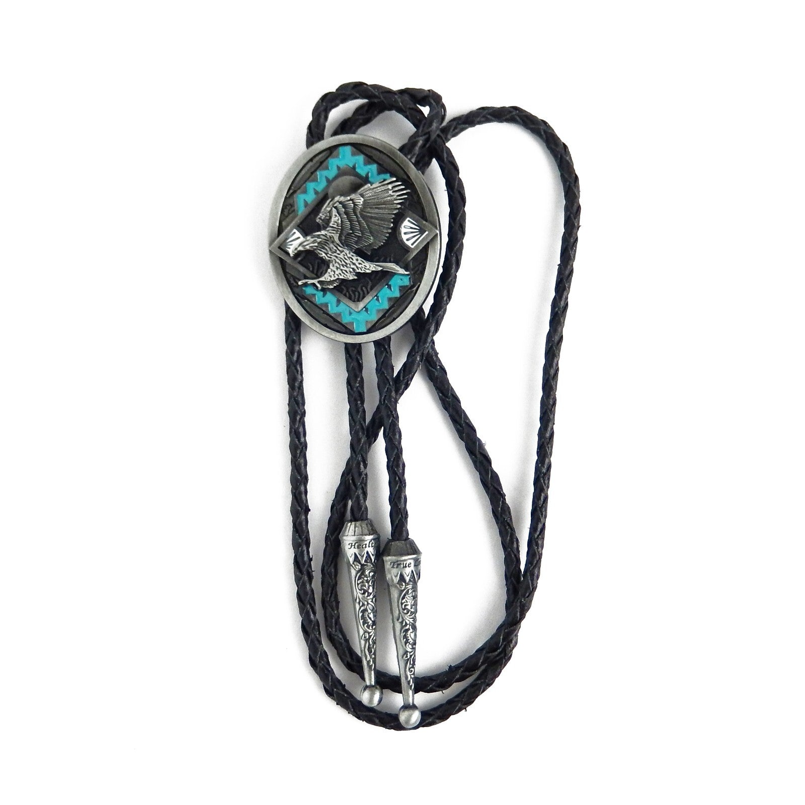 Southwestern Aztec Eagle Turquoise Geometric Bolo Tie 40 inch Black Leather Cord