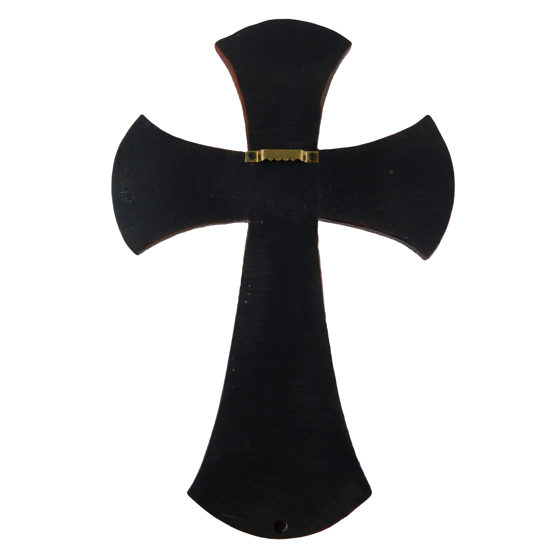 Introducing our new Southwestern Aztec Wall Cross, the perfect addition to any home decor. This minimalistic cross is made of high-quality polyresin and was carefully hand painted to capture the intricate details of the Aztec design. Measuring 11 3/4 inches tall by 7 3/4 inches wide, it is the ideal size to hang on any wall. The leather look of the cross is accented by silver with beautiful turquoise color Conchos, adding a touch of elegance to the piece. The back of the cross features a sawtooth metal piece for easy hanging. This collectible item is perfect for those interested in religion and spirituality, specifically Christianity and crucifixes. Elevate your home decor with our Southwestern Aztec wall cross today.