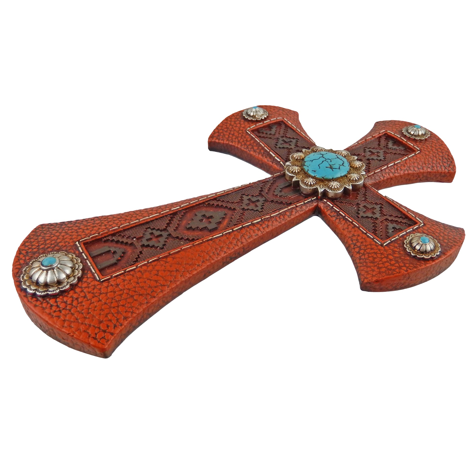 Southwestern Aztec Wall Cross Turquoise Silver Concho Brown Leather Look 11.75 inch #RSD-1619