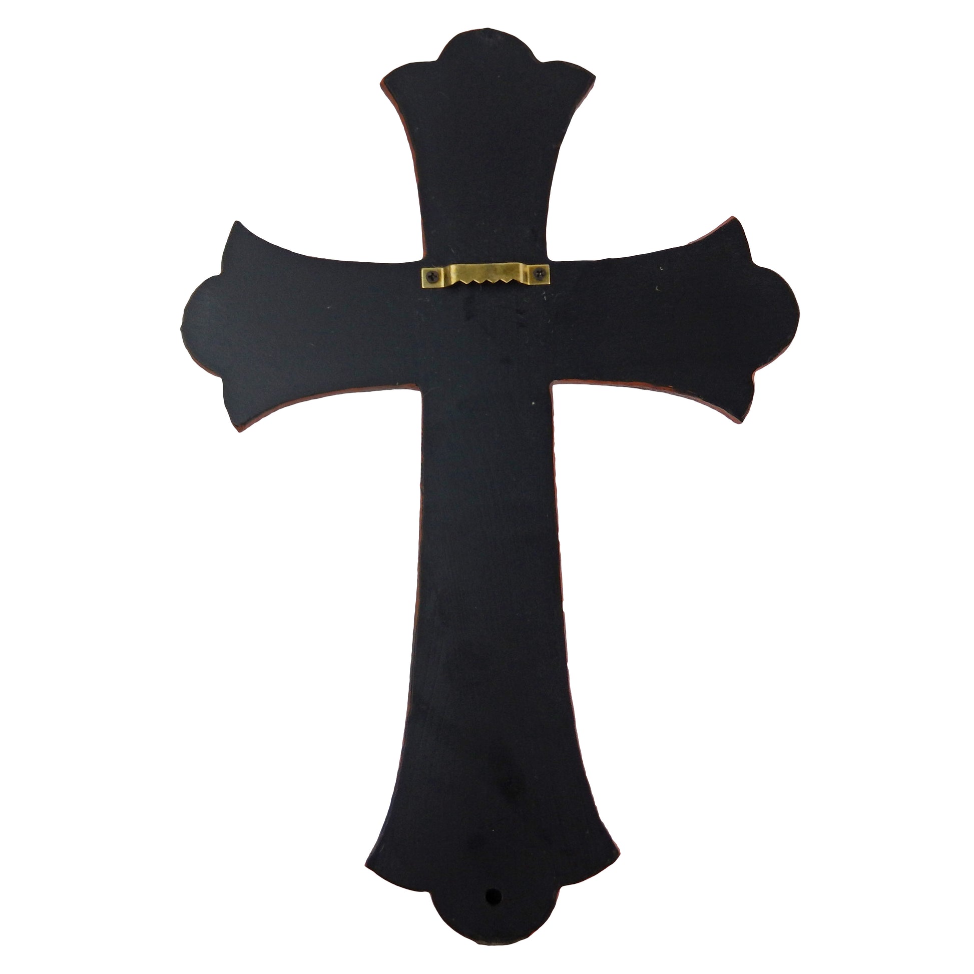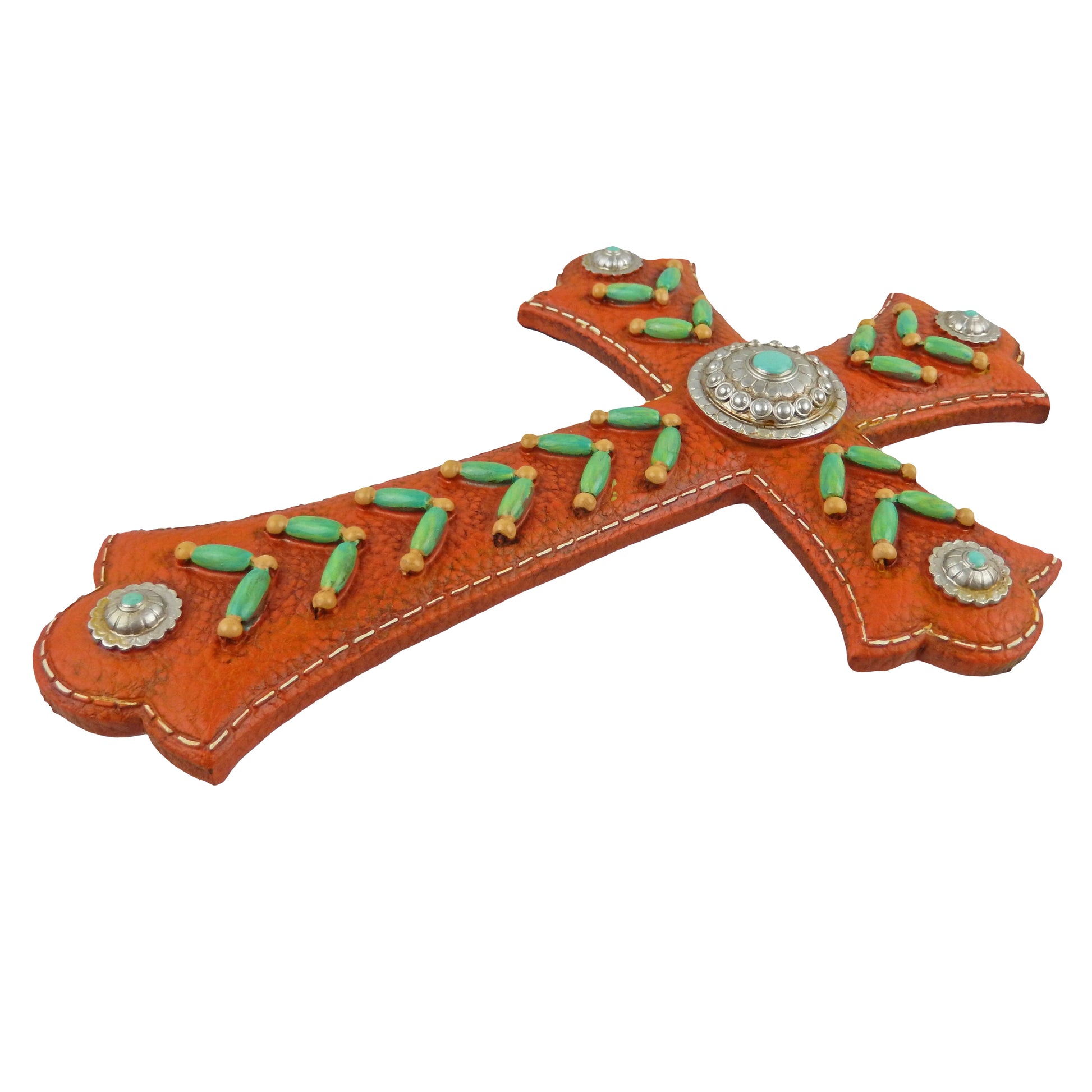Introducing our new Southwestern Turquoise Beads Wall Cross, the perfect addition to any home decor. This minimalistic yet eye-catching cross is made of durable polyresin and hand painted for a unique and authentic look. Measuring 11 3/4 inches tall by 8 inches wide, it is the perfect size to hang on any wall. The light brown leather look is accented by silver Conchos and faux turquoise beads, adding a touch of rustic charm to any room. The back of the cross features a sawtooth metal piece for easy hanging. This cross is not only a beautiful piece of decor, but also a collectible for those interested in religion and spirituality. Add a touch of Southwestern style to your home with this unique wall hanging cross.