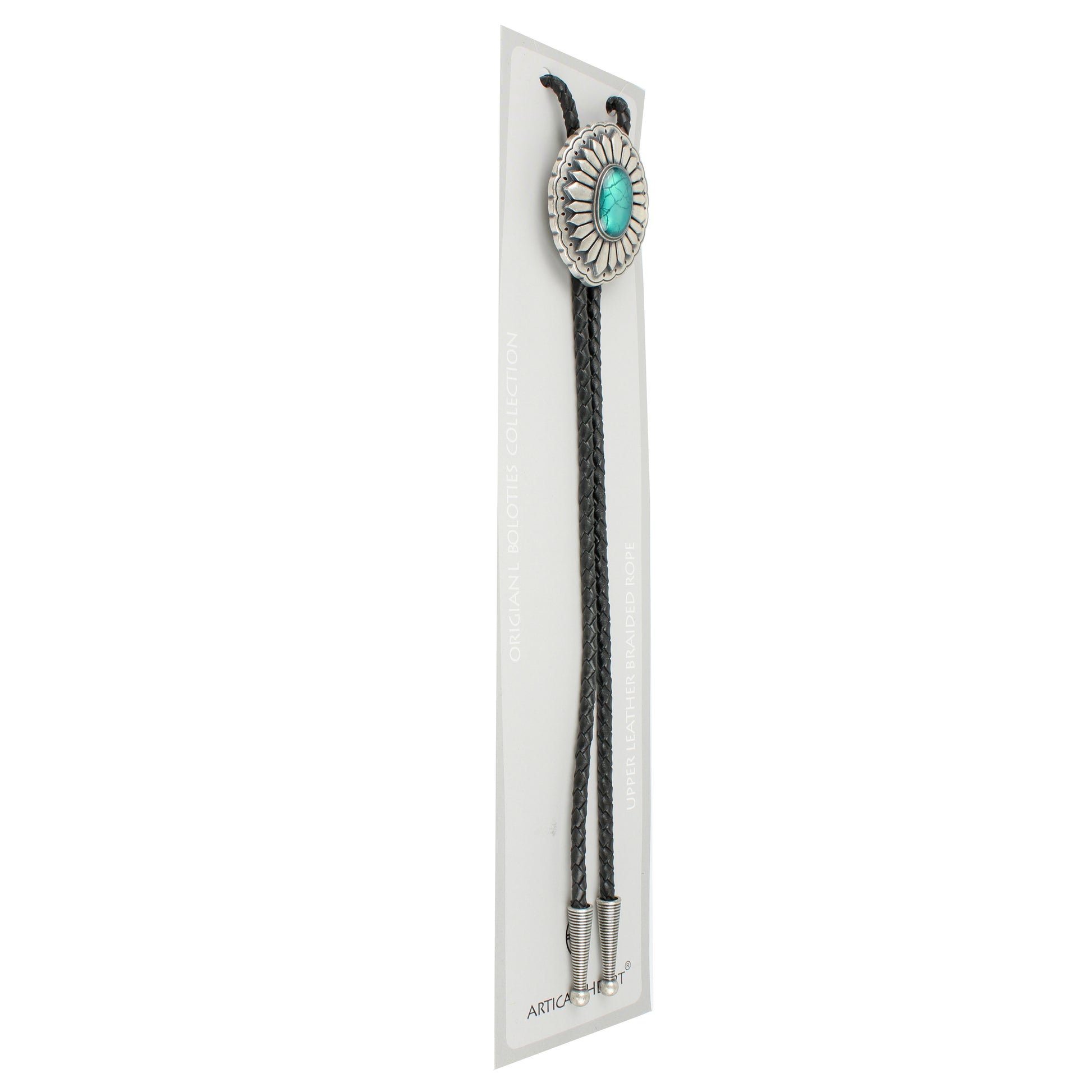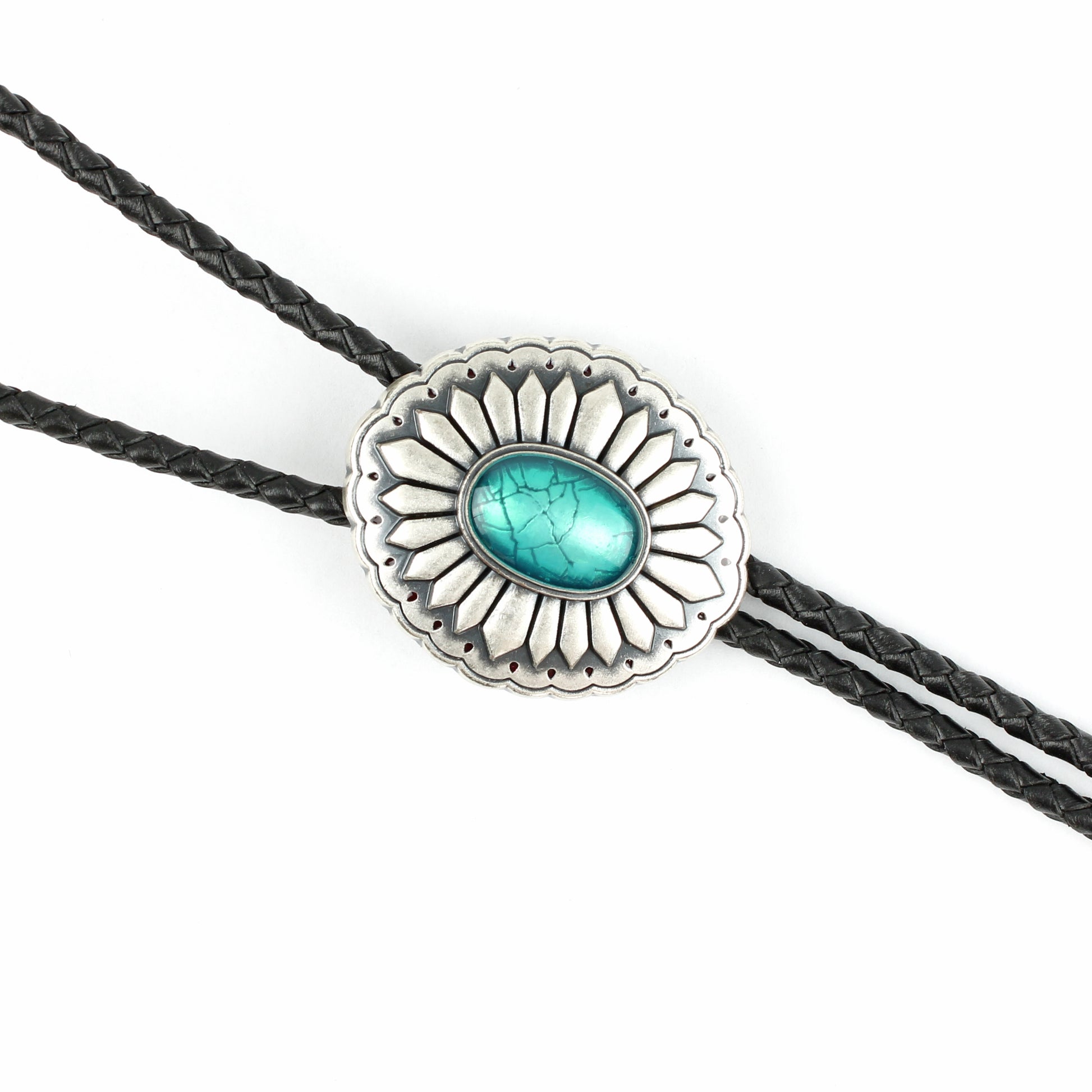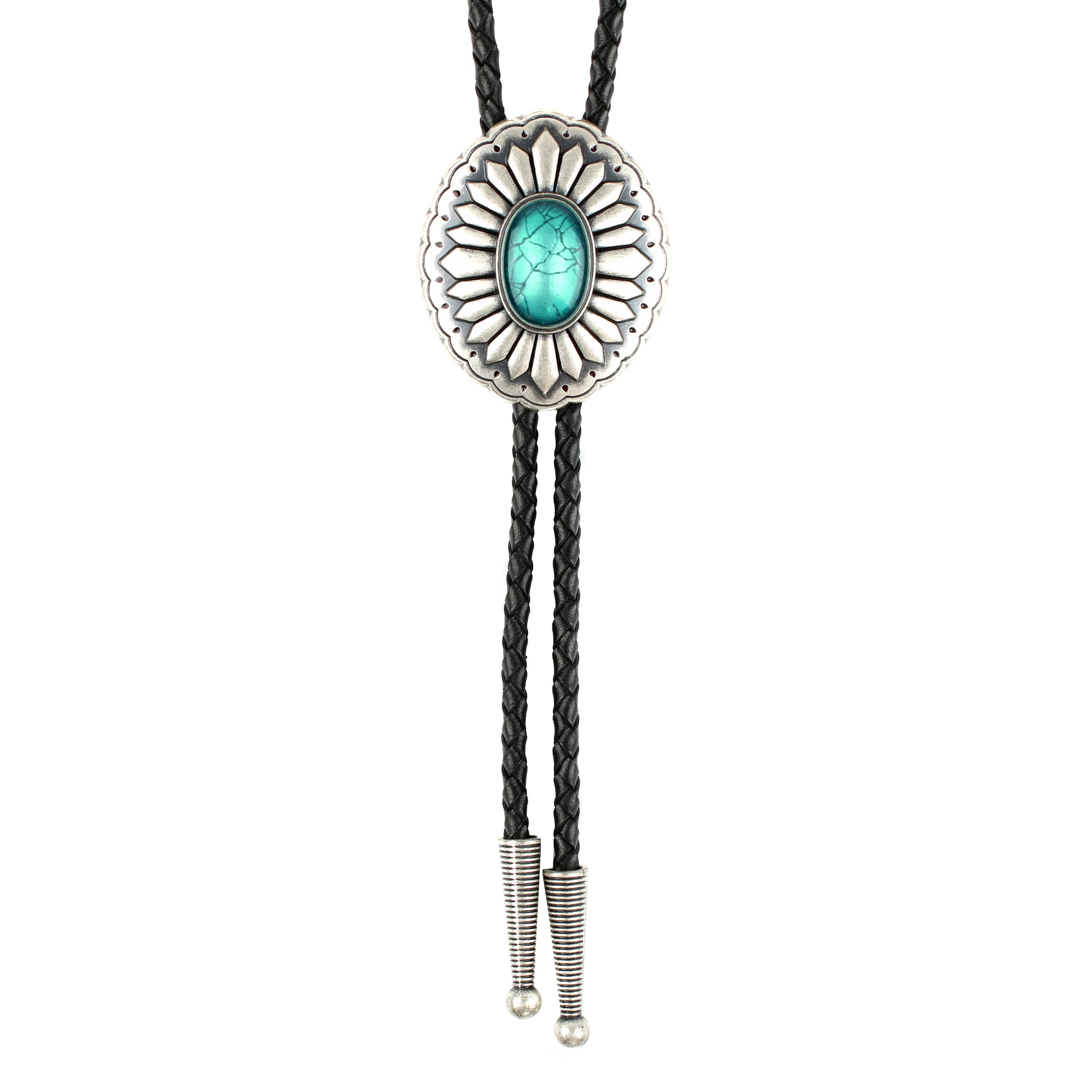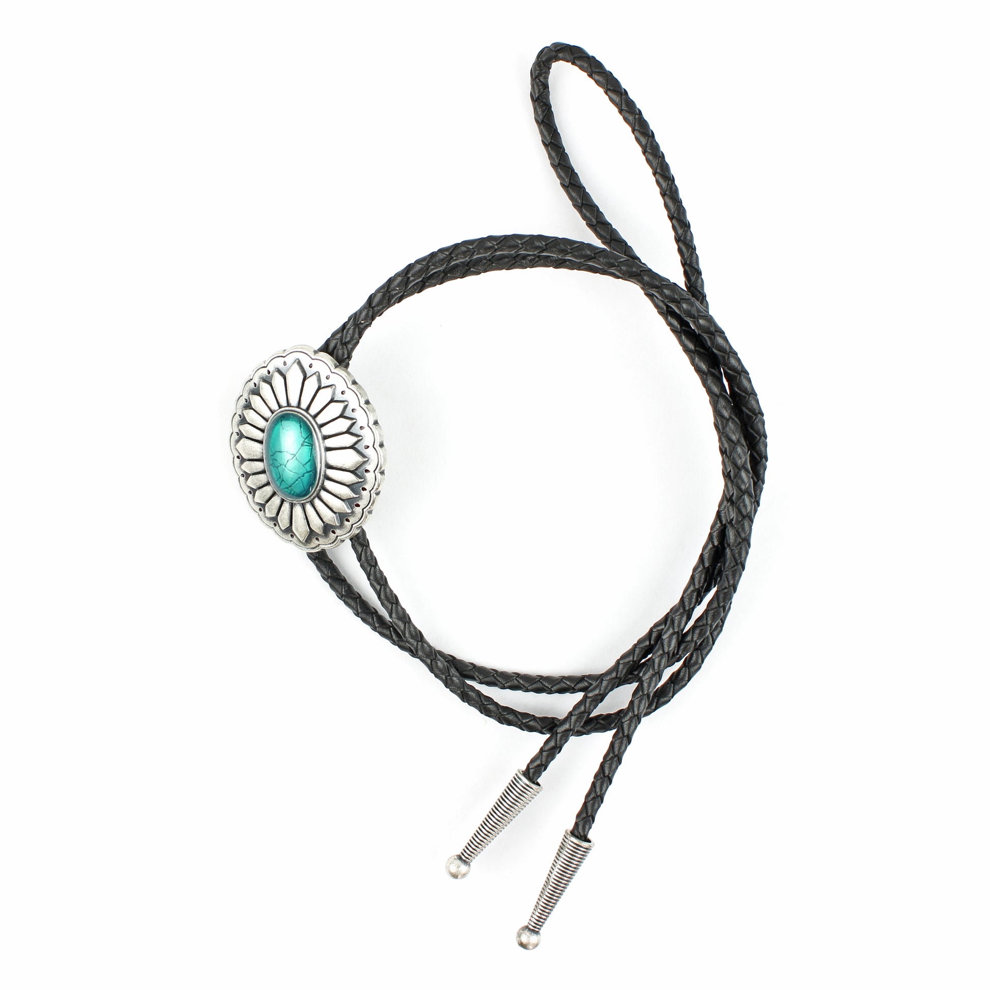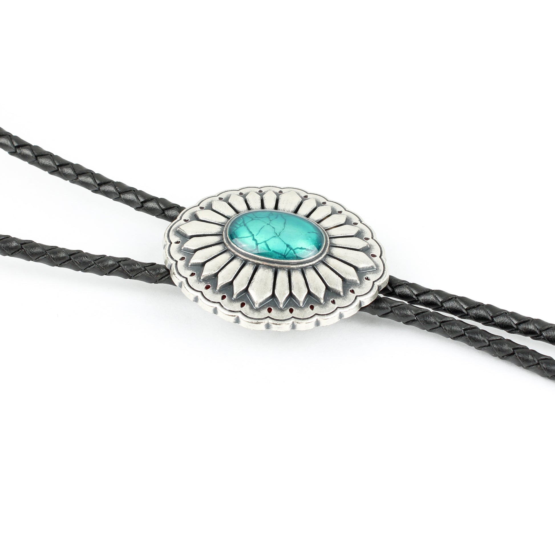 Southwestern Turquoise Bolo Tie Real Silver Plated 38" Adjustable Leather Cord