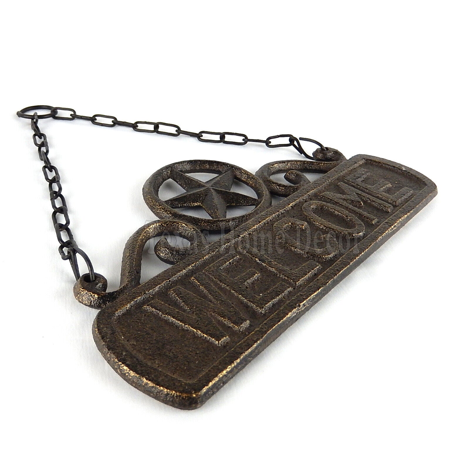 Star Welcome Sign Plaque Scrolls Cast Iron Wall Hanging with Chain Brown Gold