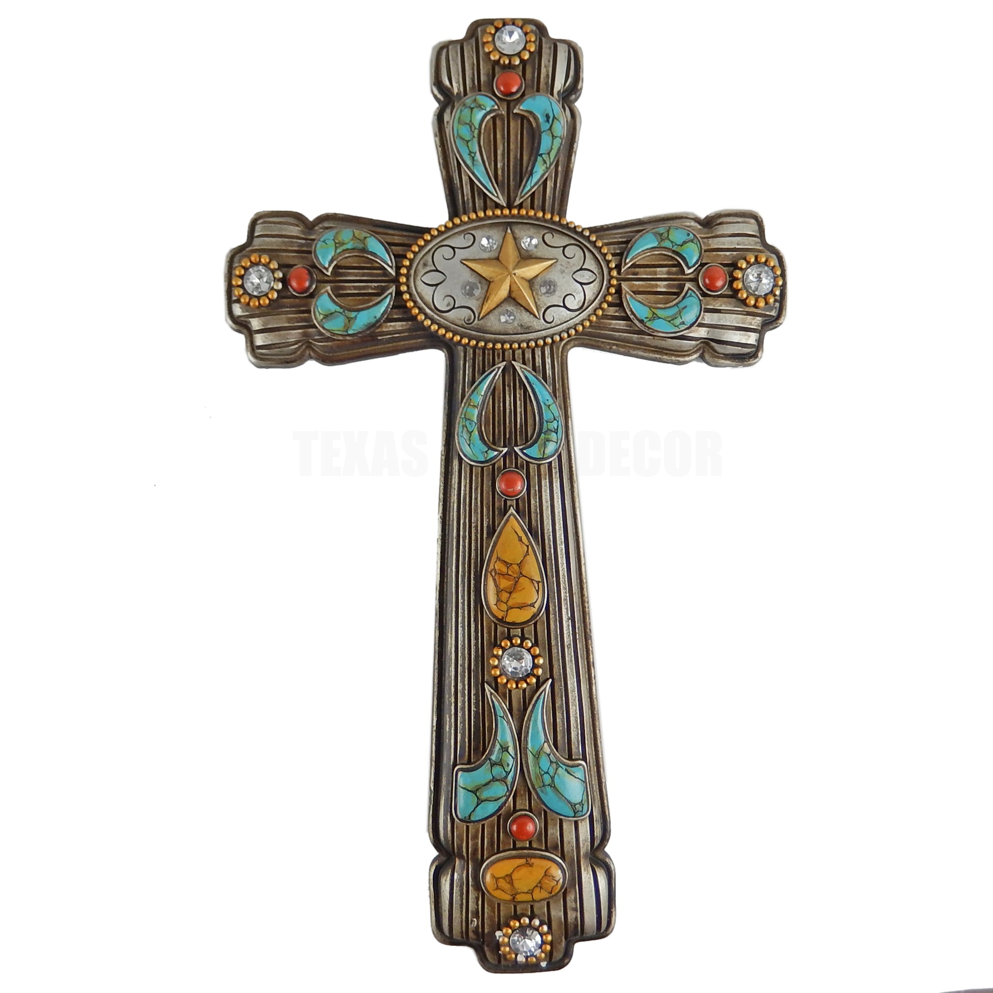 Turquoise Golden Star Decorative Wall Cross Rhinestones Silver Accents Yellow #44269