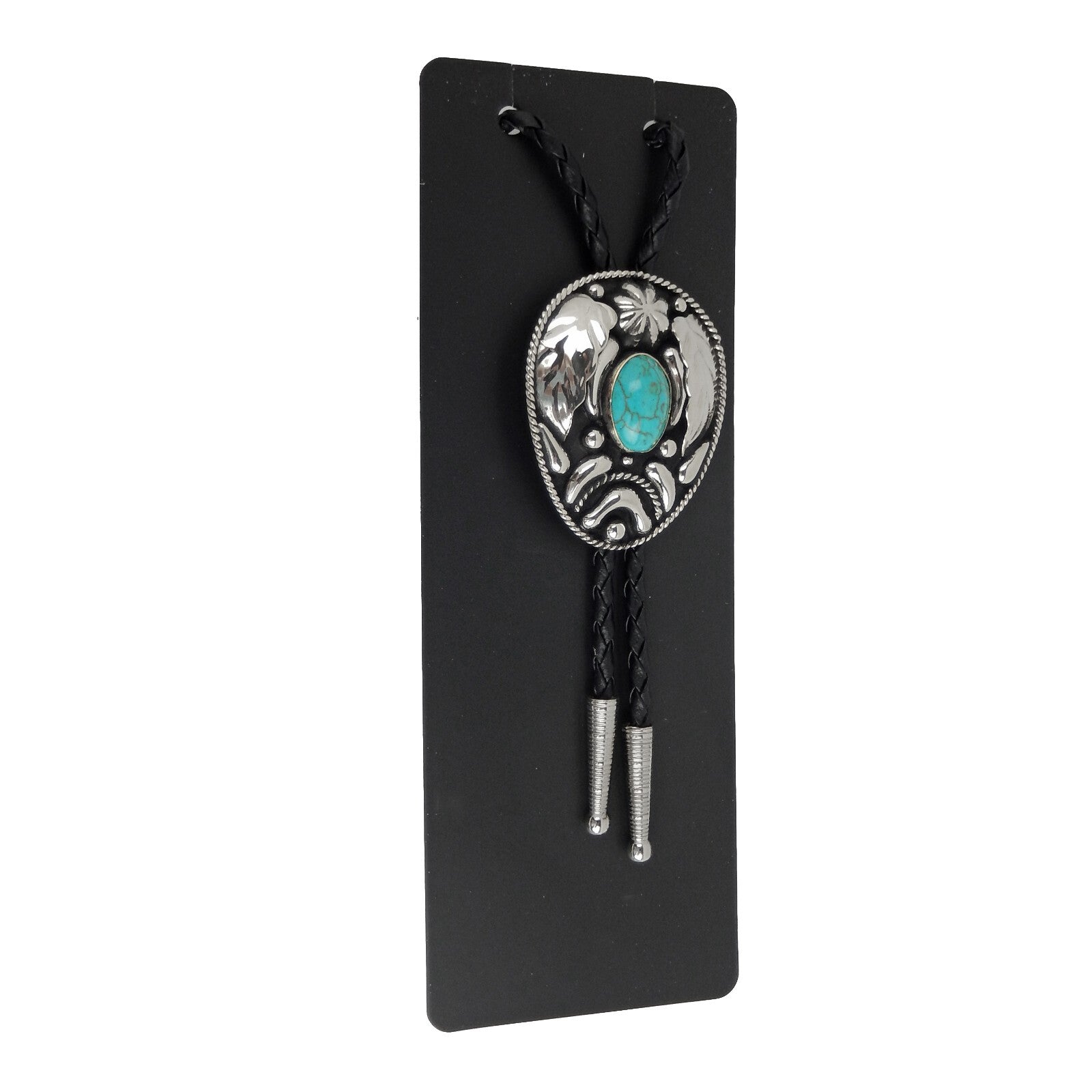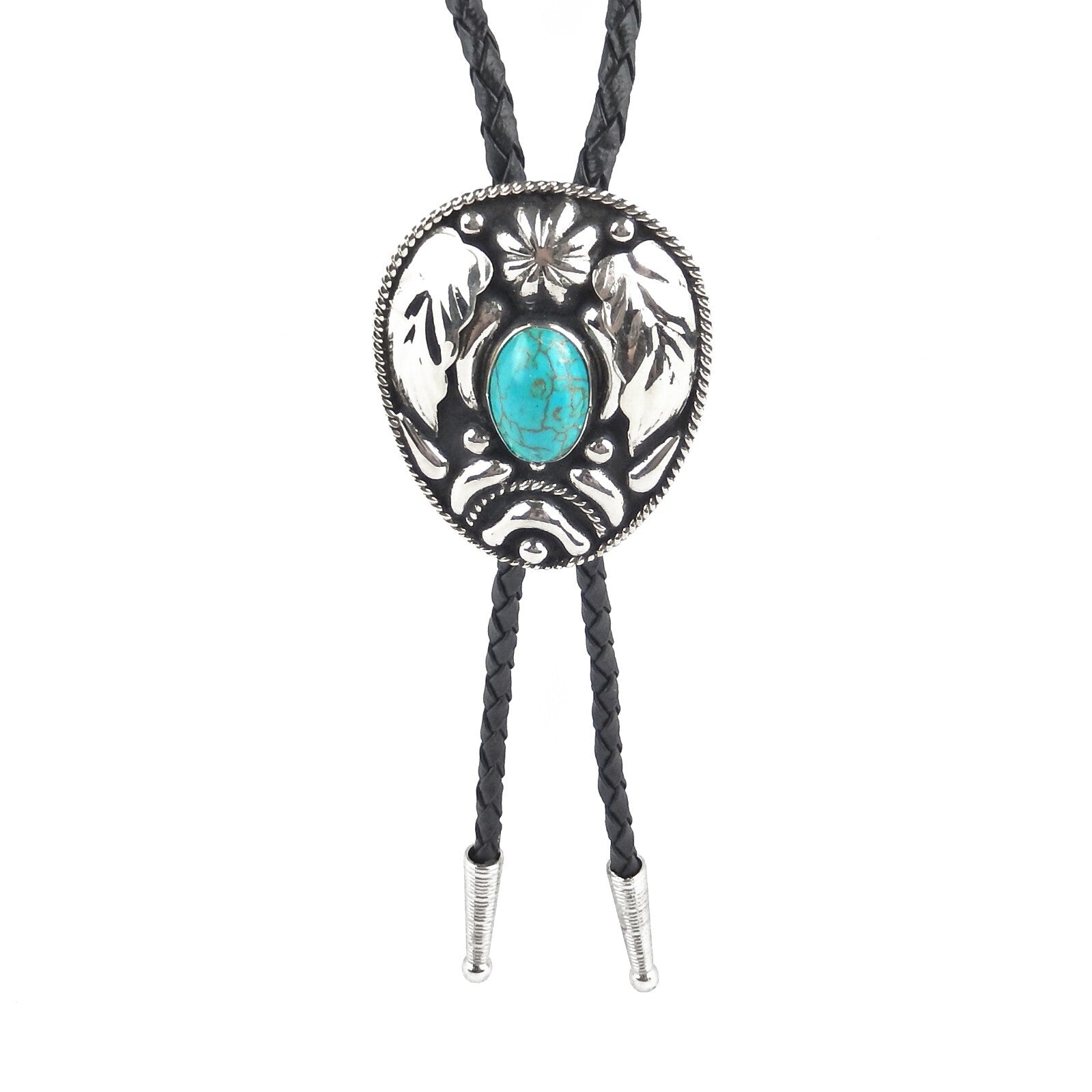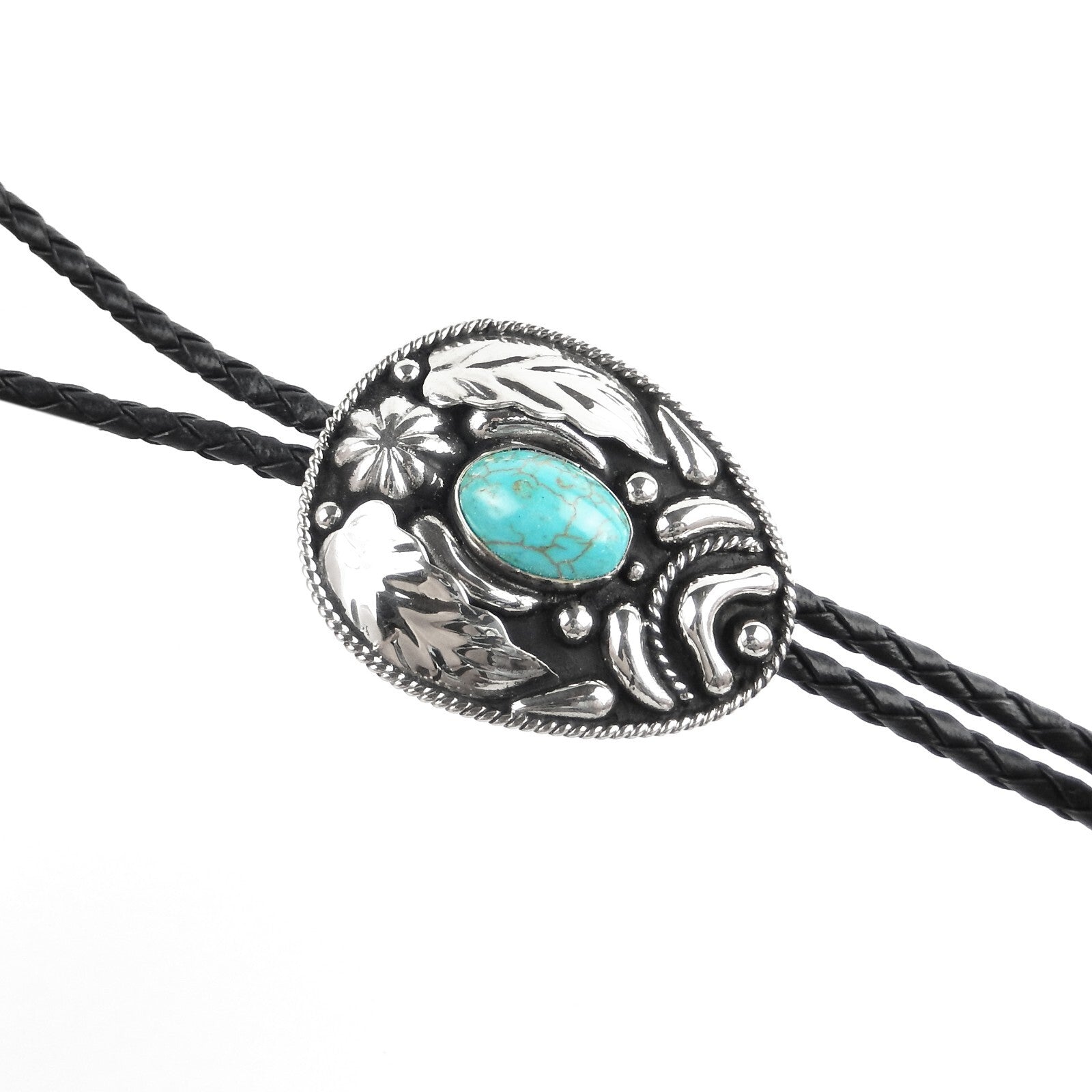 Turquoise Stone Floral Bolo Tie German Silver 36 inch Black Cord Made in USA