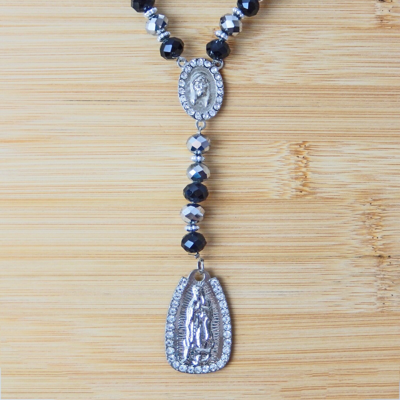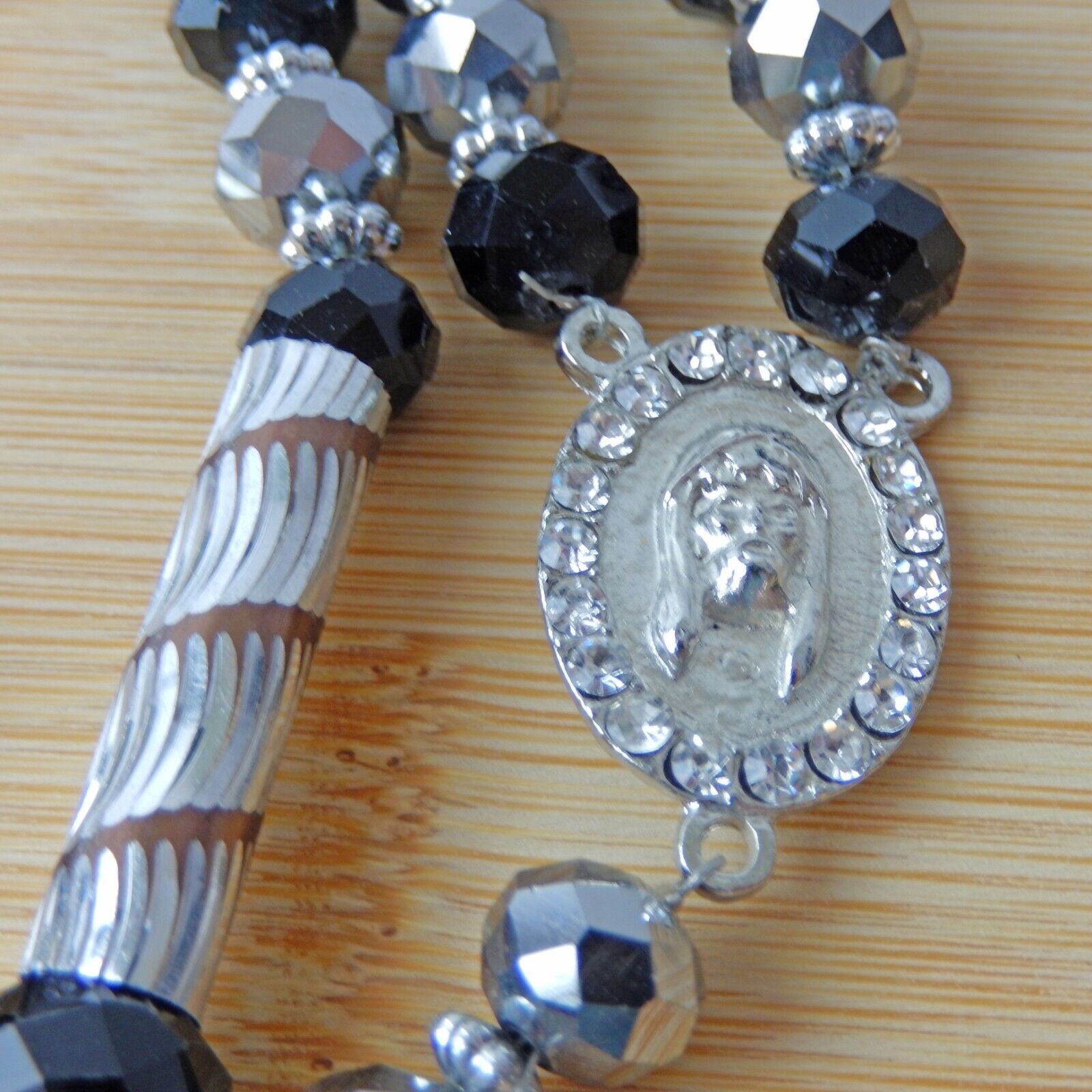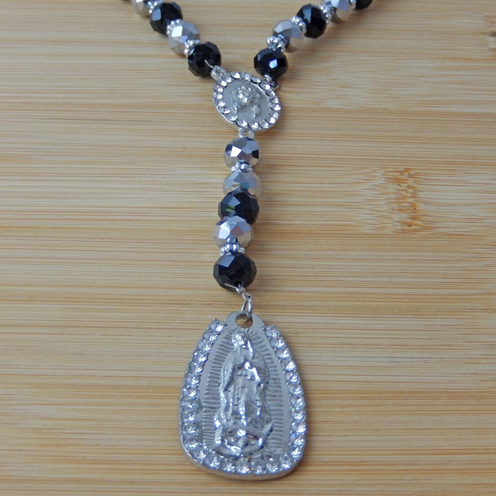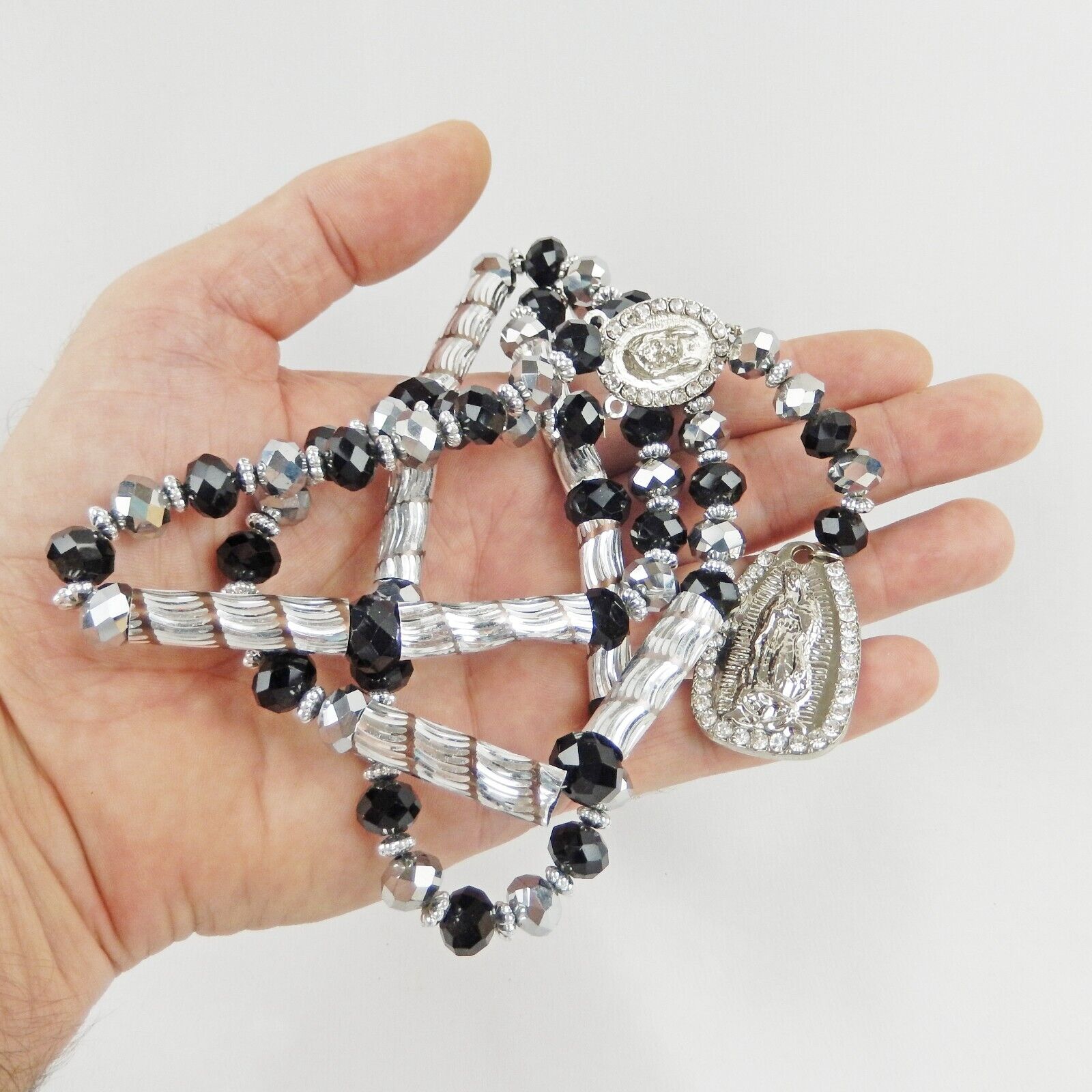 Virgen Mary Christ Pendant Praying Rosary Black And Silver Beads White Stones