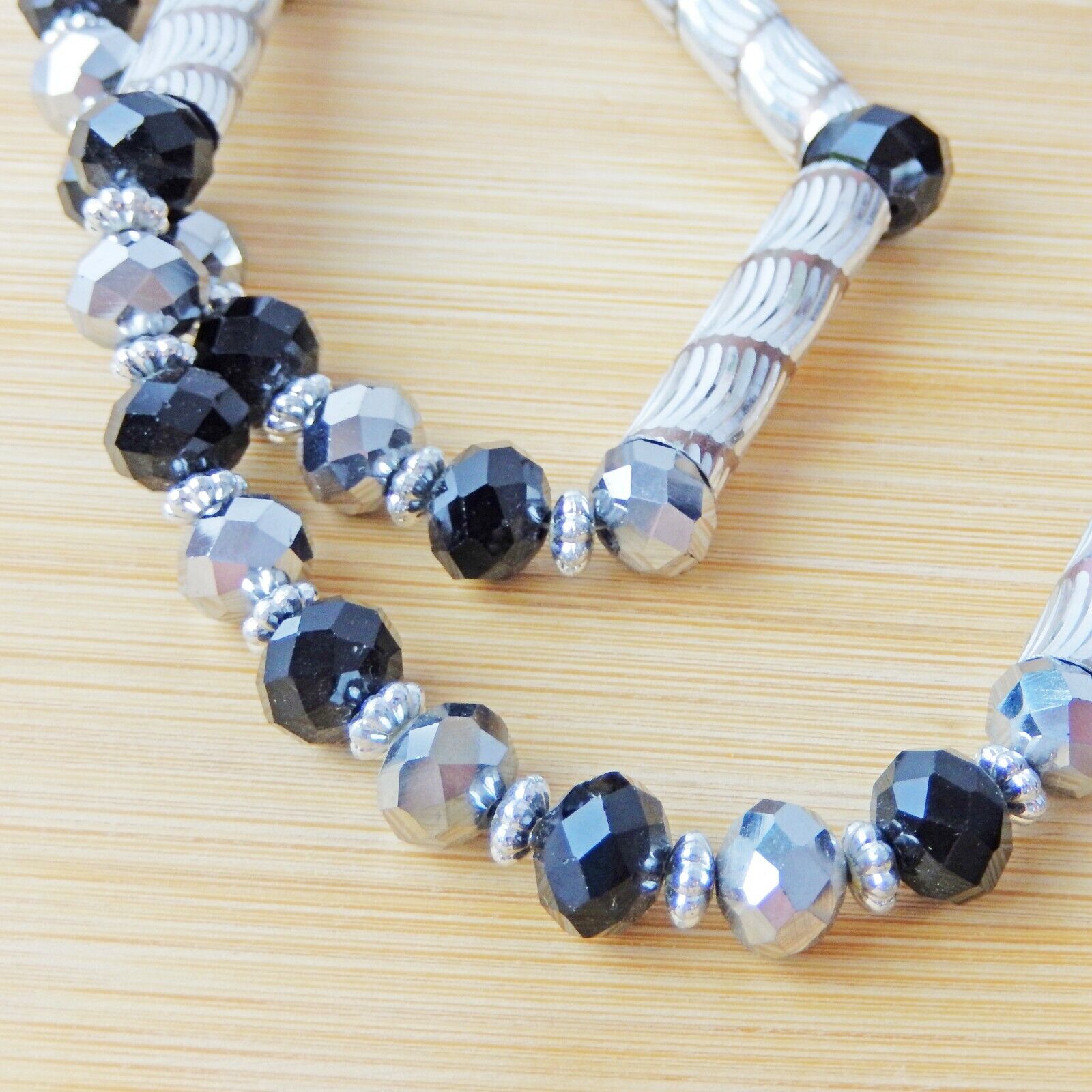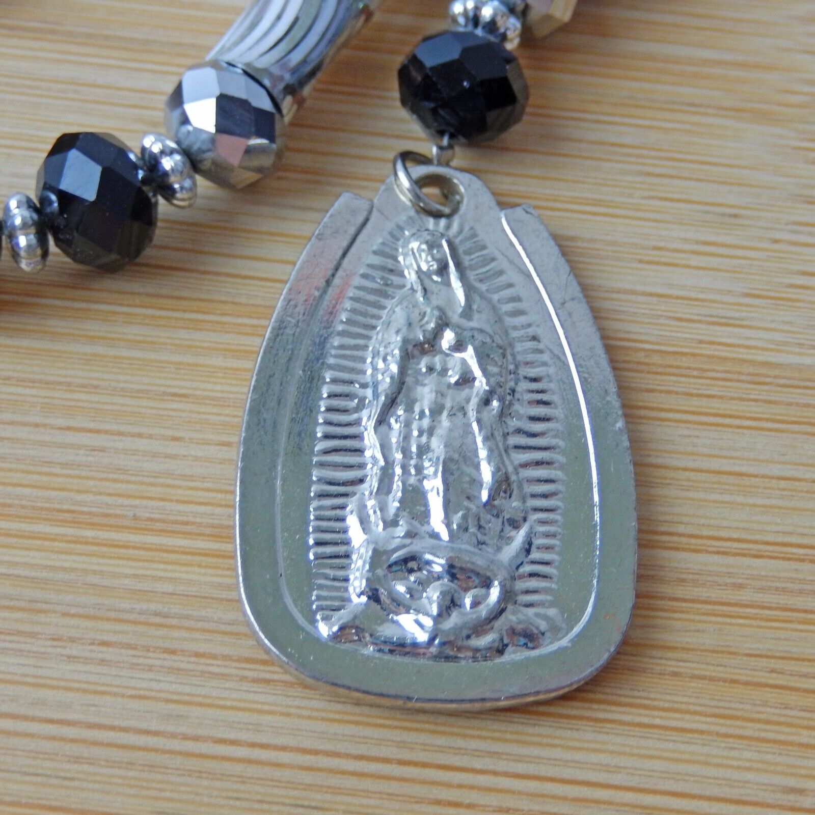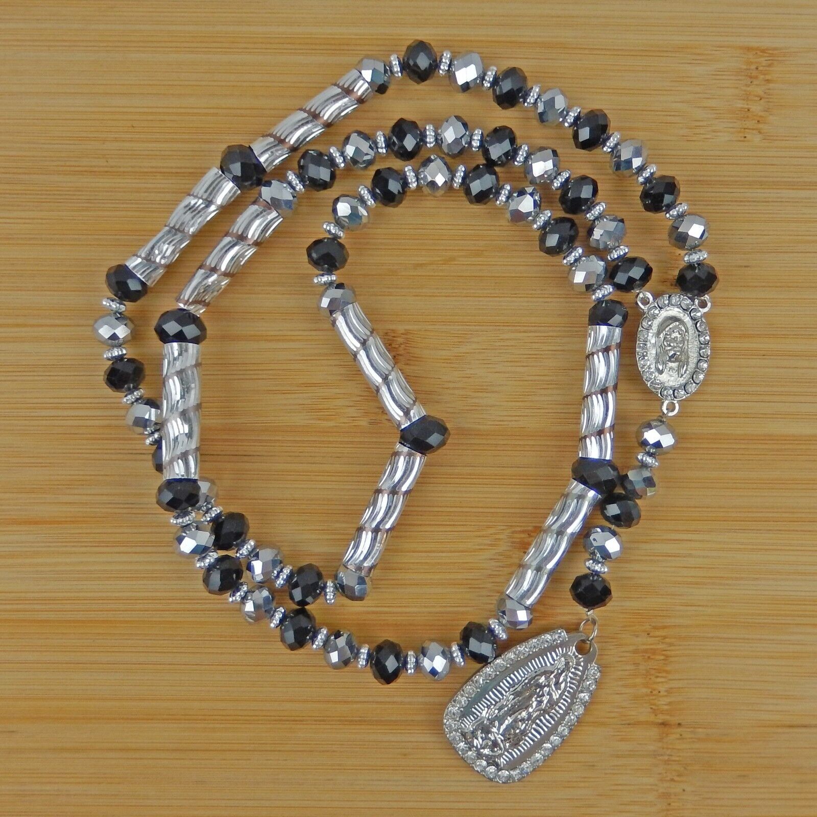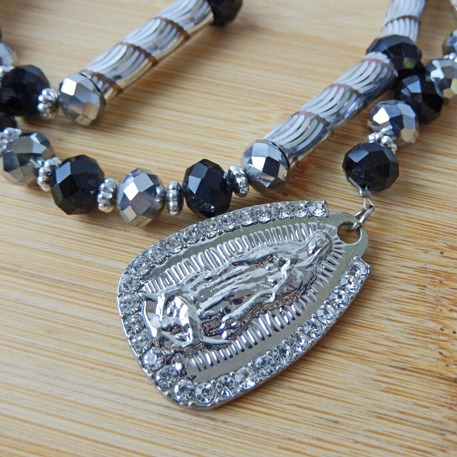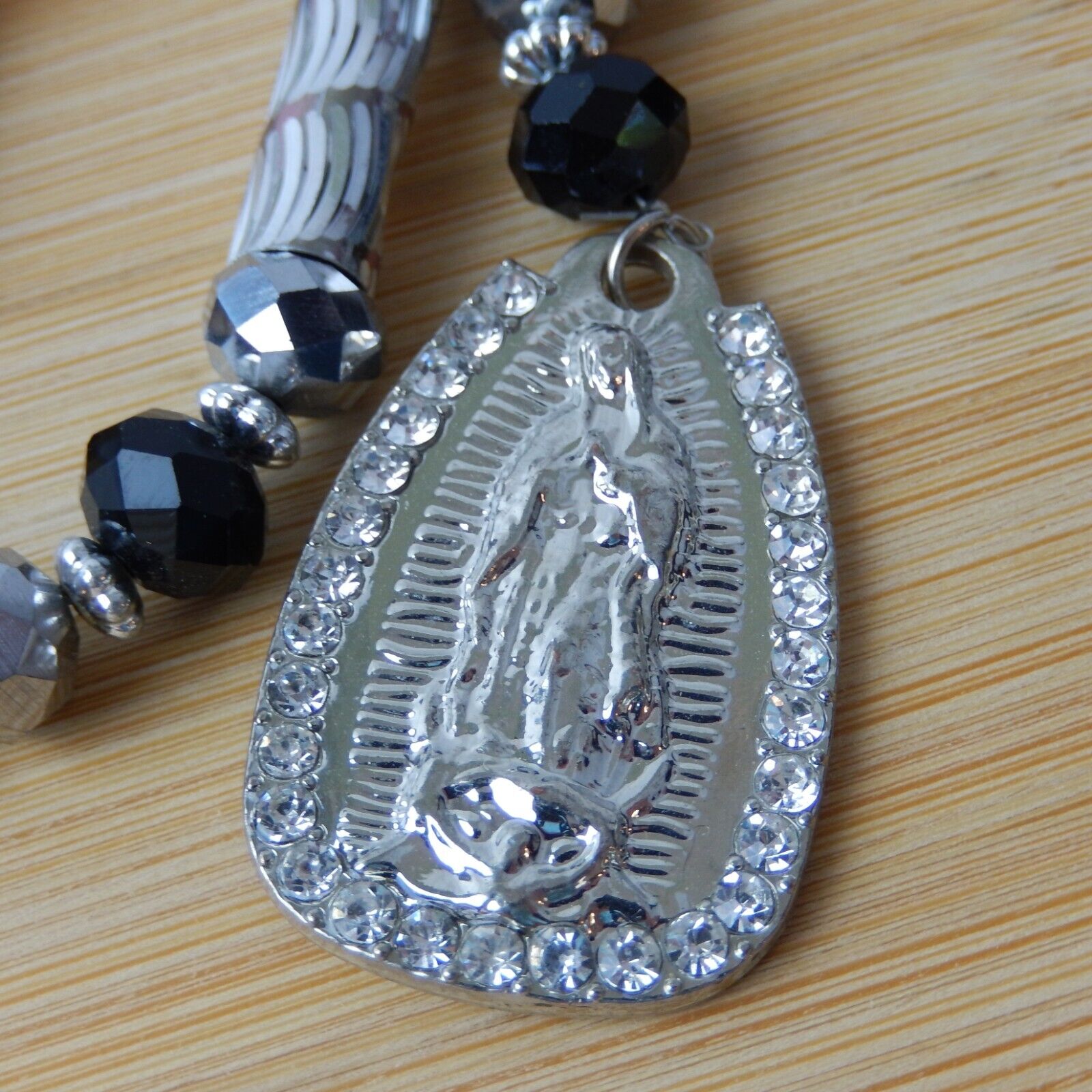 Virgen Mary Christ Pendant Praying Rosary Black And Silver Beads White Stones