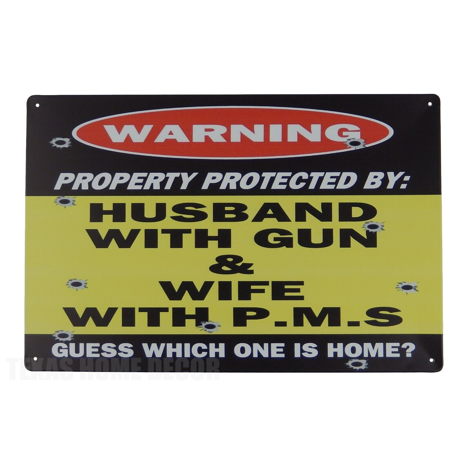 Warning Husband With Gun Wife With P.M.S Humorous Metal Tin Sign 11 3/4 inch